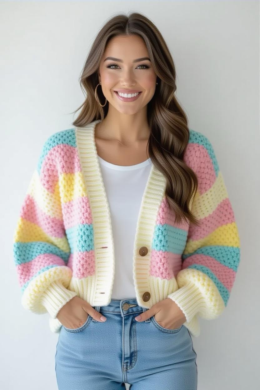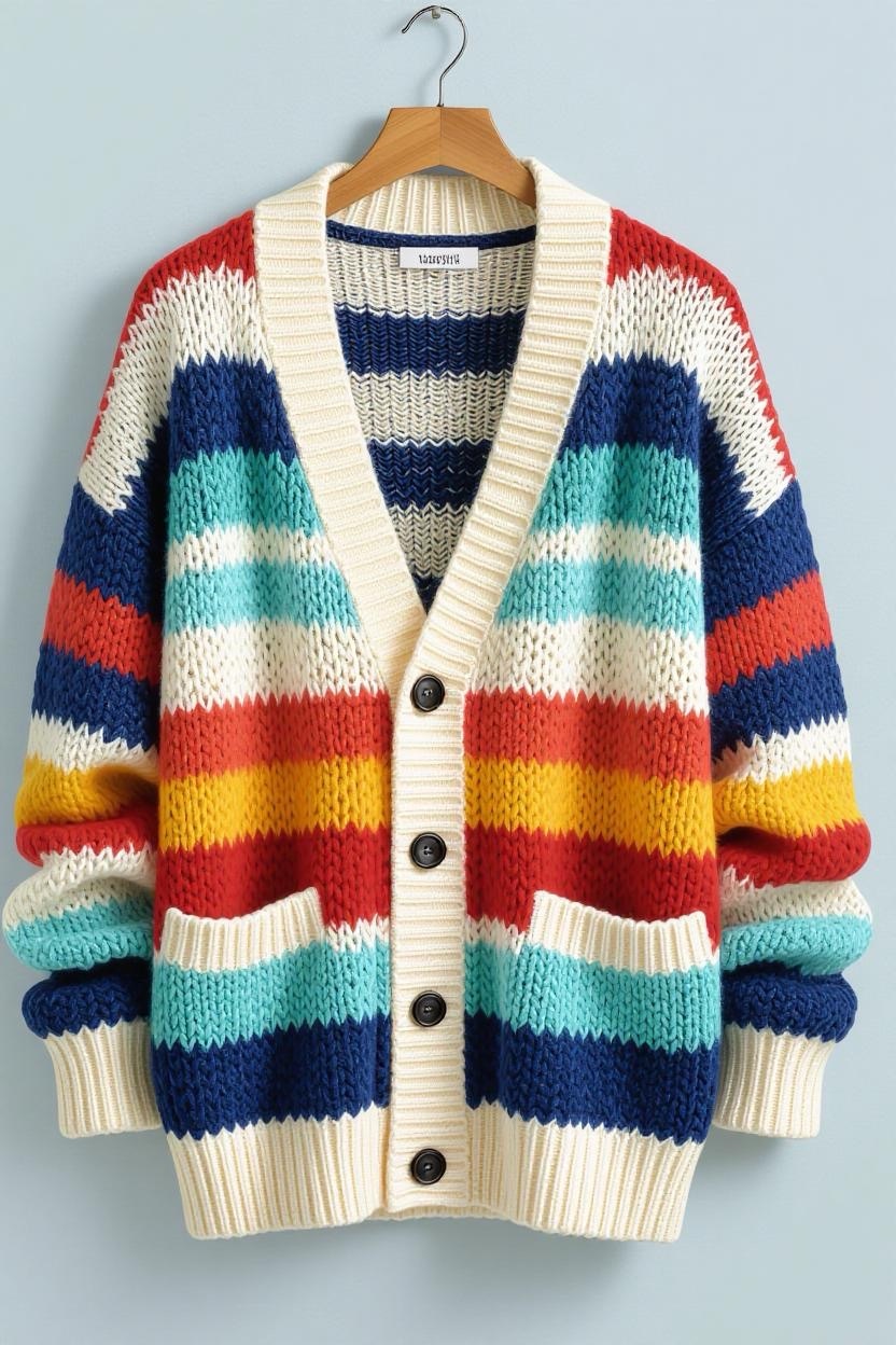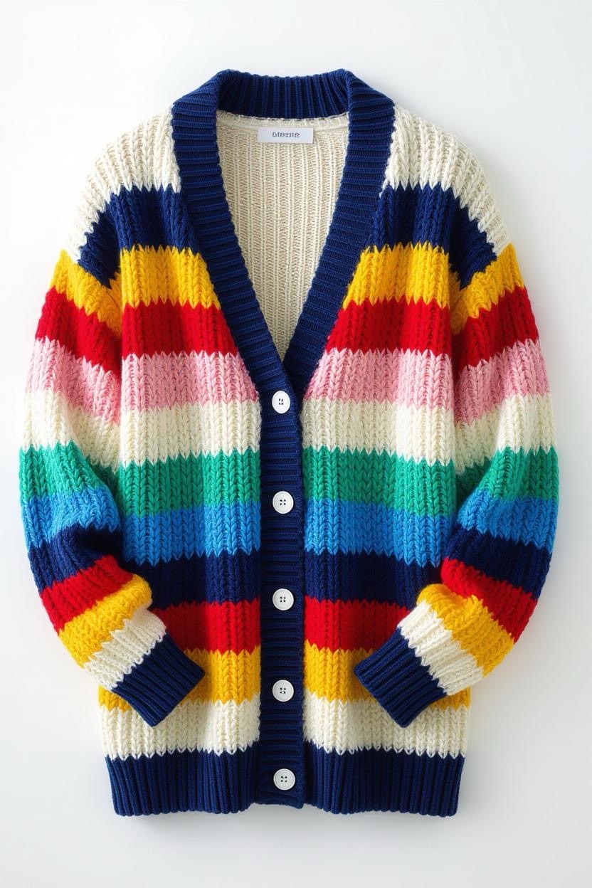 Add color and personality to your wardrobe with a striped cardigan design. The beauty of stripes is that you can play around with different color combinations, bold contrasts, subtle gradients, or pastel mixes. It’s the perfect weekend wear for relaxed, easygoing vibes.