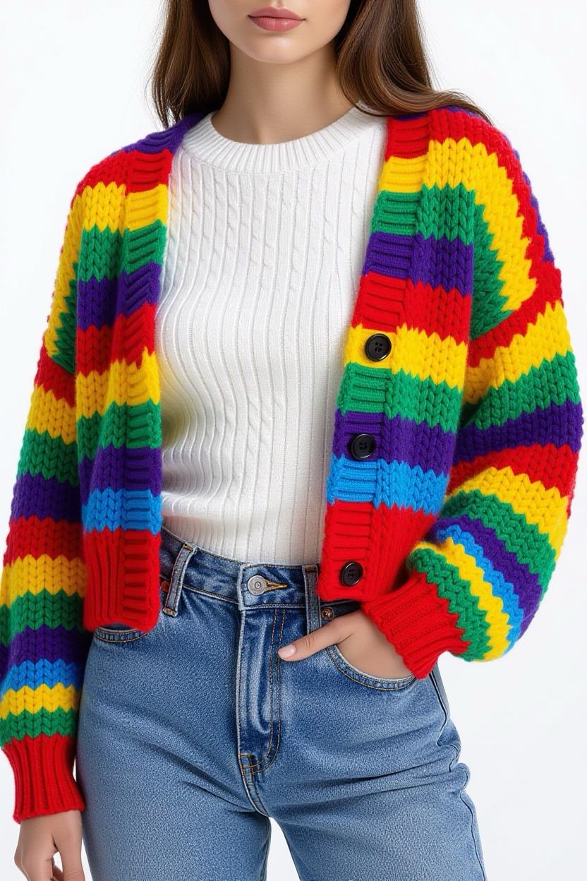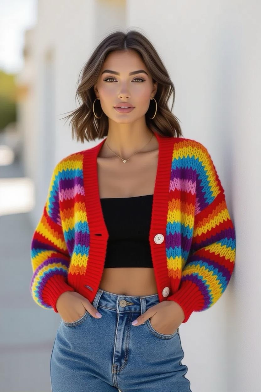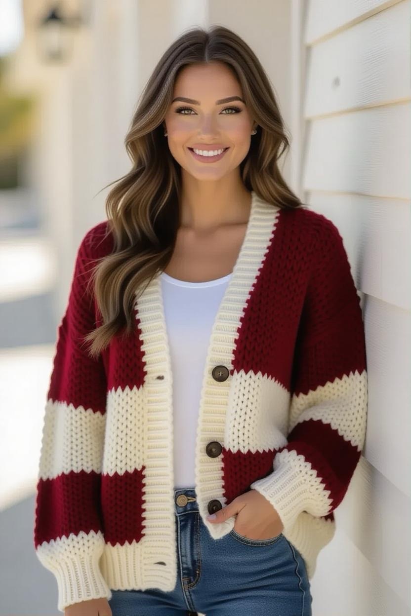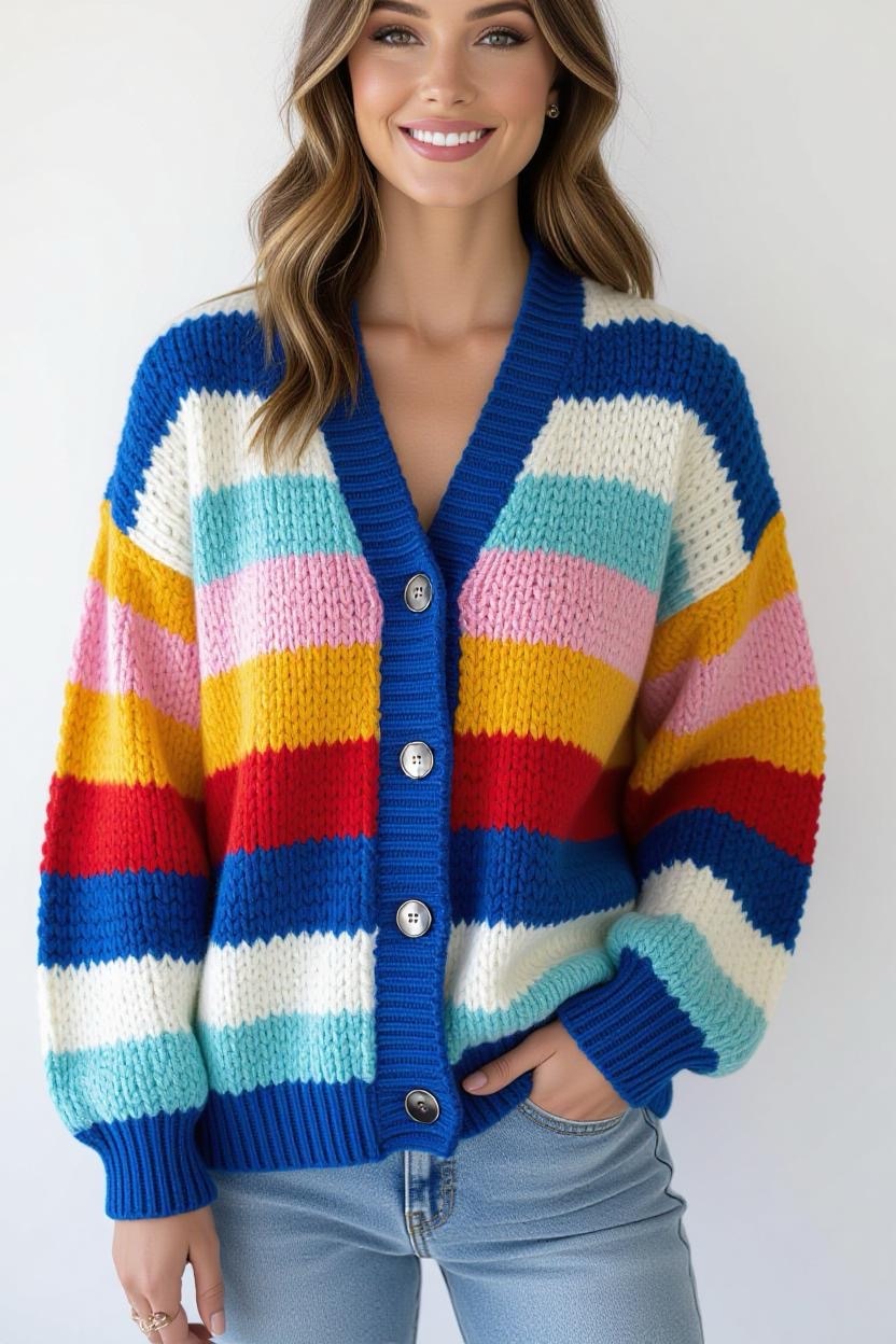 Add color and personality to your wardrobe with a striped cardigan design. The beauty of stripes is that you can play around with different color combinations, bold contrasts, subtle gradients, or pastel mixes. It’s the perfect weekend wear for relaxed, easygoing vibes.