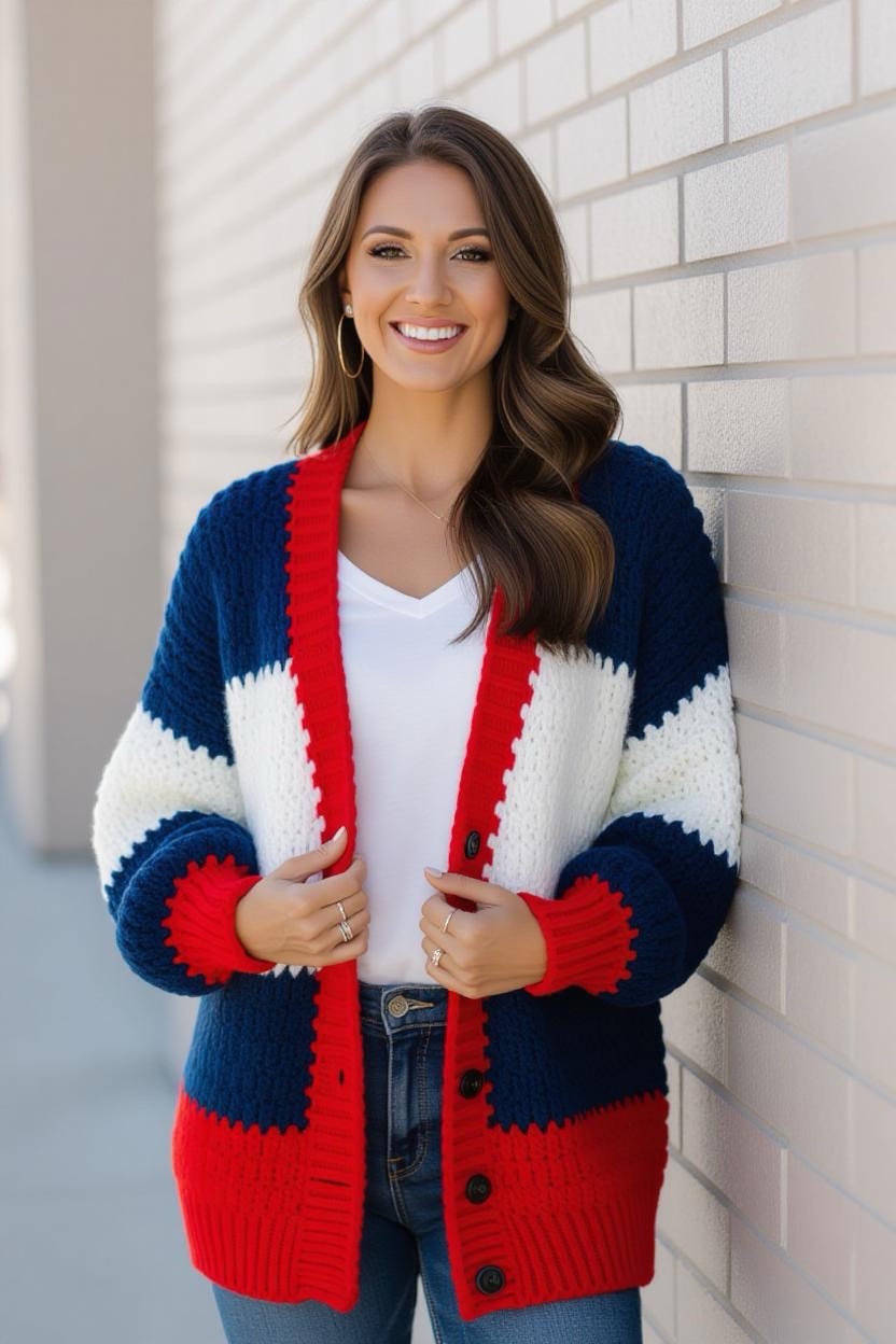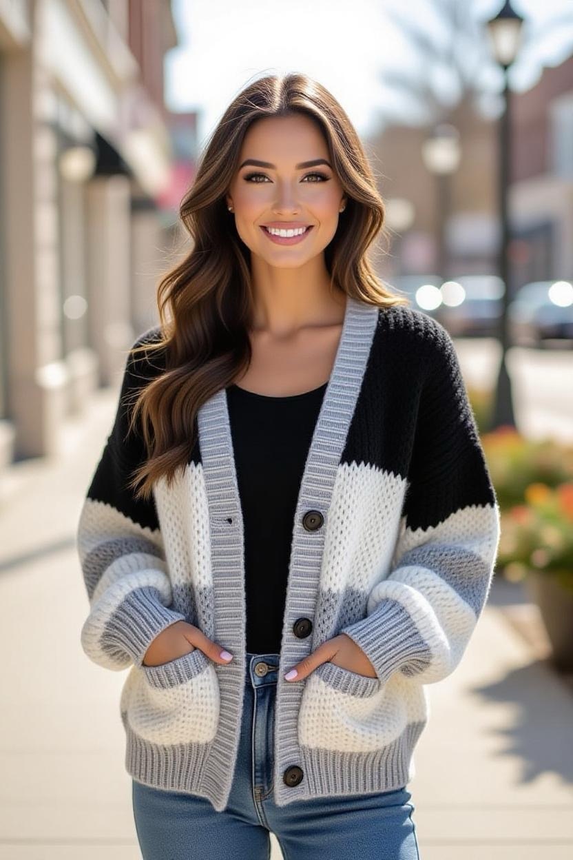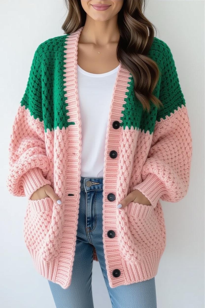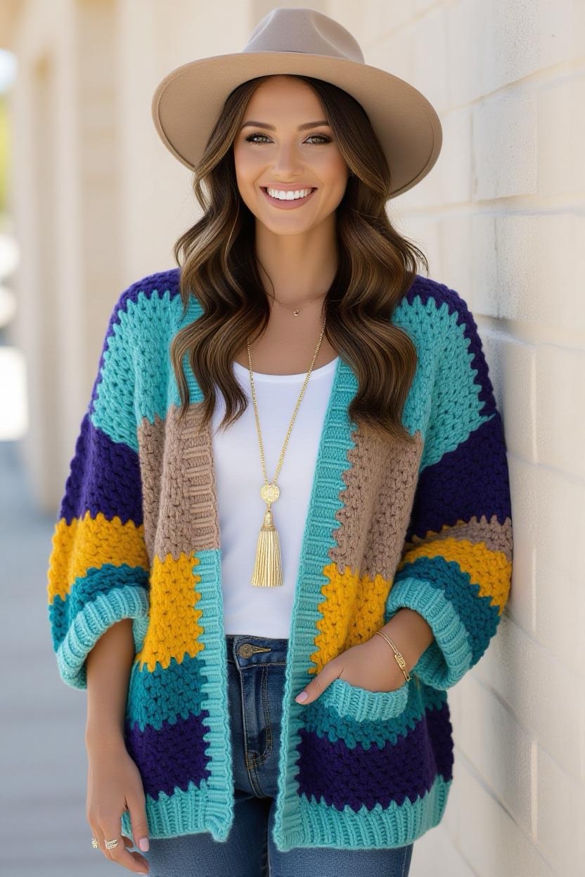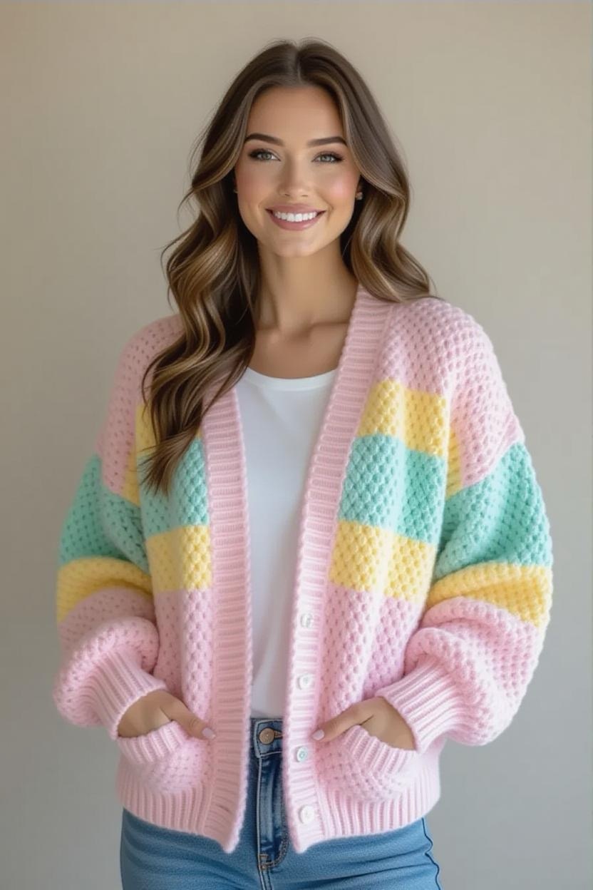 Make a bold fashion statement with a color block design. Combining two or three contrasting shades, this cardigan is both trendy and fun. It’s an excellent way to experiment with your favorite color palettes while still creating a wearable piece.