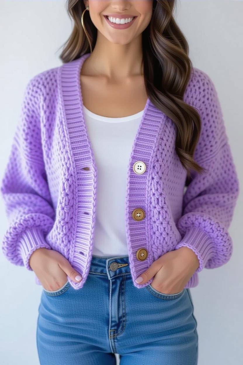 If you prefer structure, a button-up crochet cardigan is the way to go. Adding buttons makes the cardigan versatile, you can wear it open or closed depending on the occasion. Go for classic pearl-style buttons for a chic look or wood buttons for a rustic touch.
