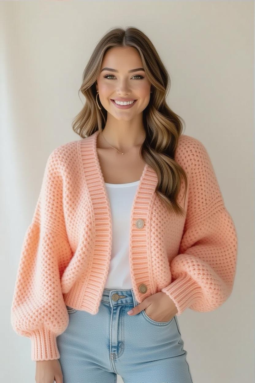 Short, chic, and trendy, the cropped cardigan is ideal for pairing with high-waisted jeans, skirts, or dresses. It’s a versatile design that works equally well in casual and dressy outfits. Choose vibrant yarn colors to give your cardigan a playful touch.