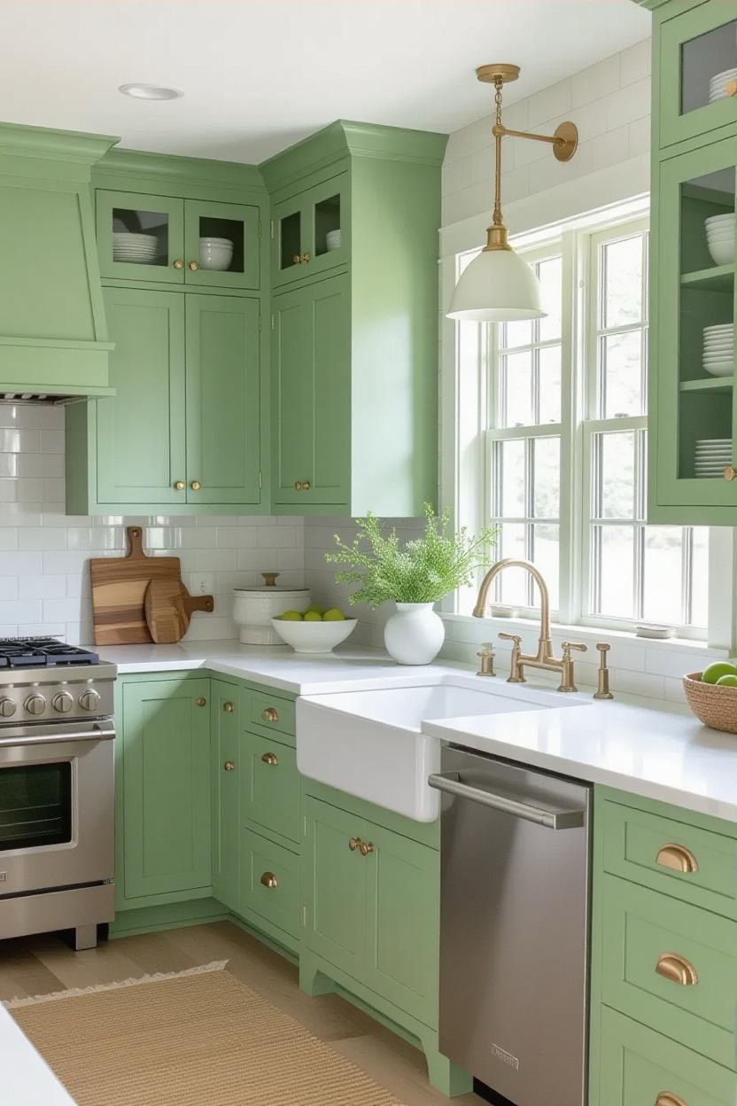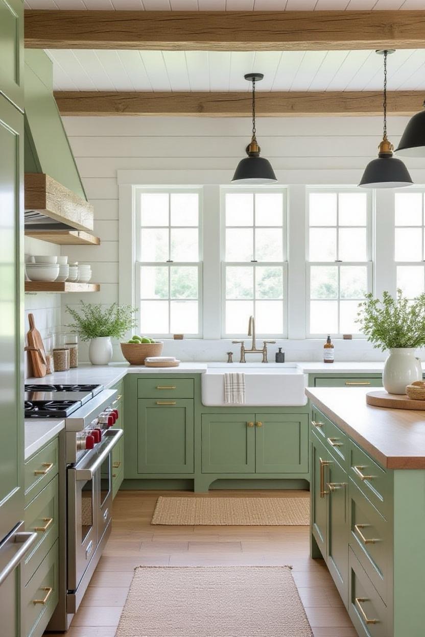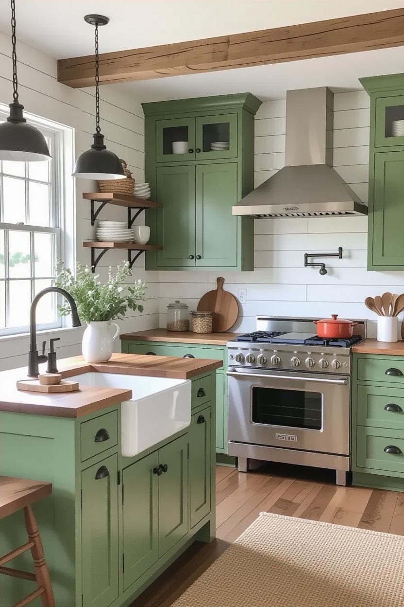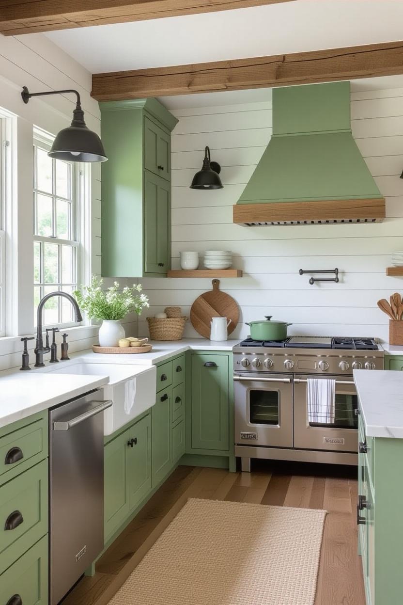 Combine sage green cabinets with shiplap walls and barn-style lighting for a cozy farmhouse kitchen with a fresh twist.