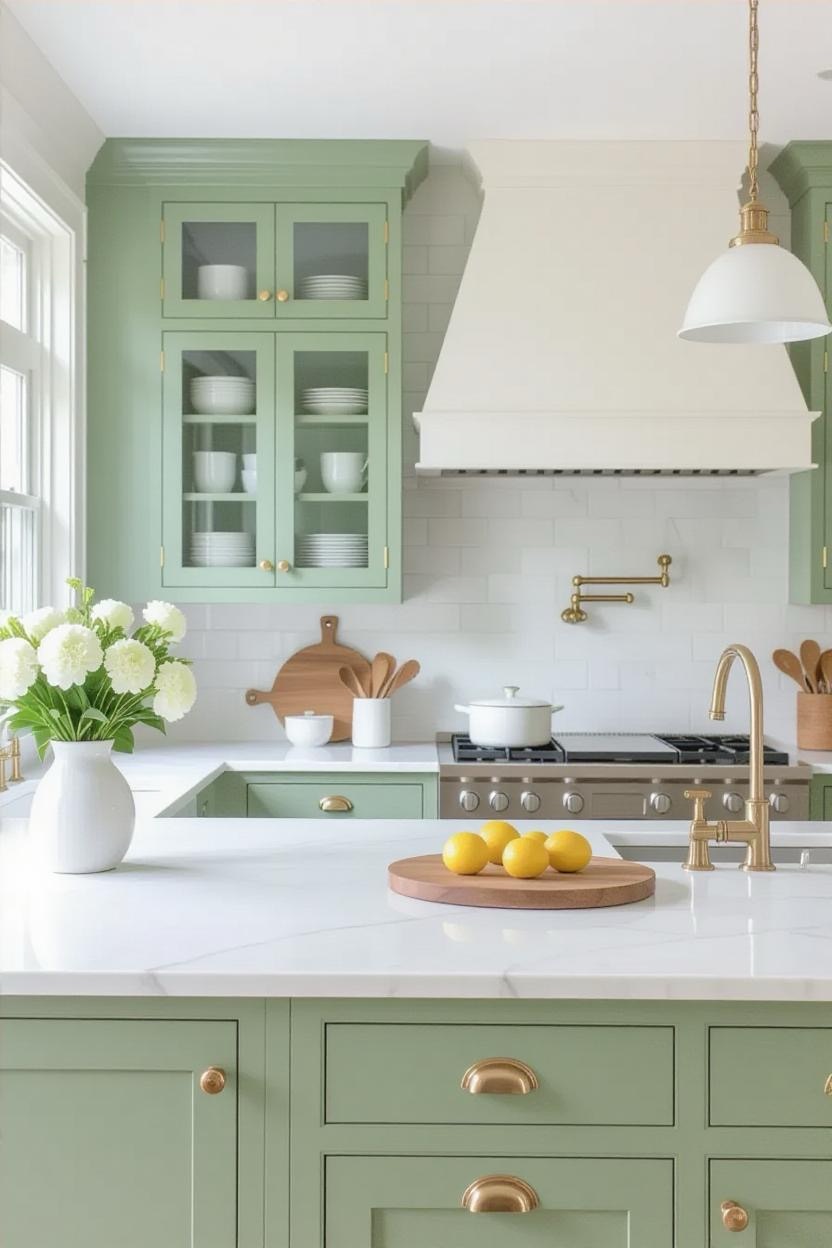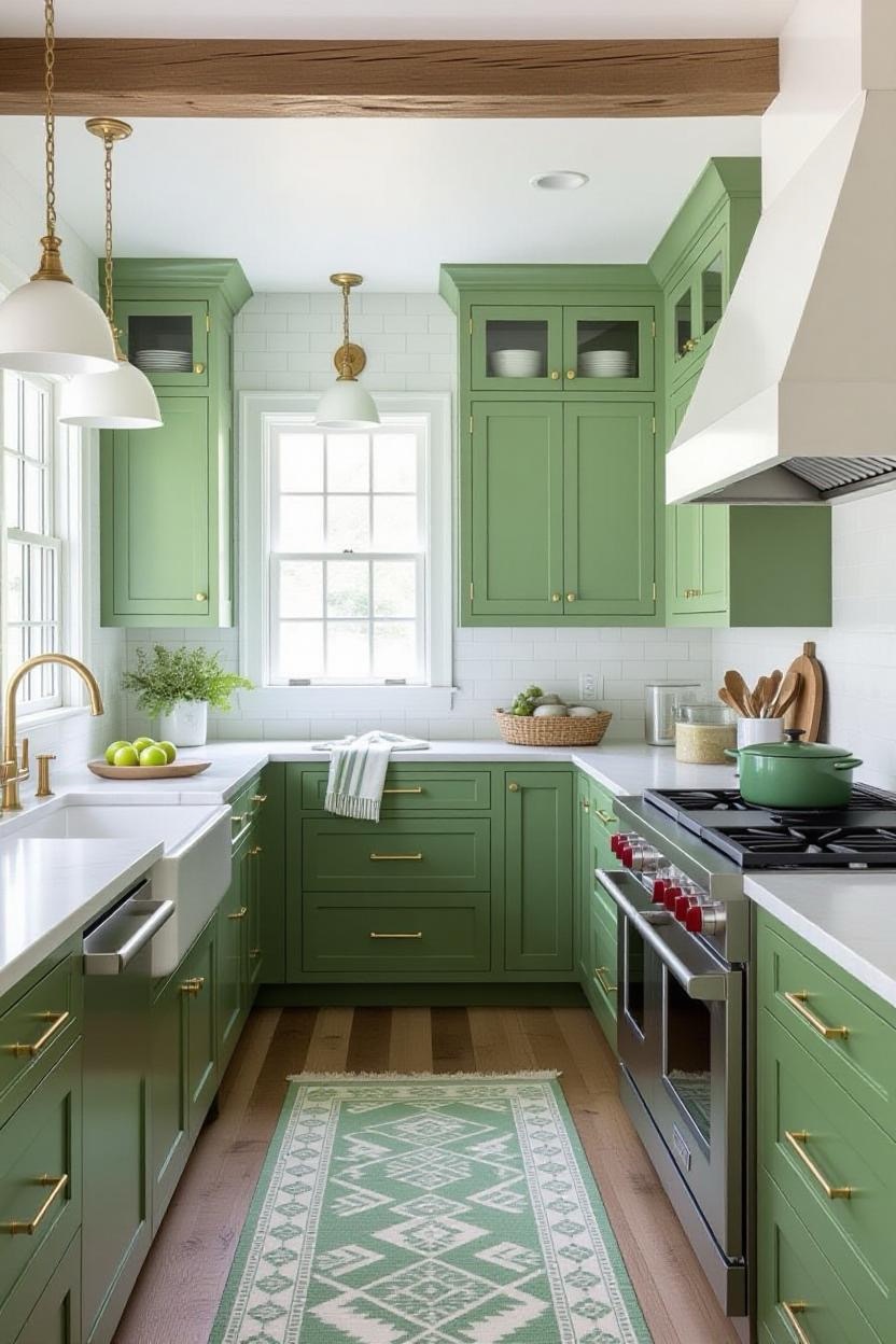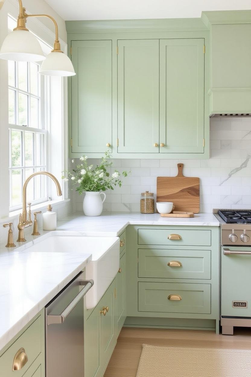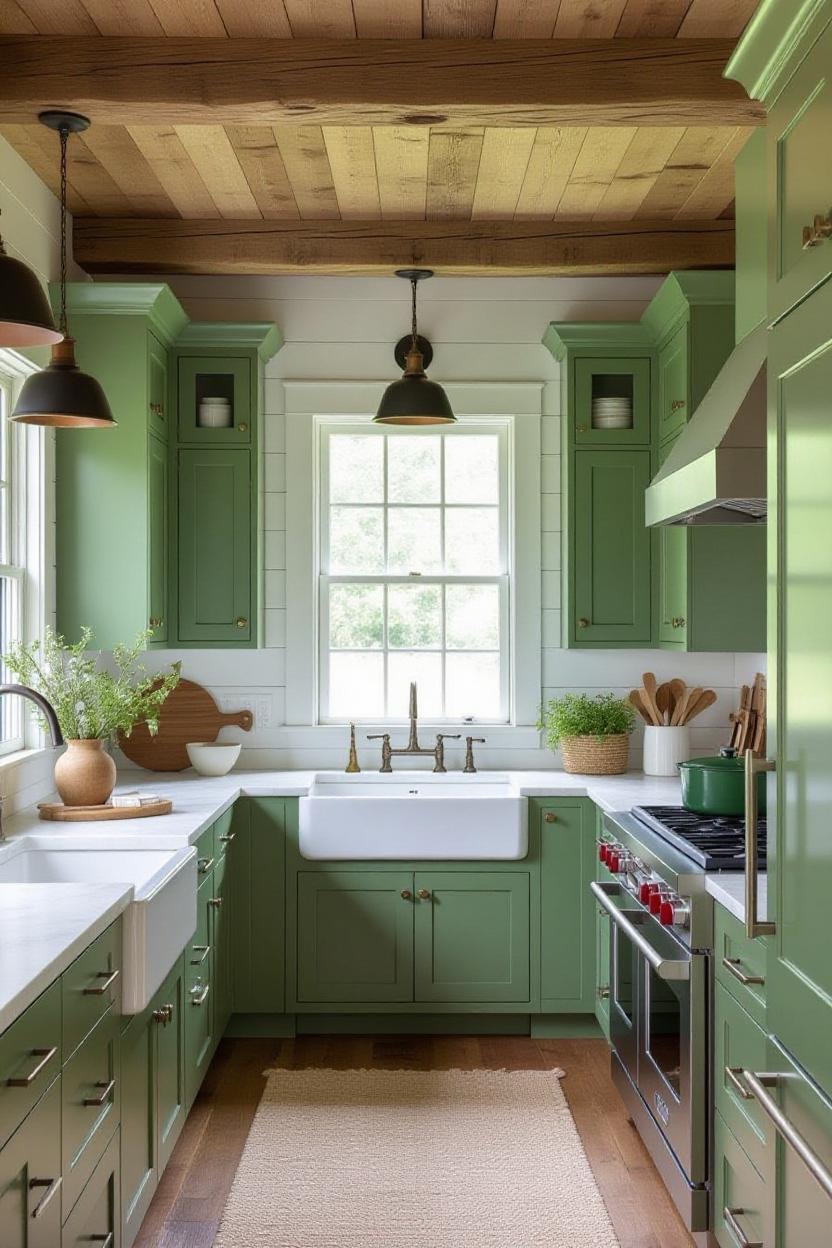 Combine sage green cabinets with shiplap walls and barn-style lighting for a cozy farmhouse kitchen with a fresh twist.