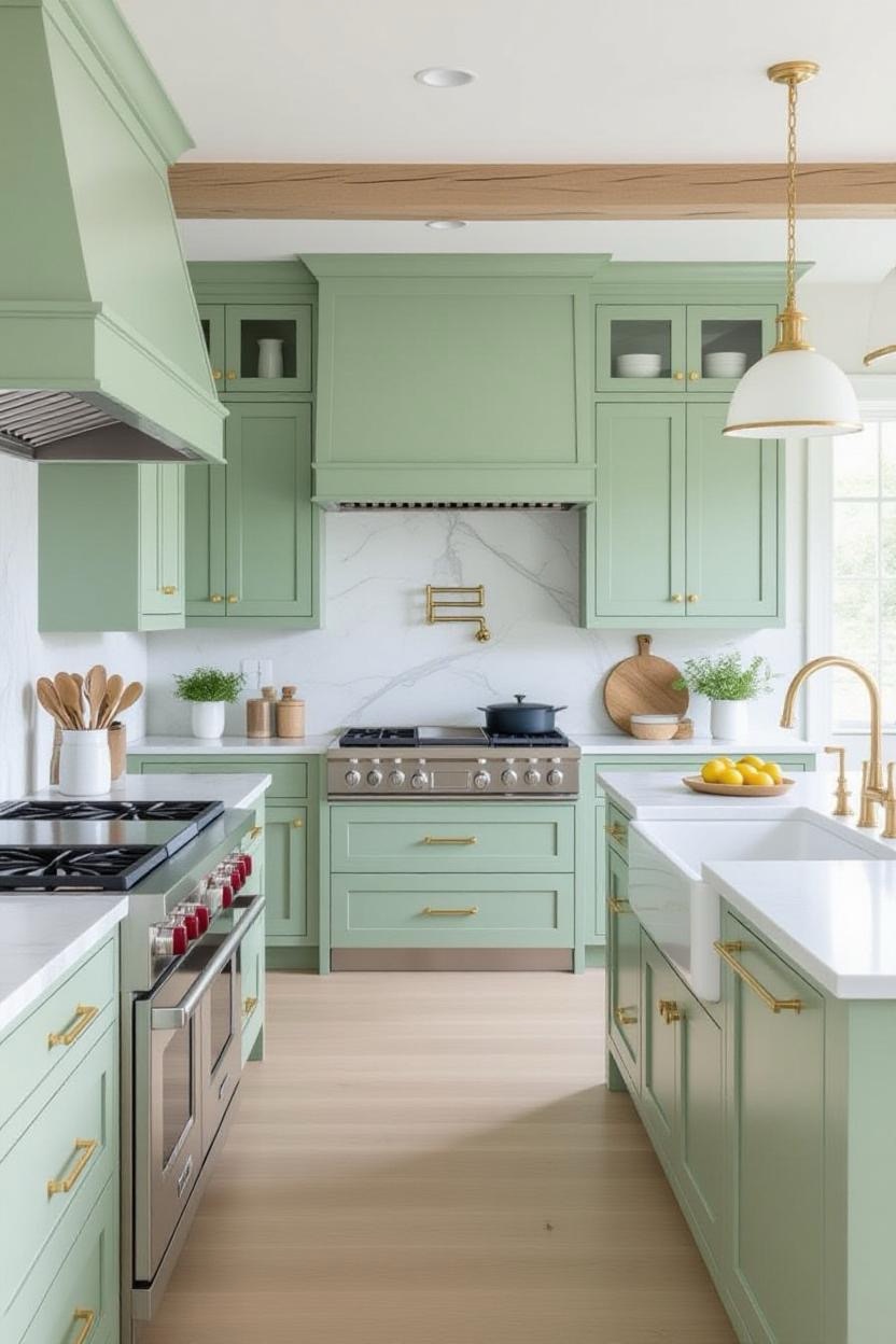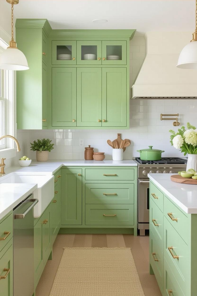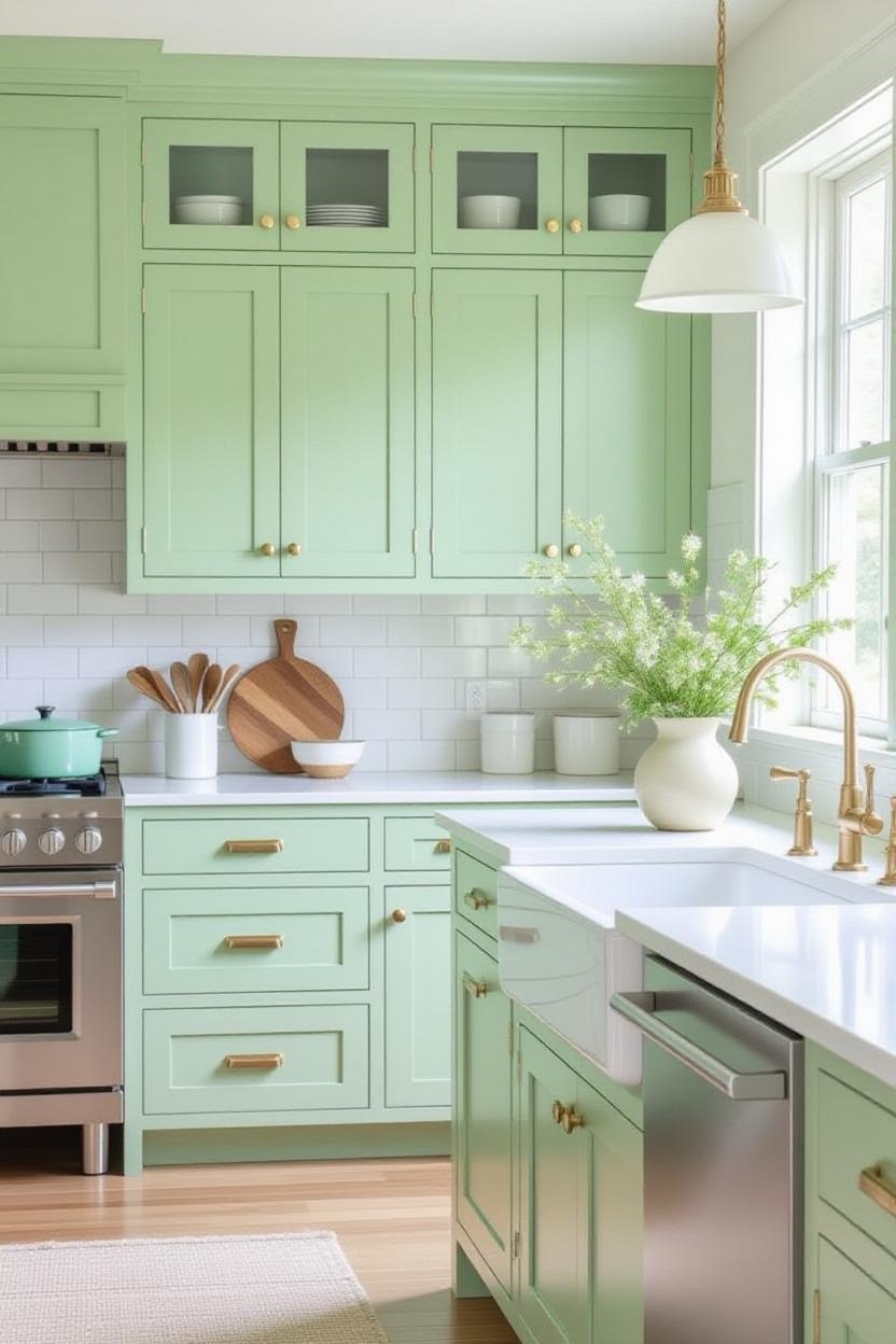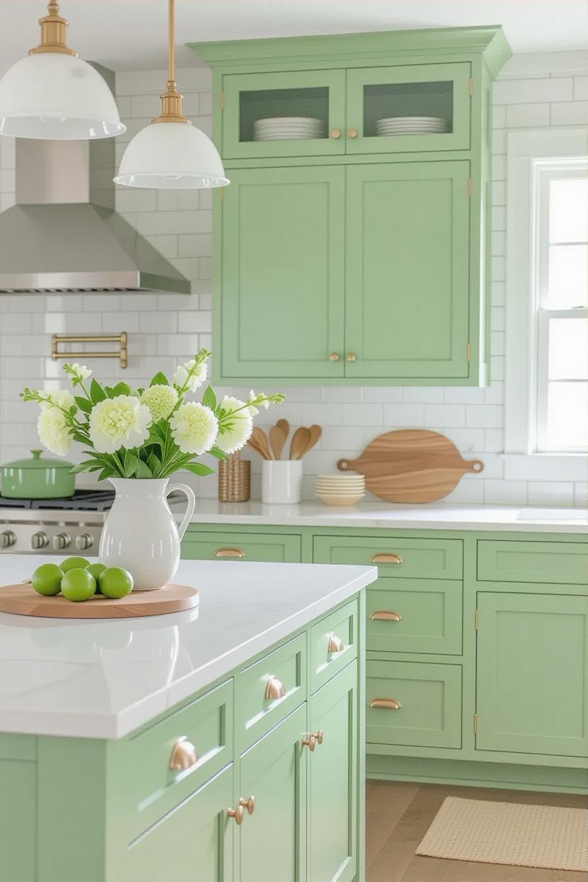 Pistachio green cabinets paired with creamy countertops give your kitchen a light and cheerful vibe, perfect for spring-inspired décor.
