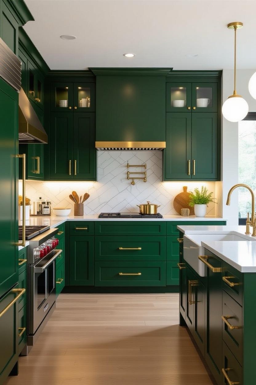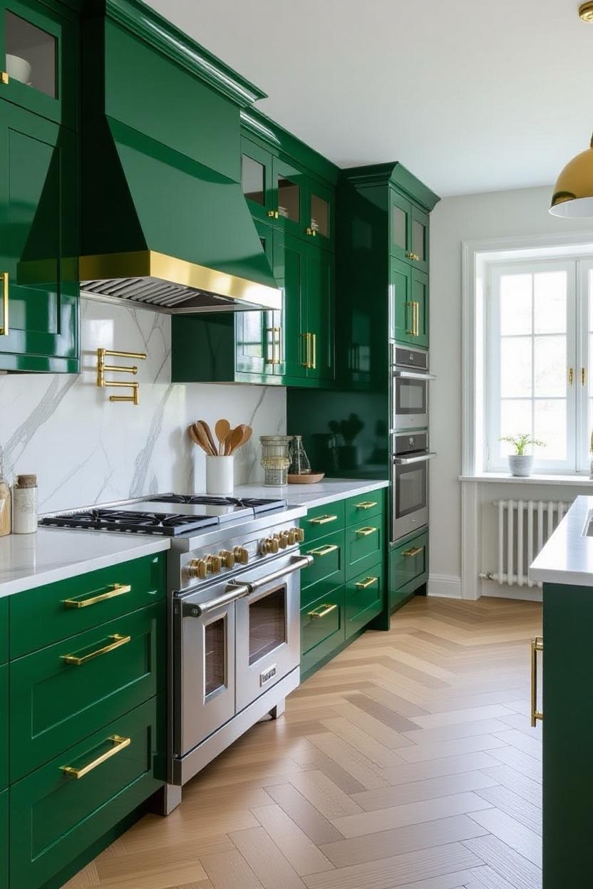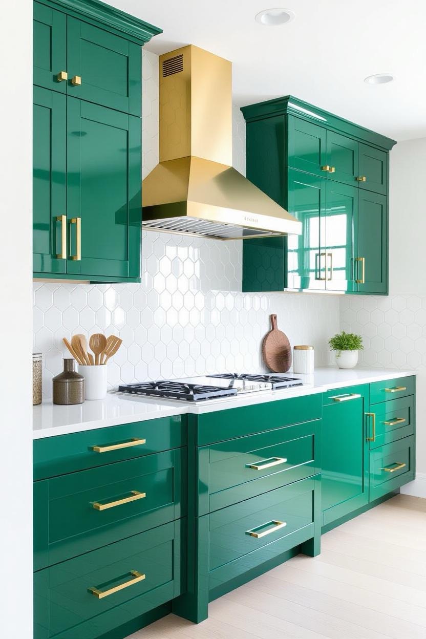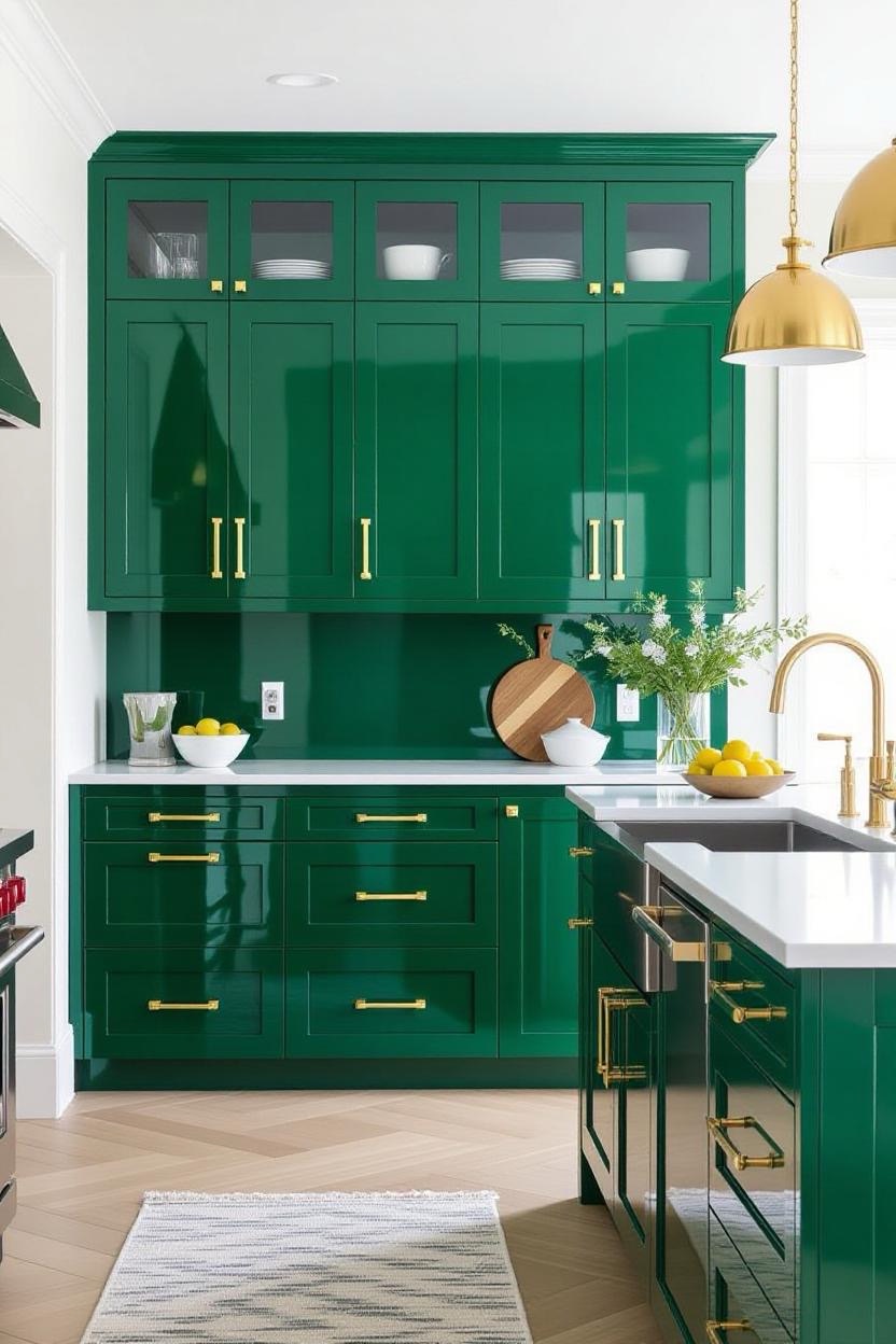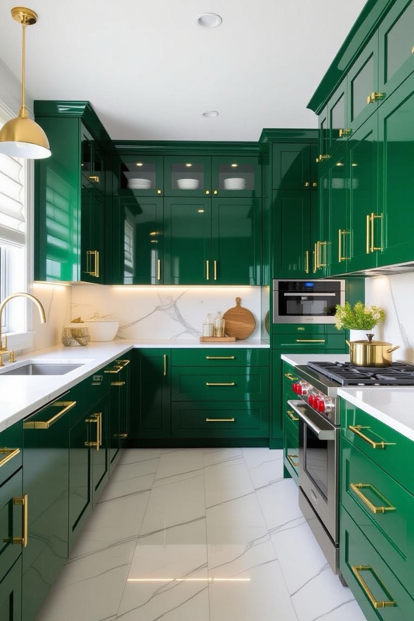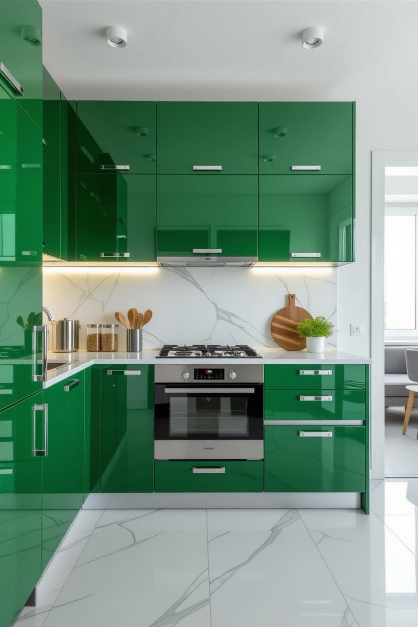 Go for high-gloss emerald green cabinets with gold handles for a dramatic yet elegant statement. This works beautifully in both modern and luxurious kitchen designs.