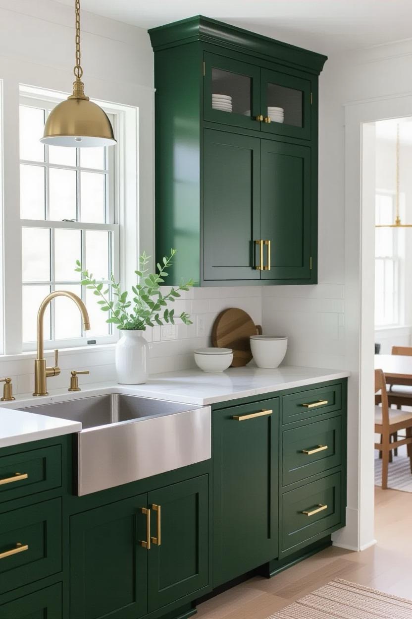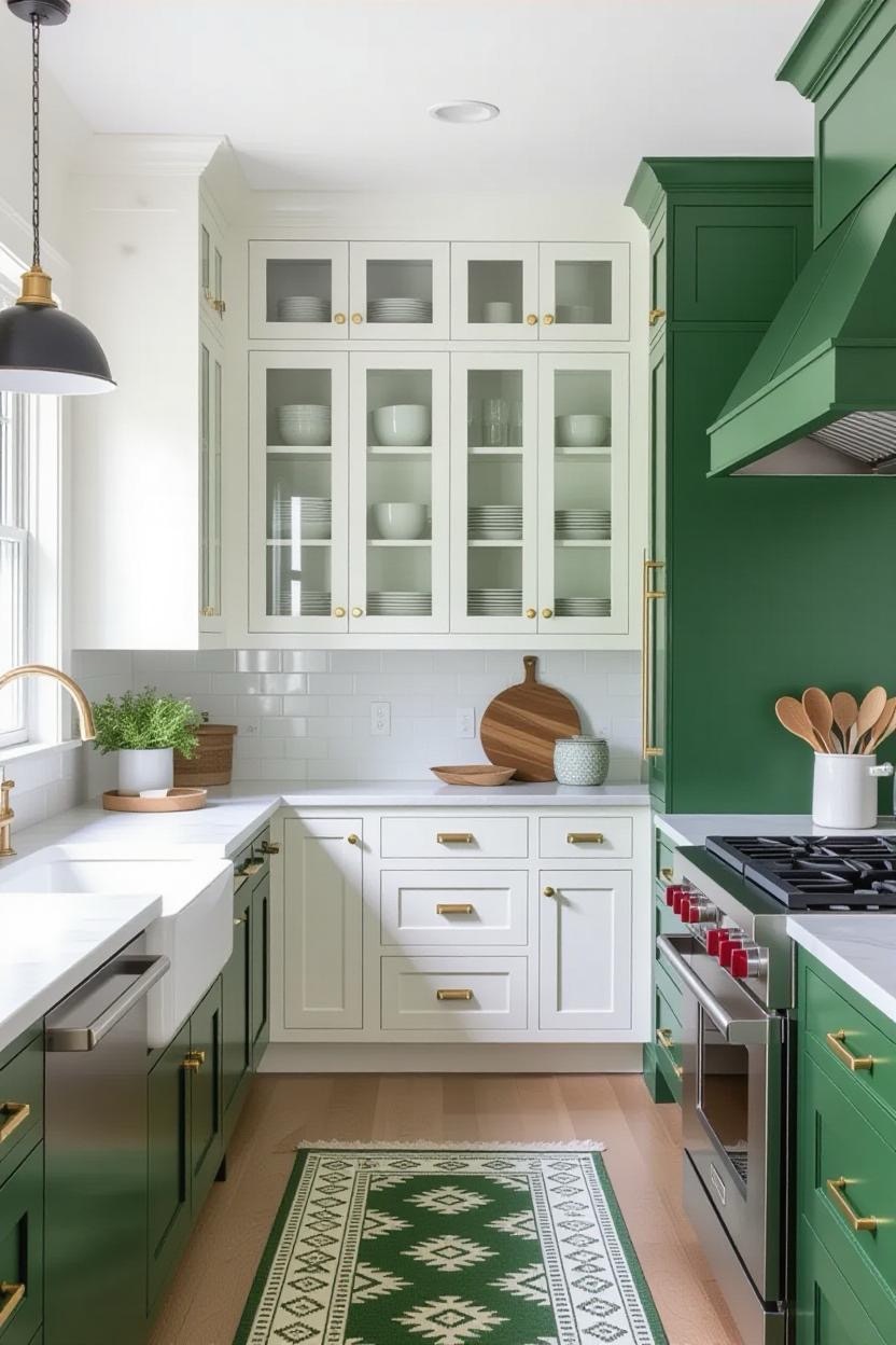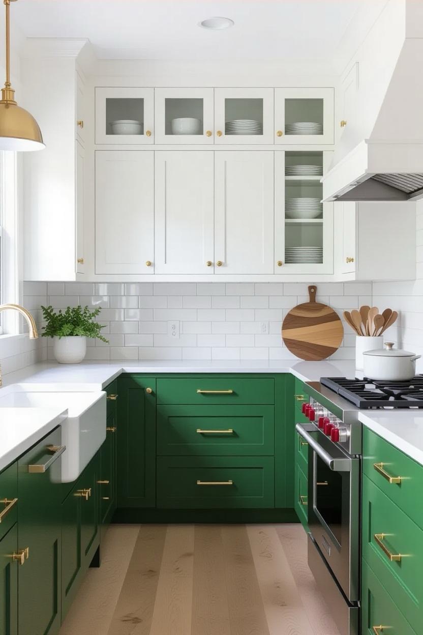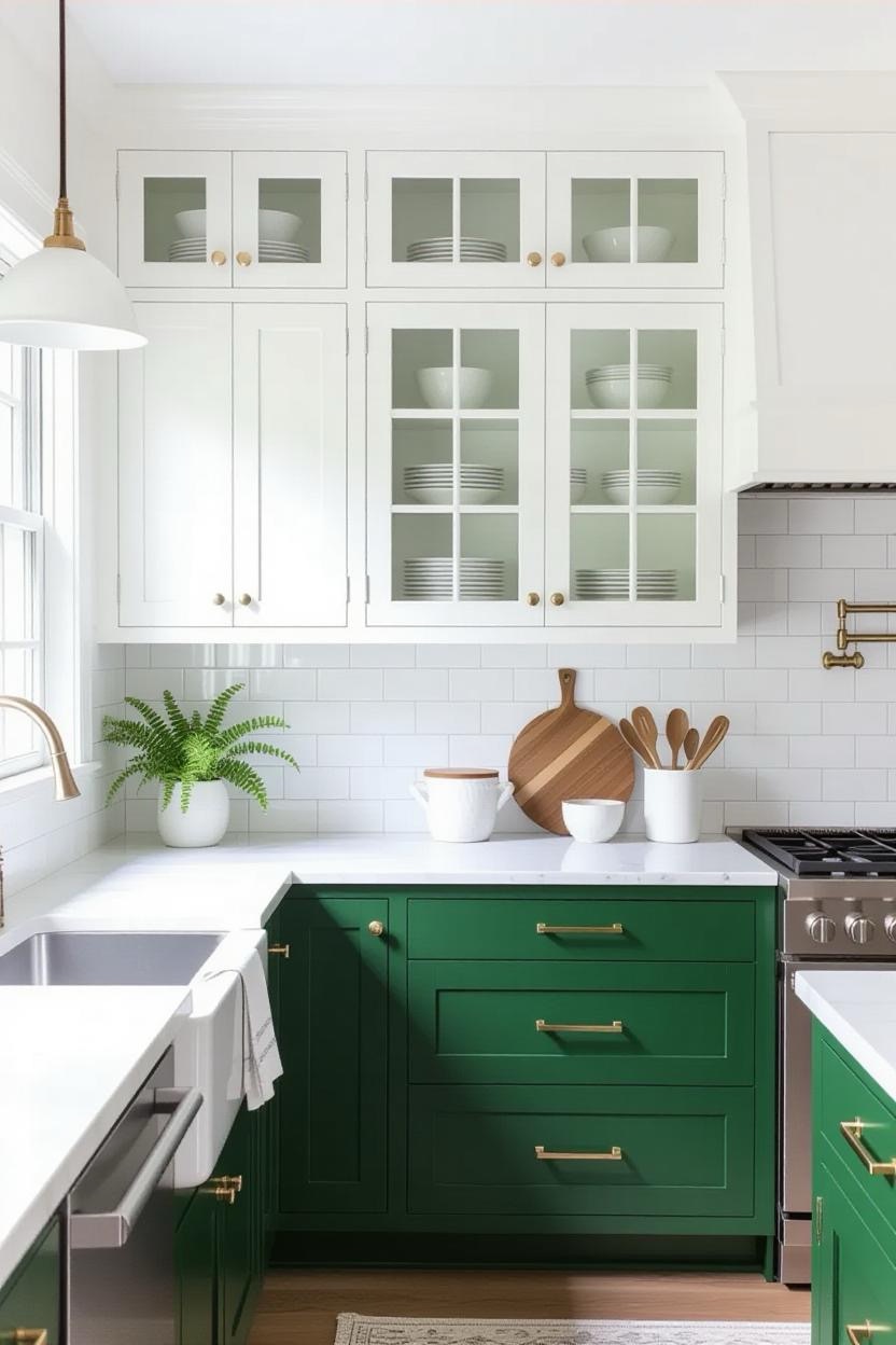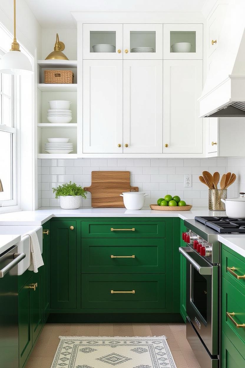 Combine deep green lower cabinets with crisp white uppers for a balanced and stylish contrast. It keeps the space open while still adding a pop of color.