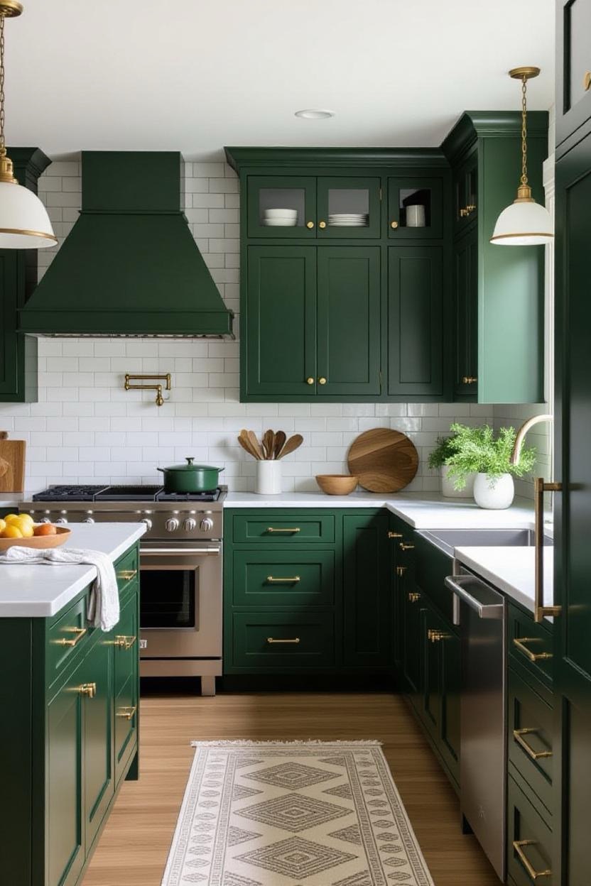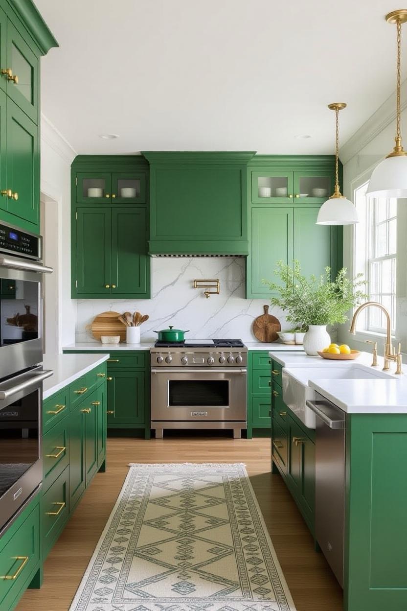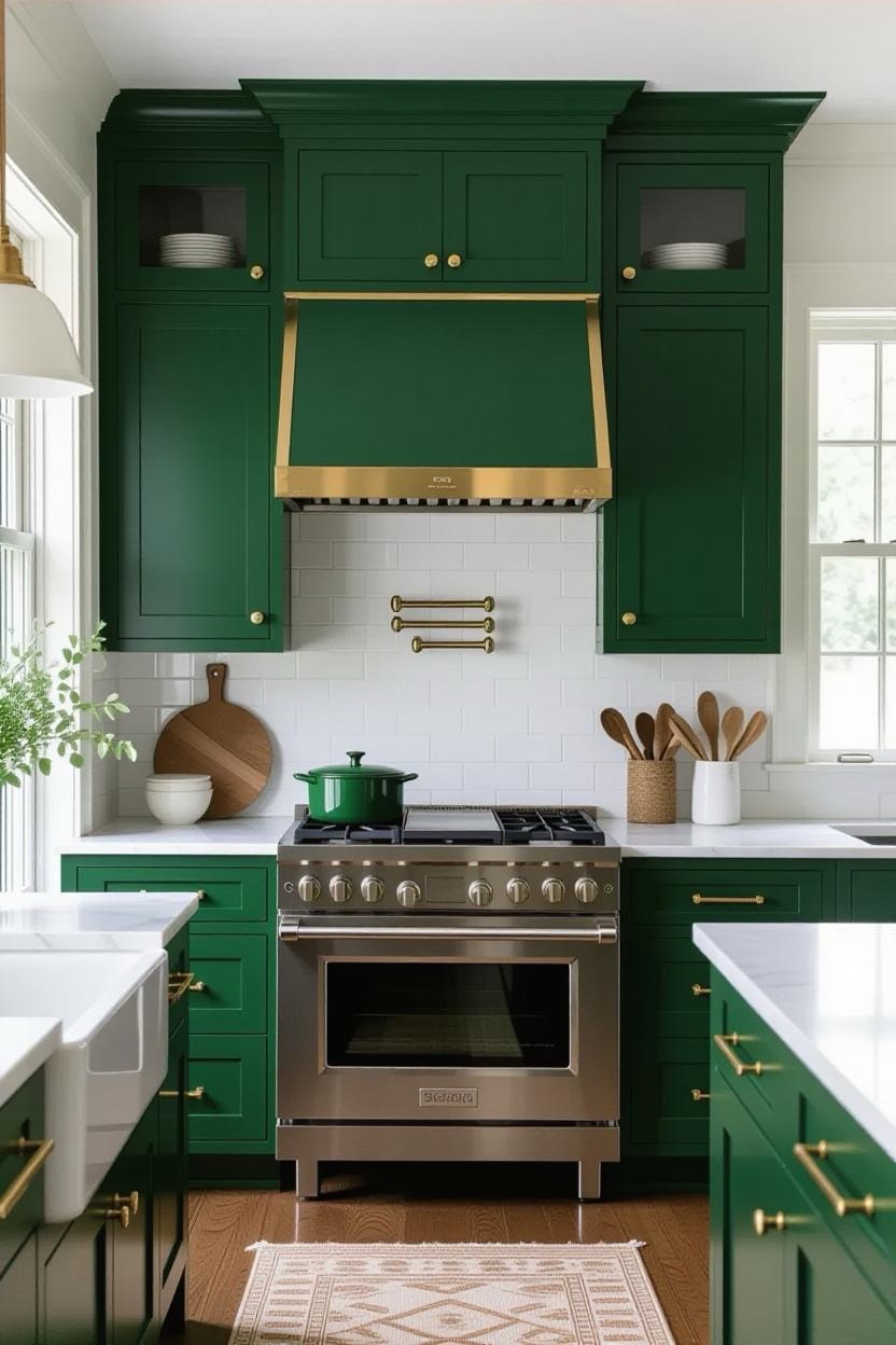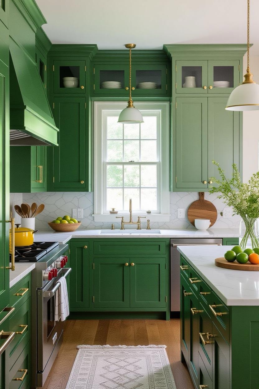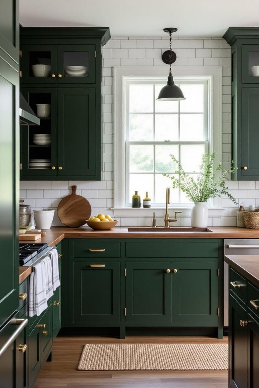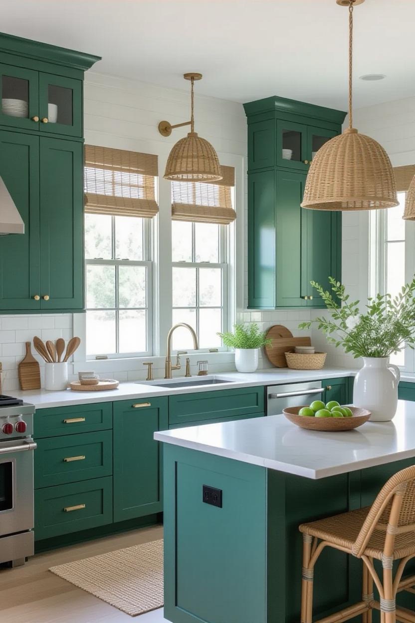 Combine deep green lower cabinets with crisp white uppers for a balanced and stylish contrast. It keeps the space open while still adding a pop of color.