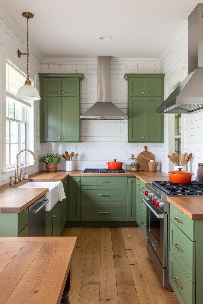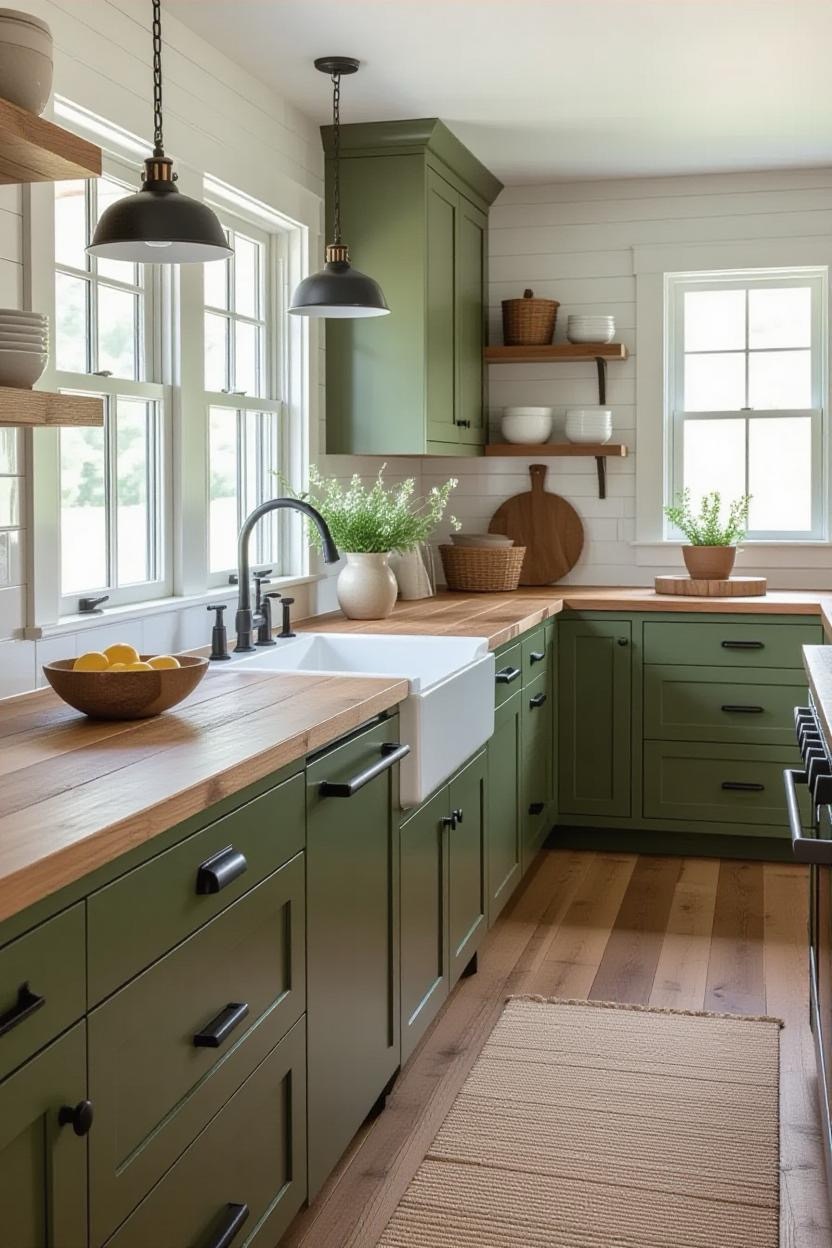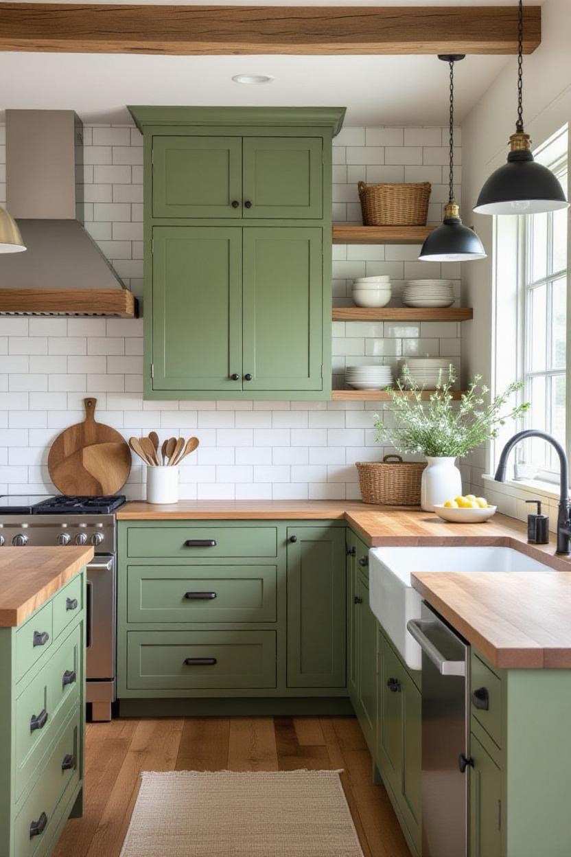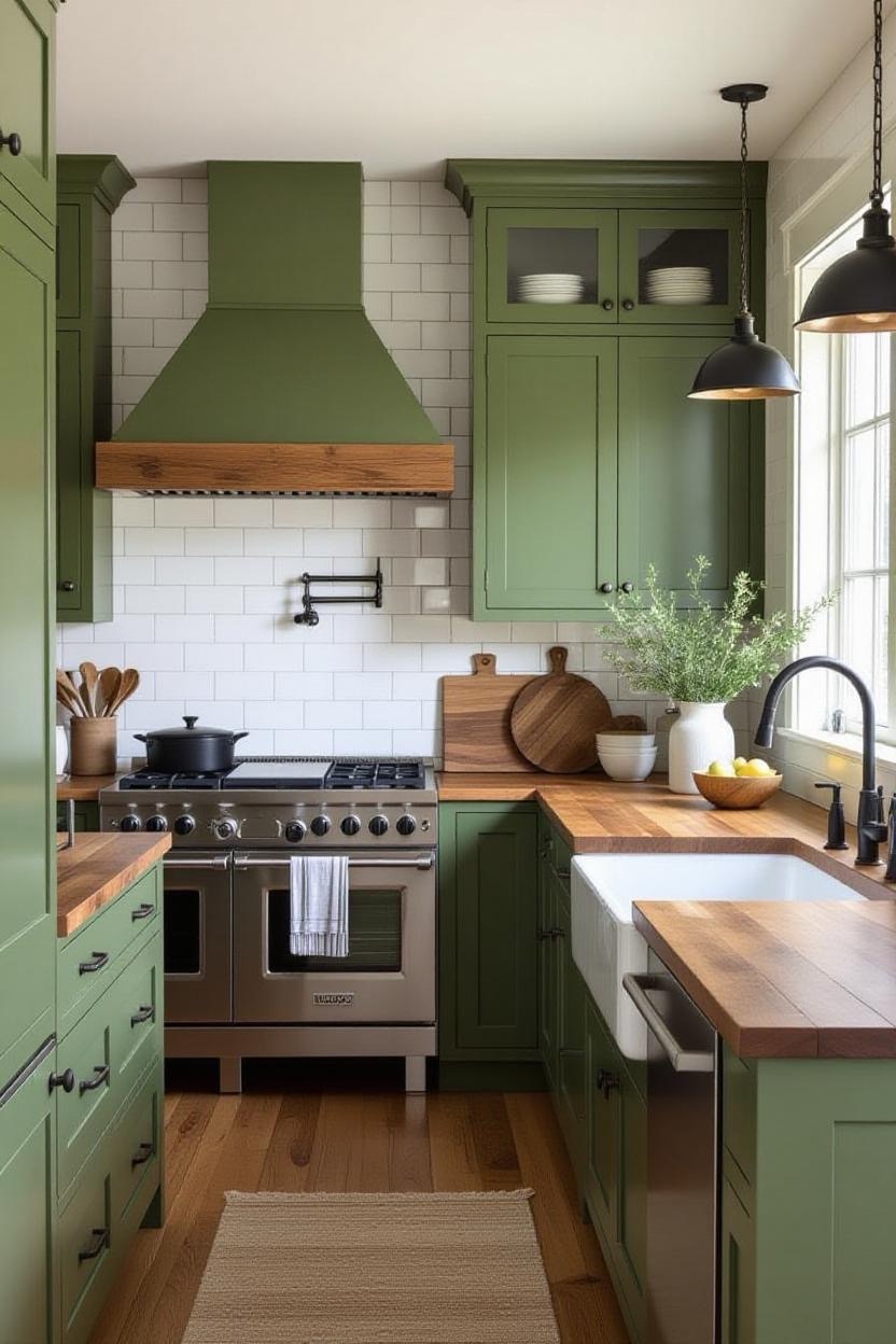 Matte olive green cabinets paired with rustic wooden countertops create a cozy farmhouse feel, making your kitchen warm and welcoming.