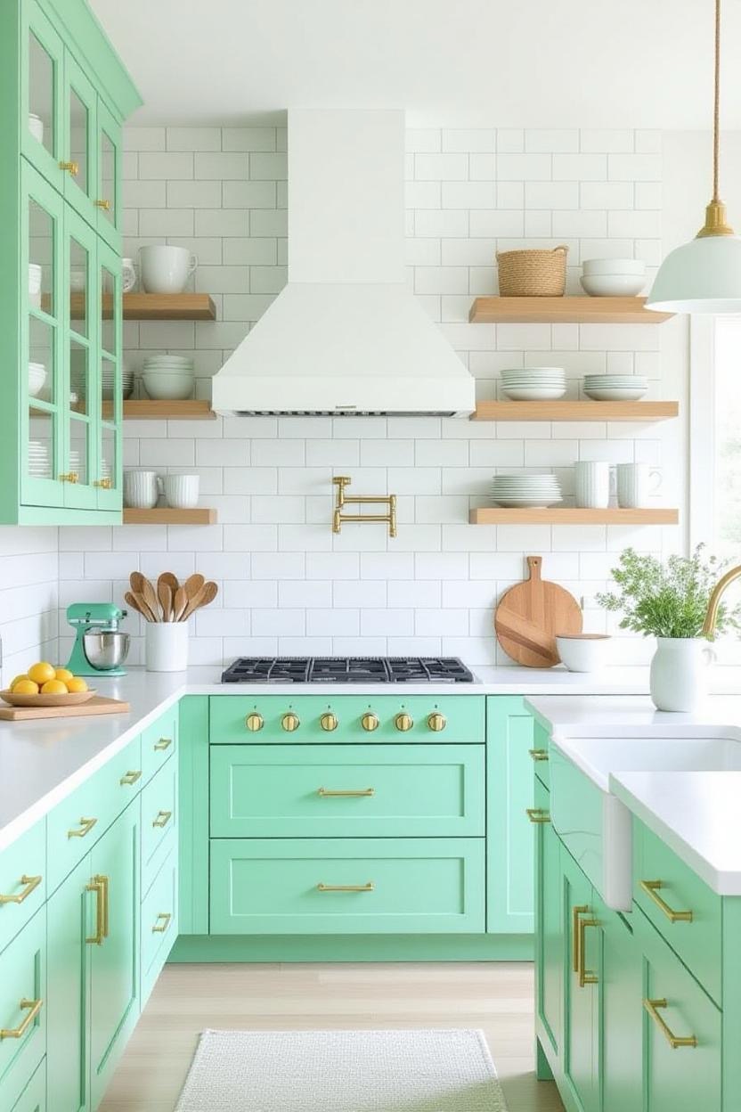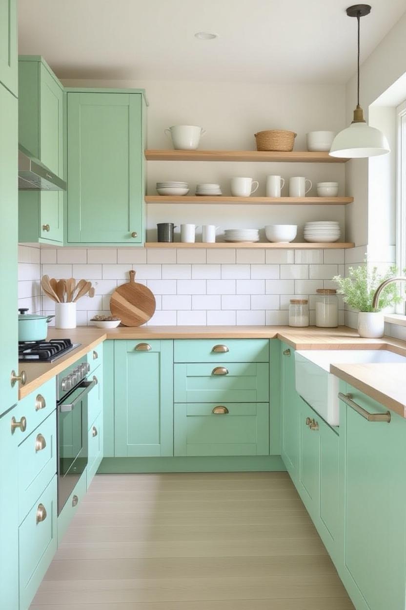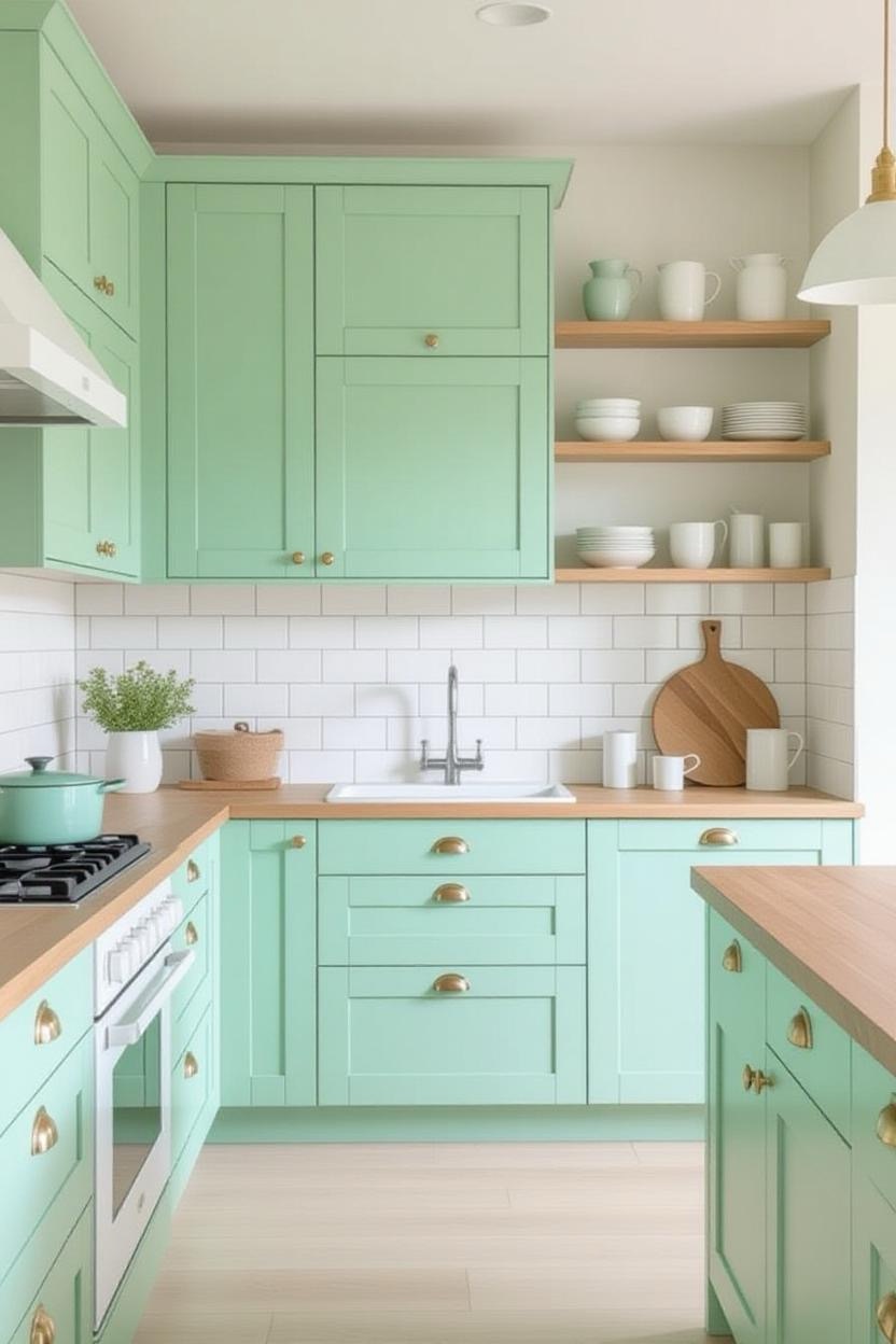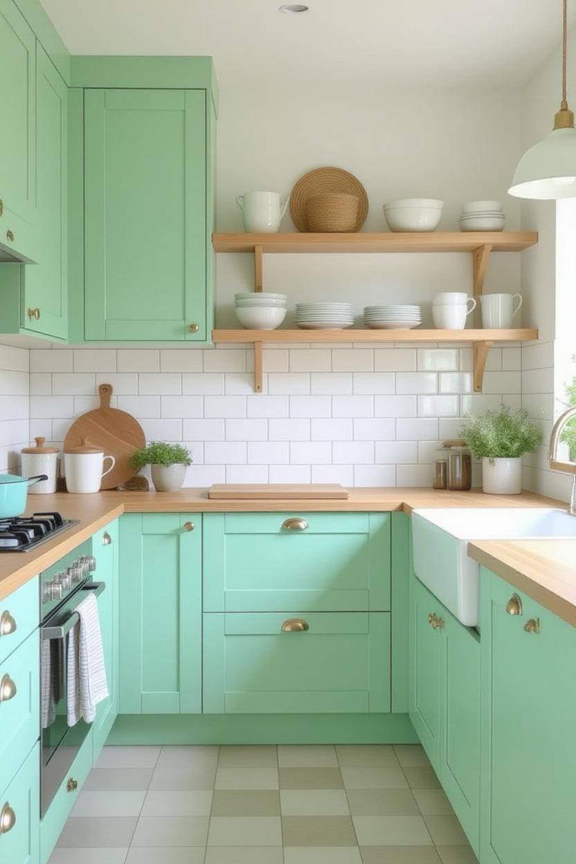 Soft mint green cabinetry can instantly brighten a kitchen, especially when paired with white tiles and light wood shelving for a playful touch.