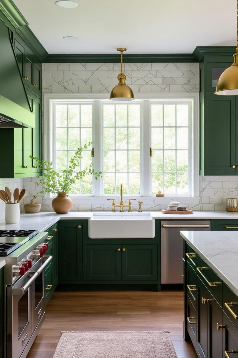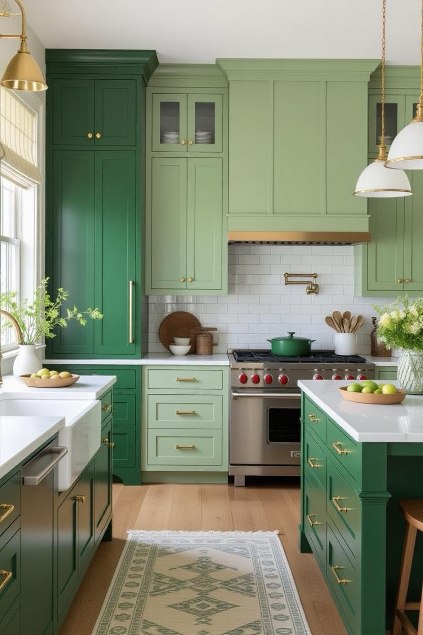 Mixing different green shades in one kitchen, such as deep emerald islands with pale sage uppers, adds dimension and visual interest.