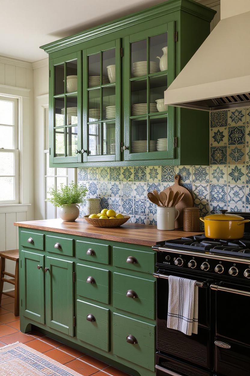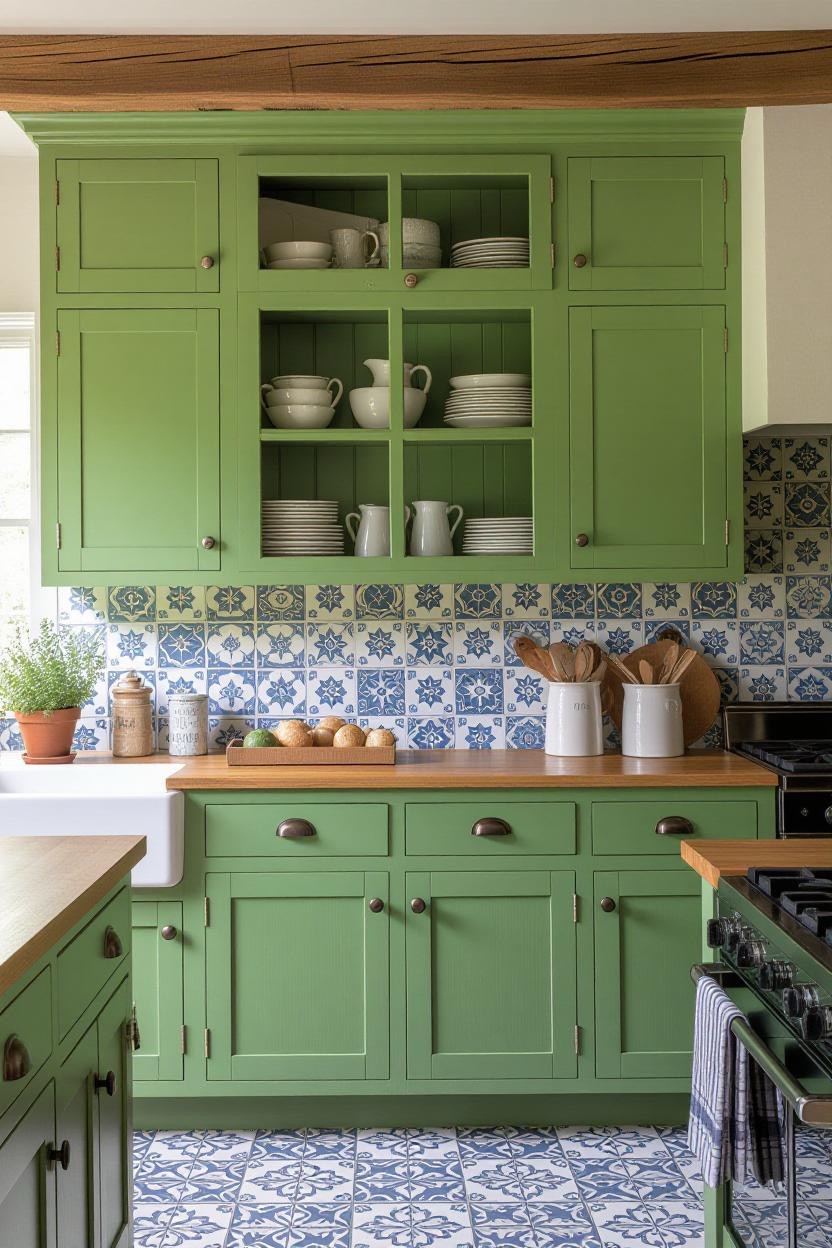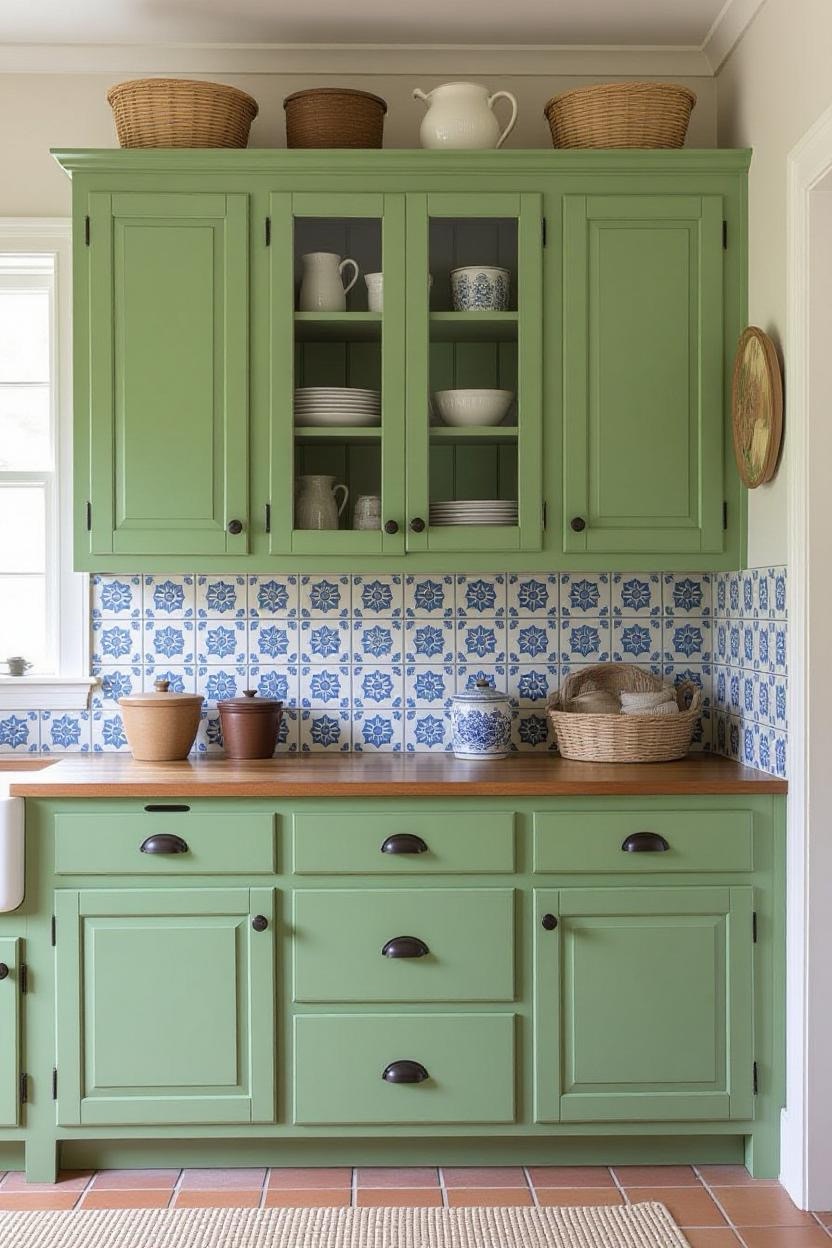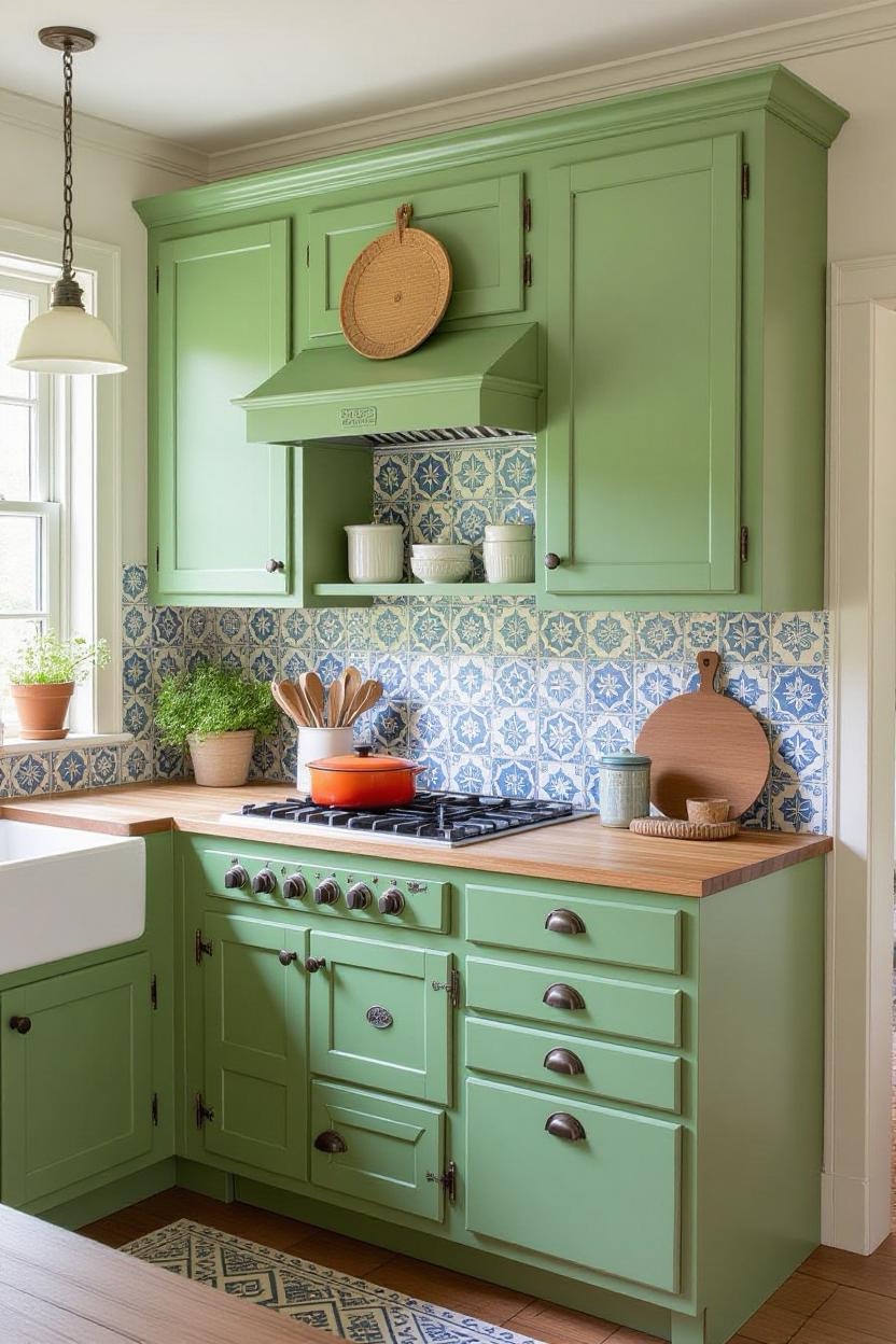 Distressed green cabinets add vintage charm to a country kitchen, especially when paired with patterned tiles and antique décor.
