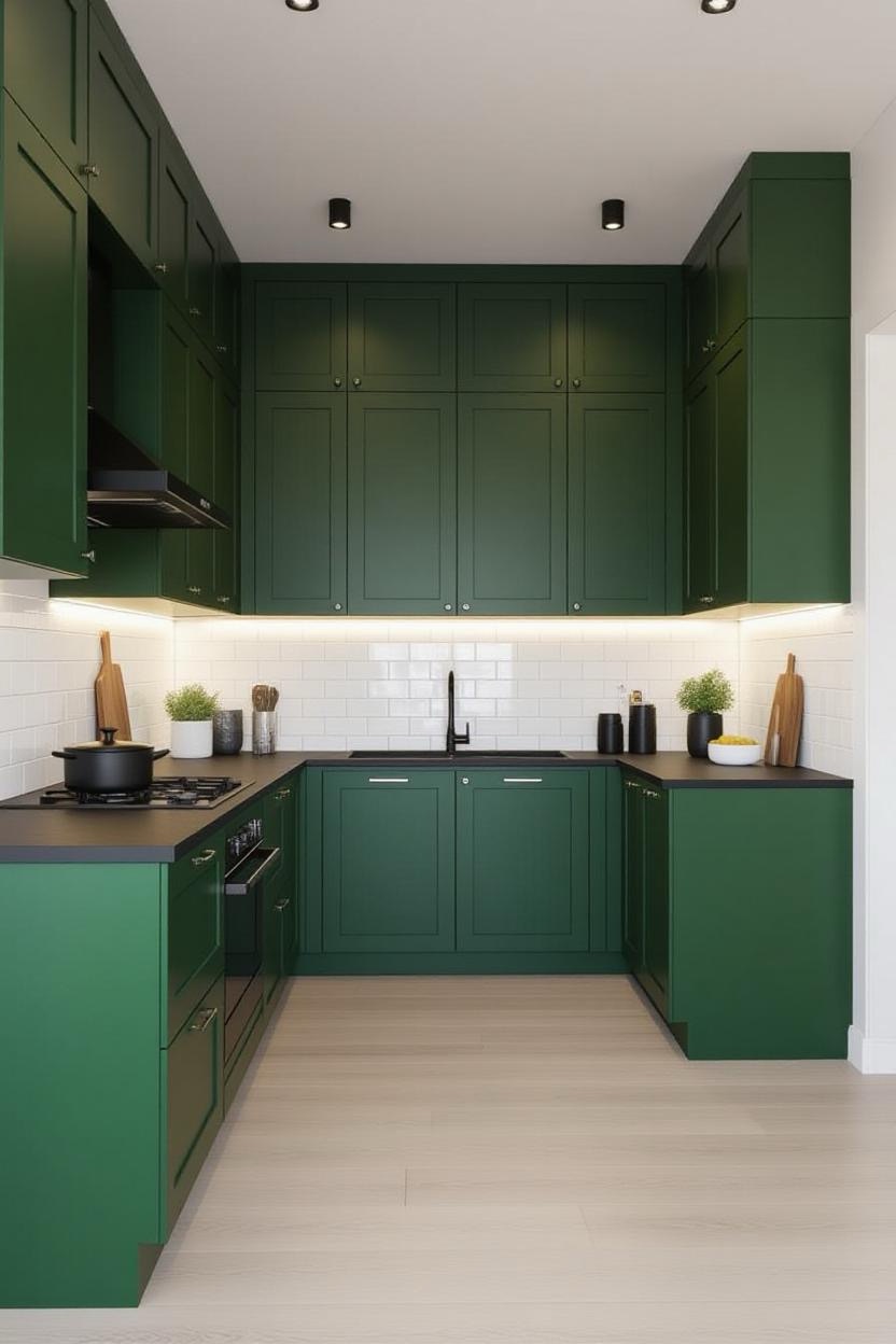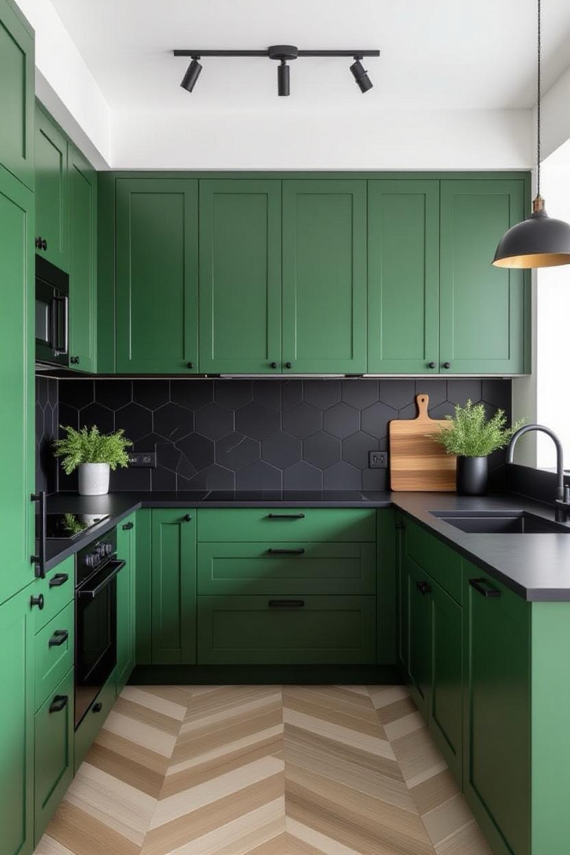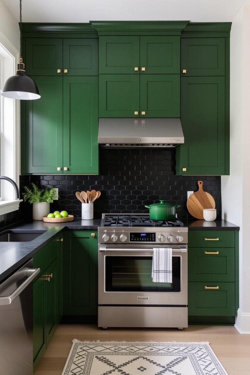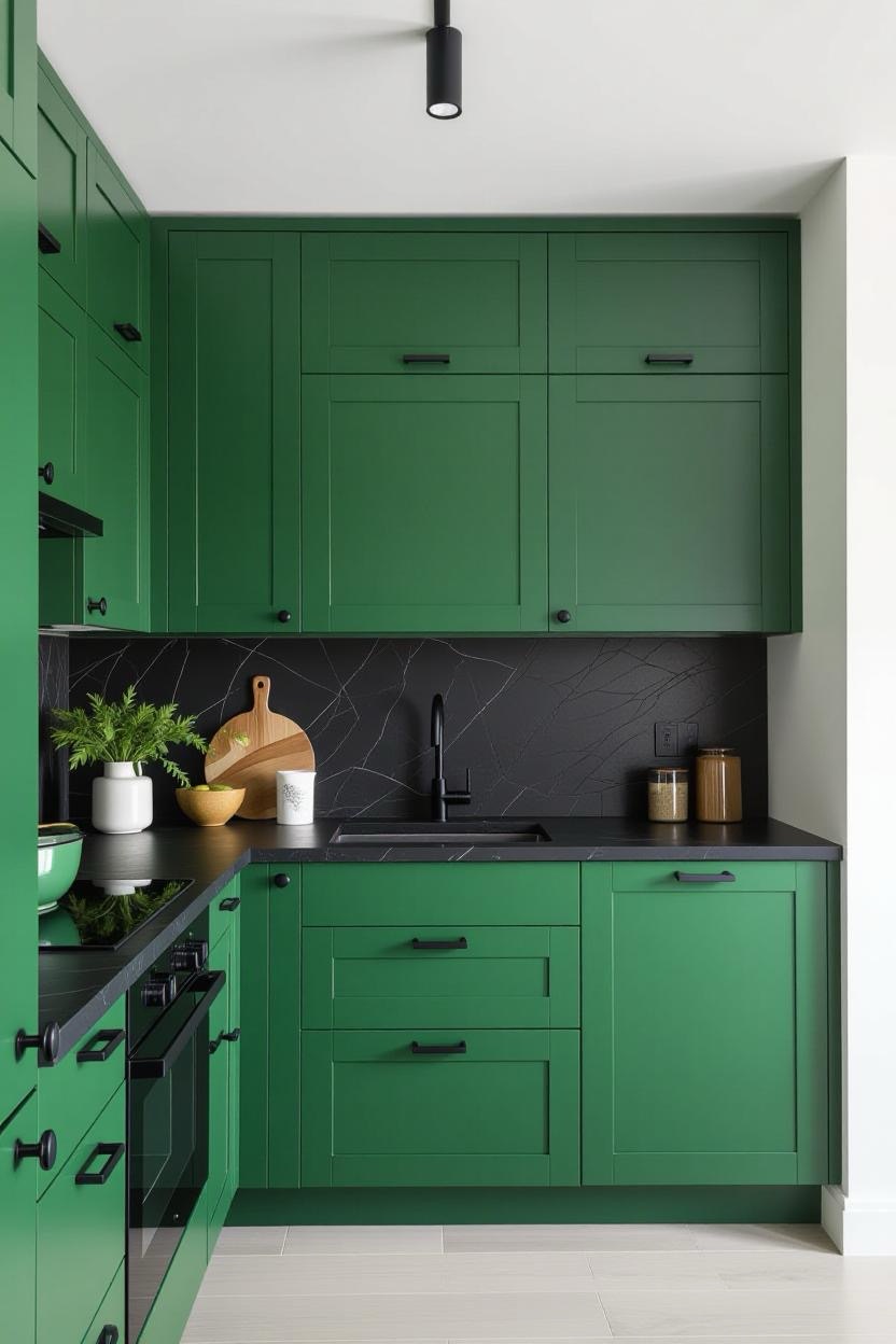 Hunter green paired with black countertops creates a bold, modern aesthetic perfect for sleek apartment kitchens.