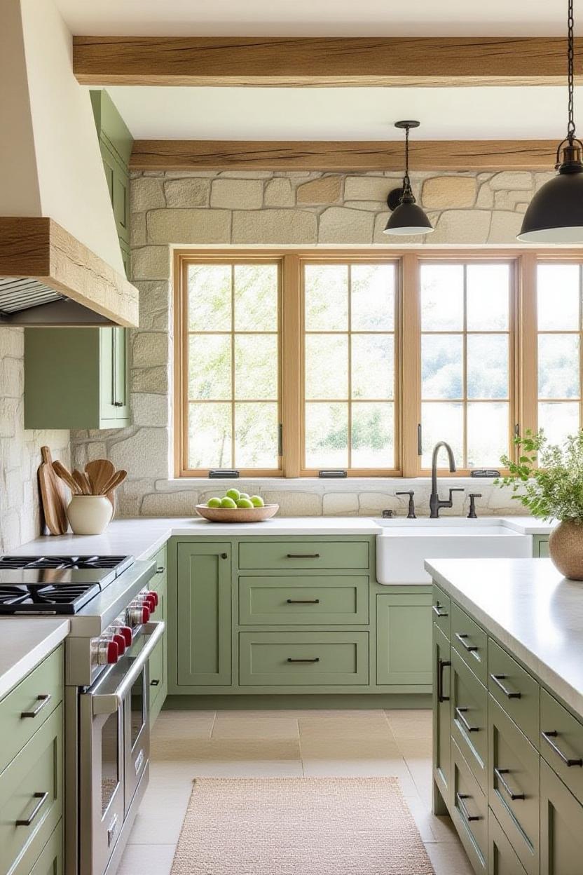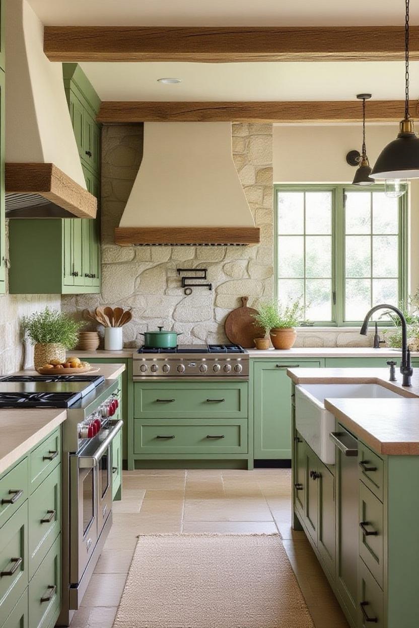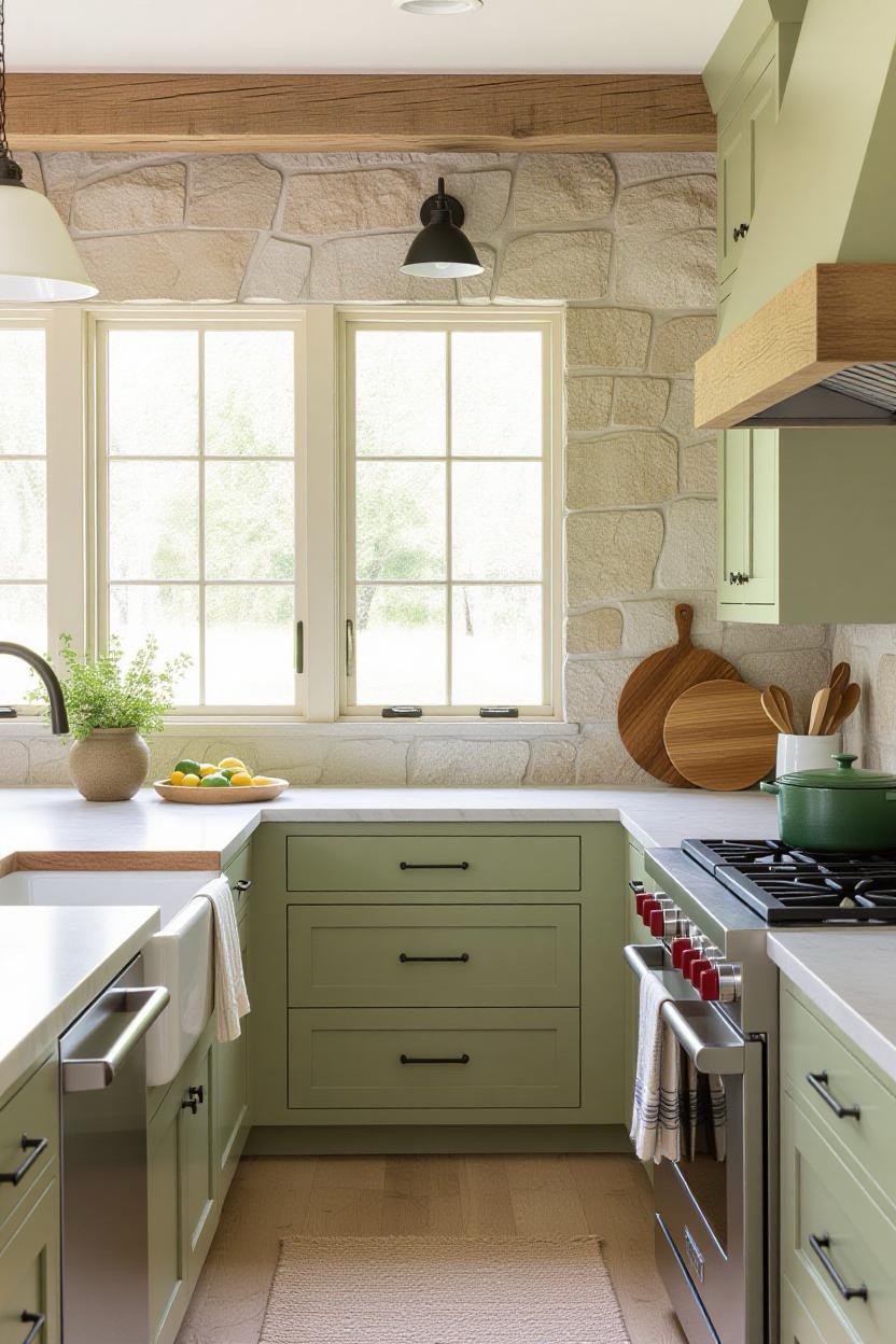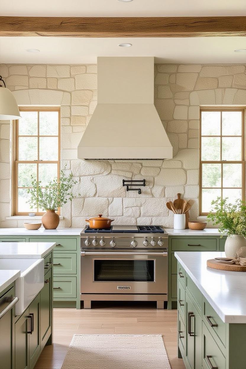 Match sage green cabinets with stone backsplash for a natural, earthy kitchen that feels connected to the outdoors.