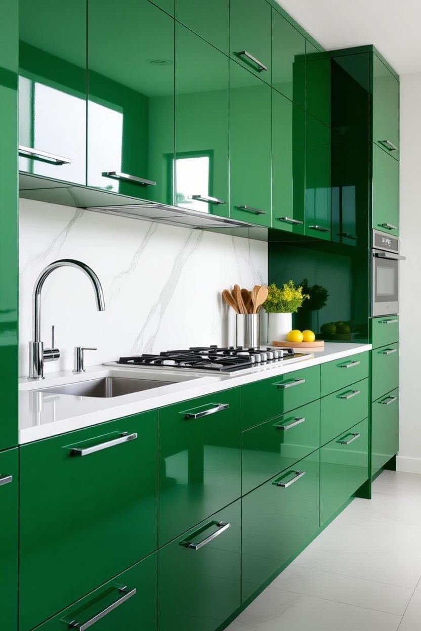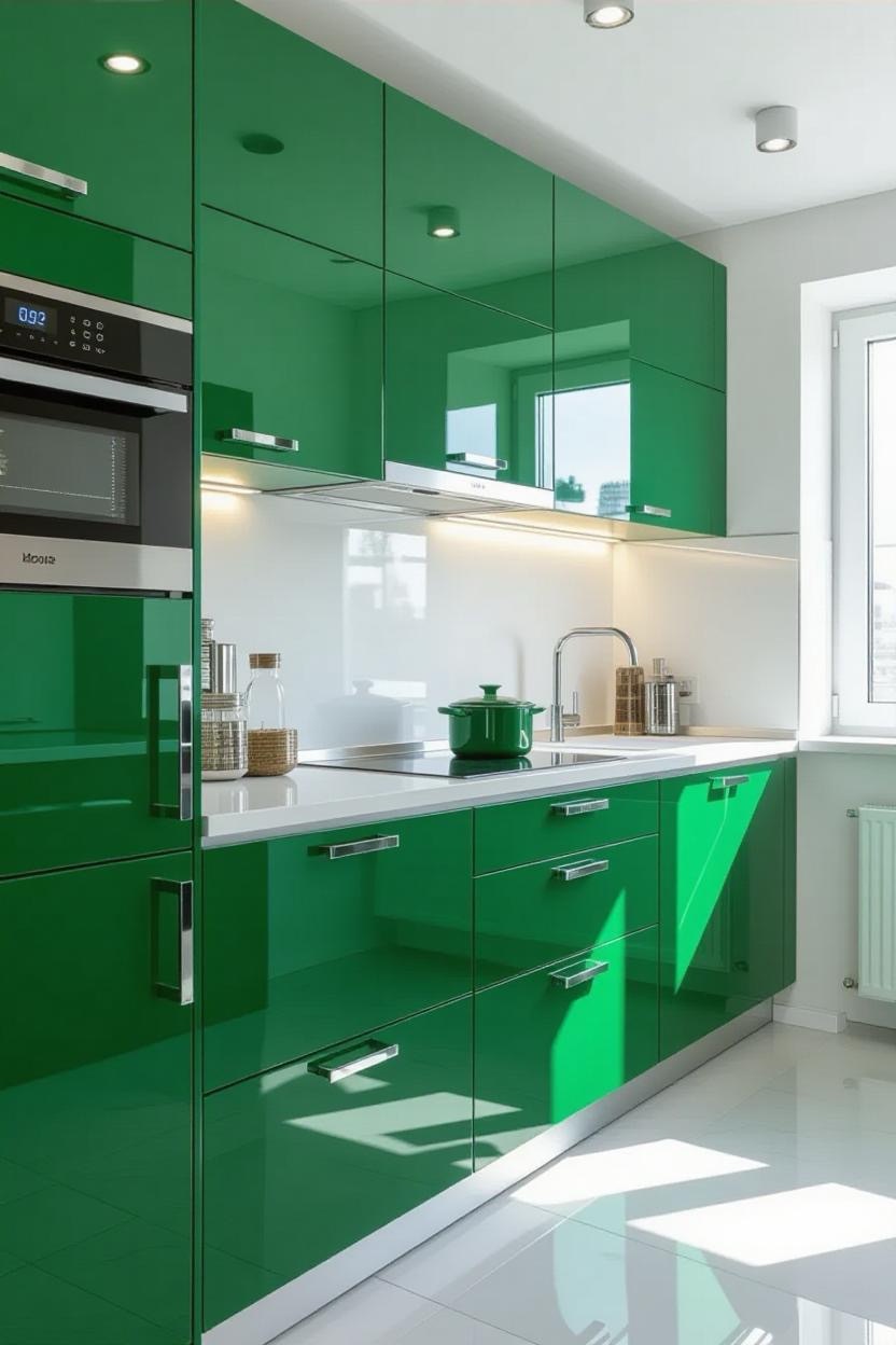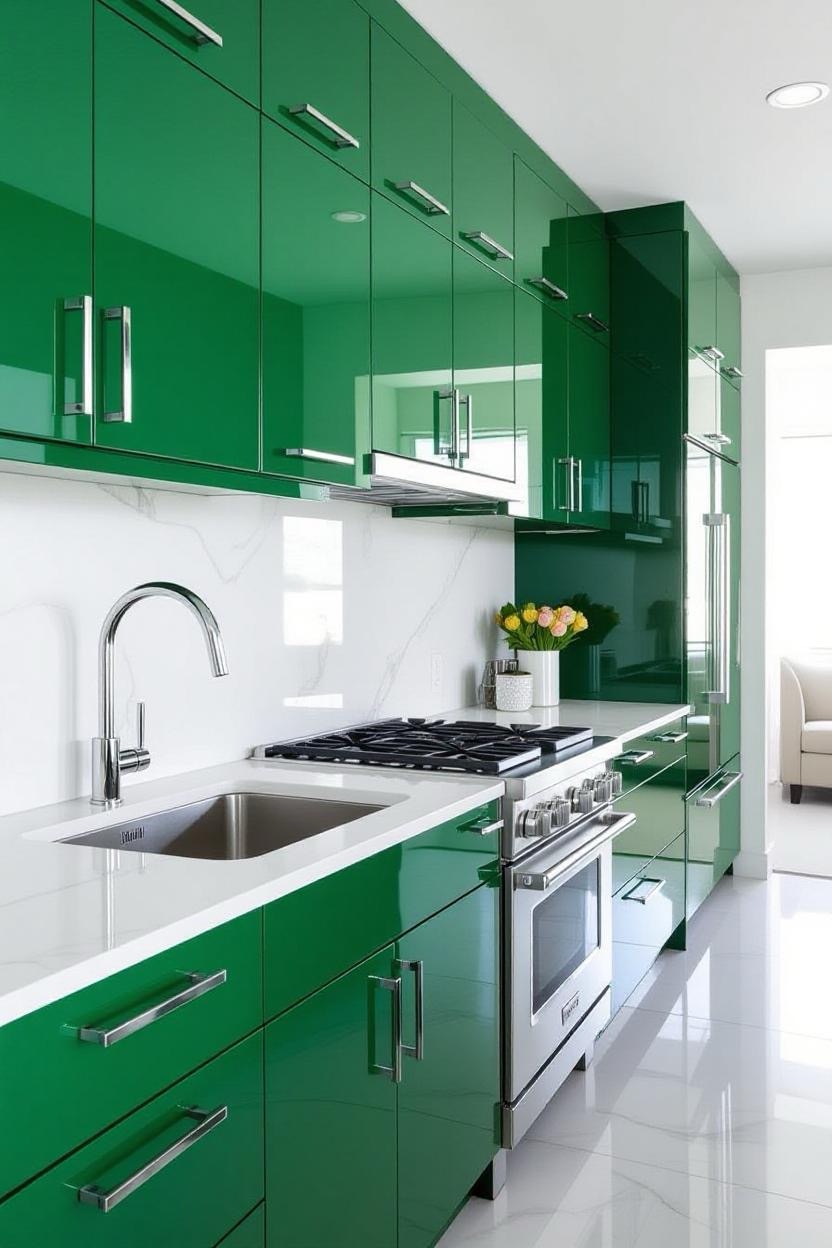 High-gloss green cabinets with chrome fixtures give off a contemporary, polished look that reflects light beautifully.