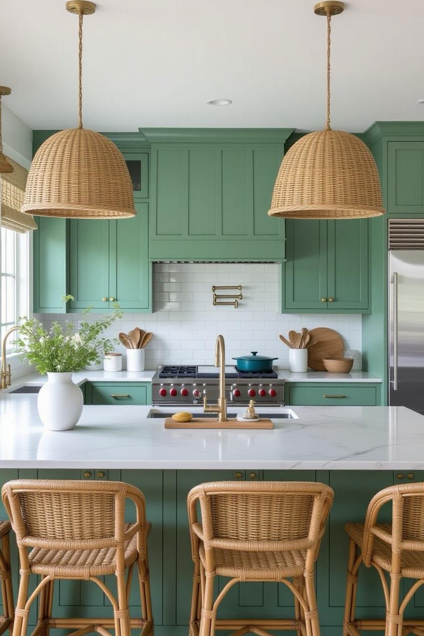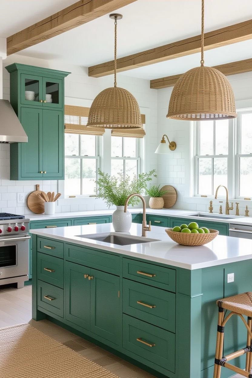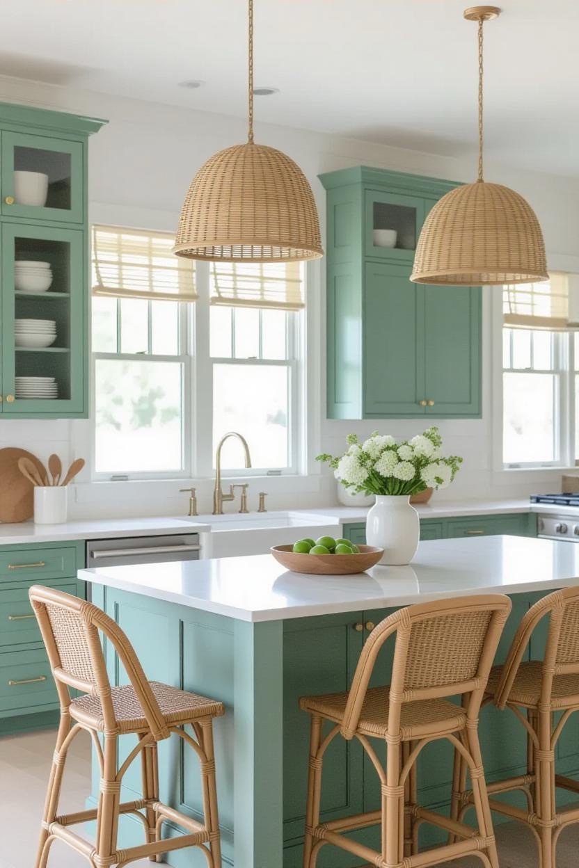 Teal-green cabinets bring coastal charm into the kitchen, especially when paired with rattan pendant lights and beachy décor.