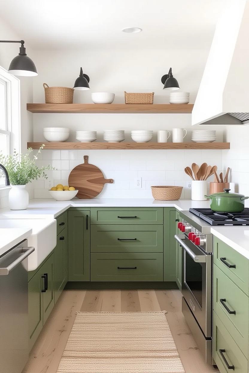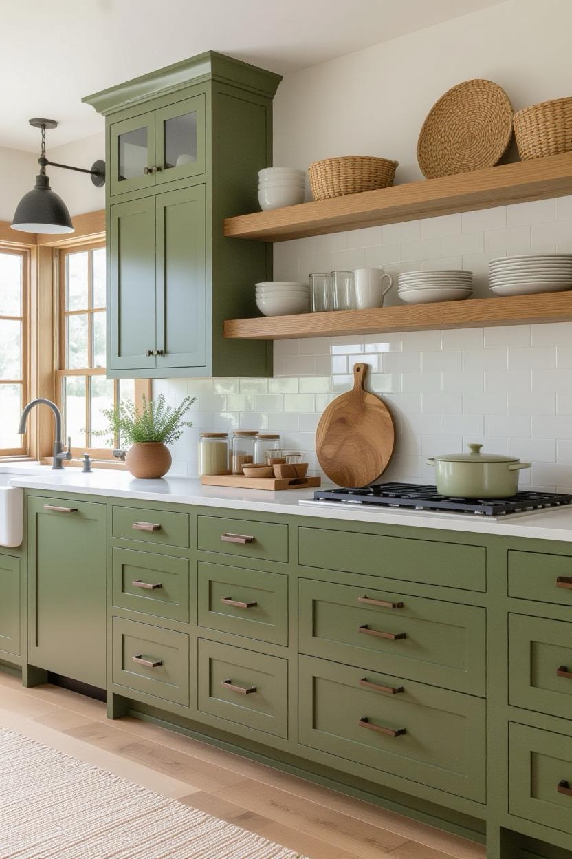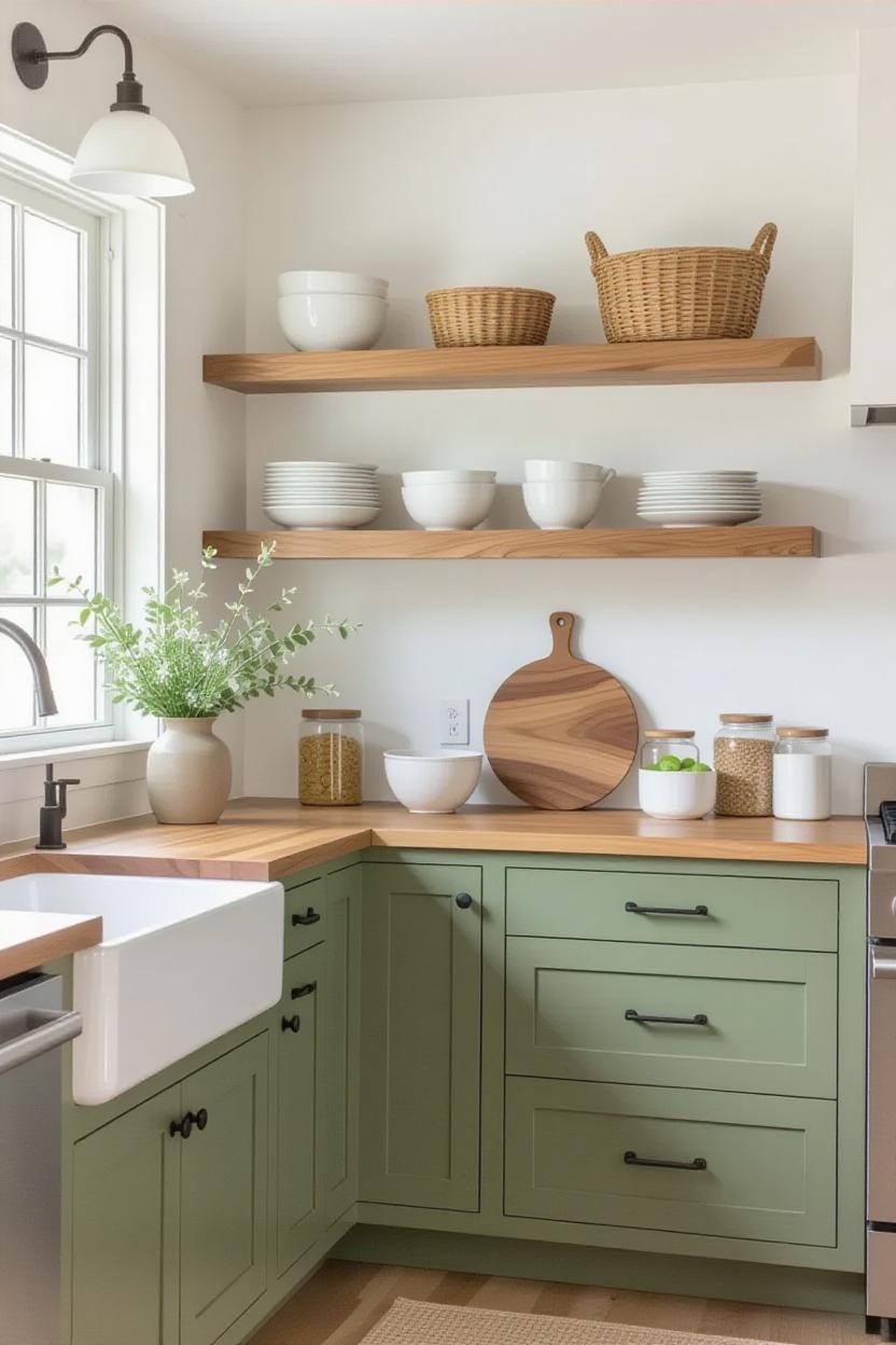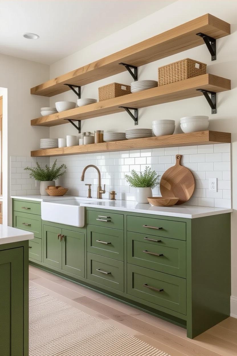 Olive green lower cabinets combined with open wood shelving offer a balance of storage and display space with a natural aesthetic.