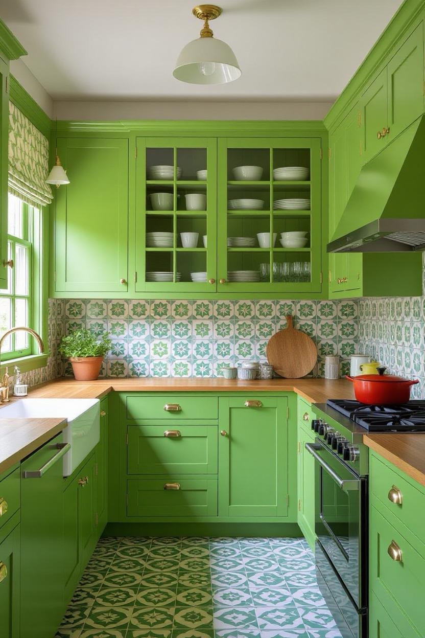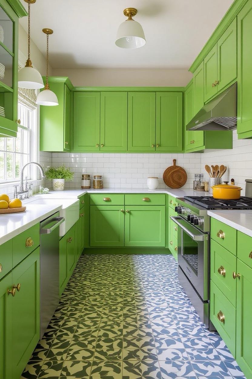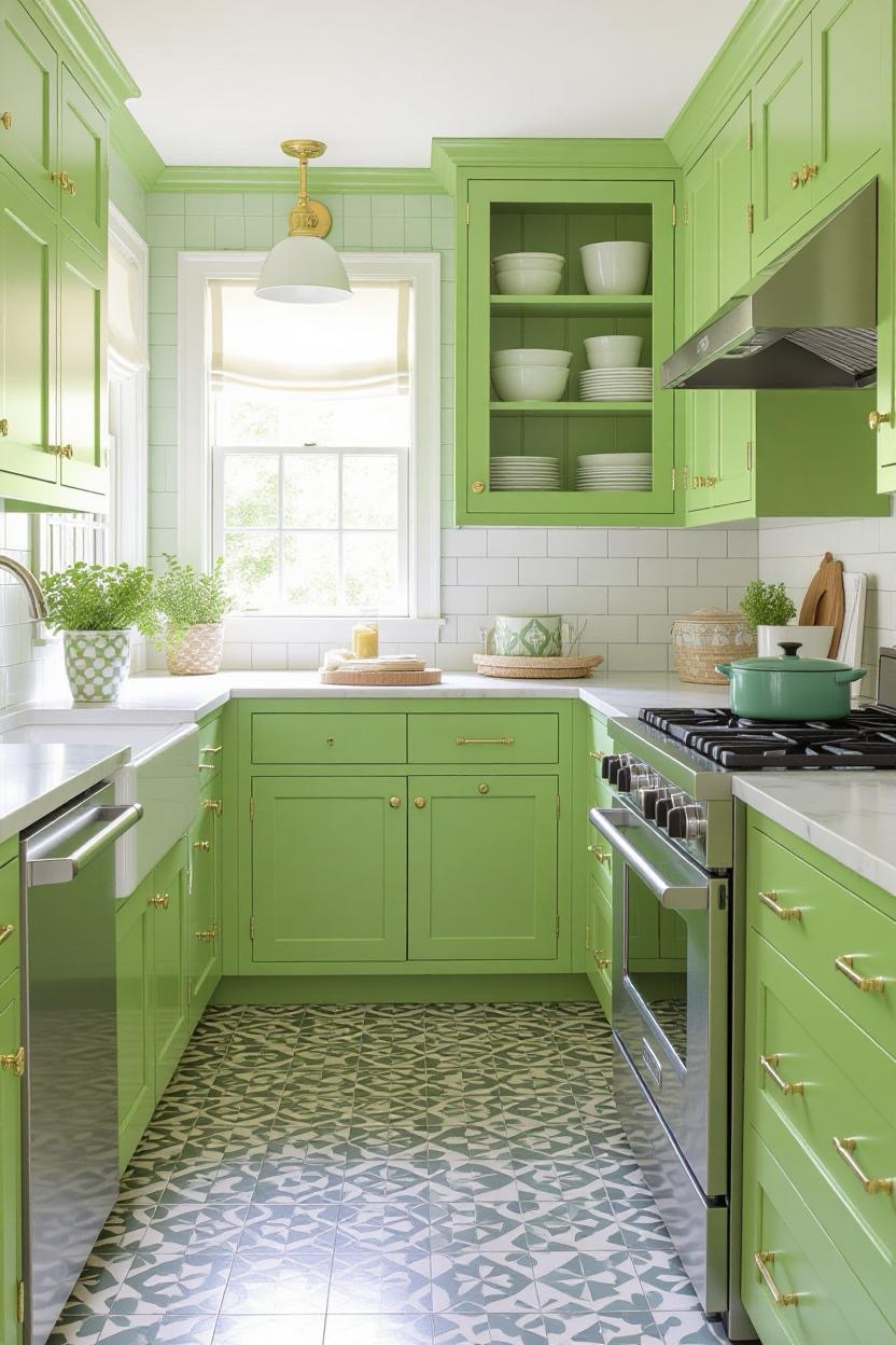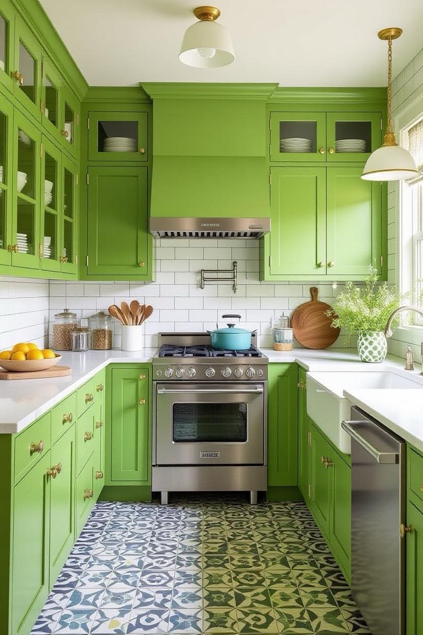 A cheerful retro green shade paired with patterned floors can bring a nostalgic, playful feel to your kitchen design.