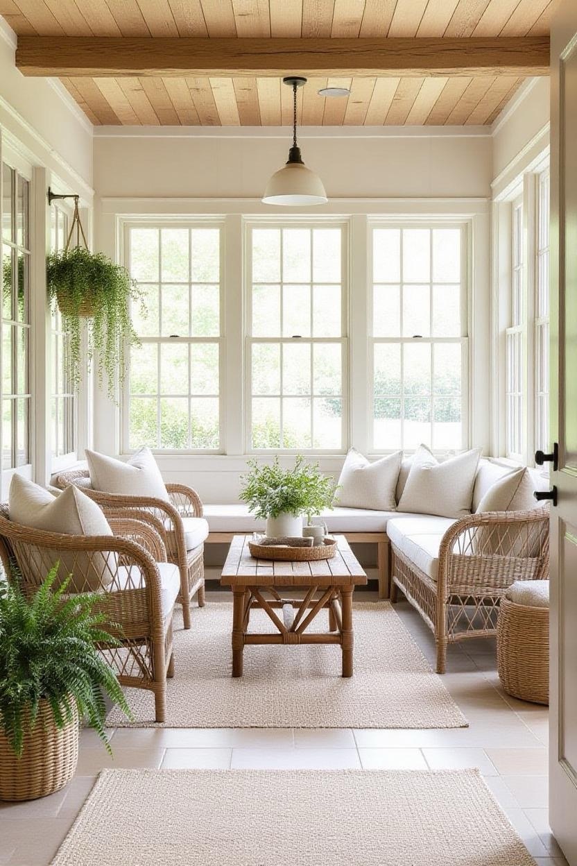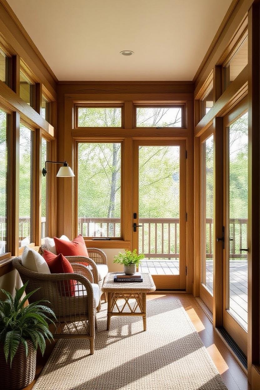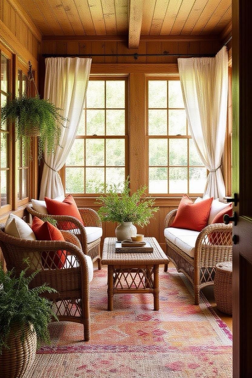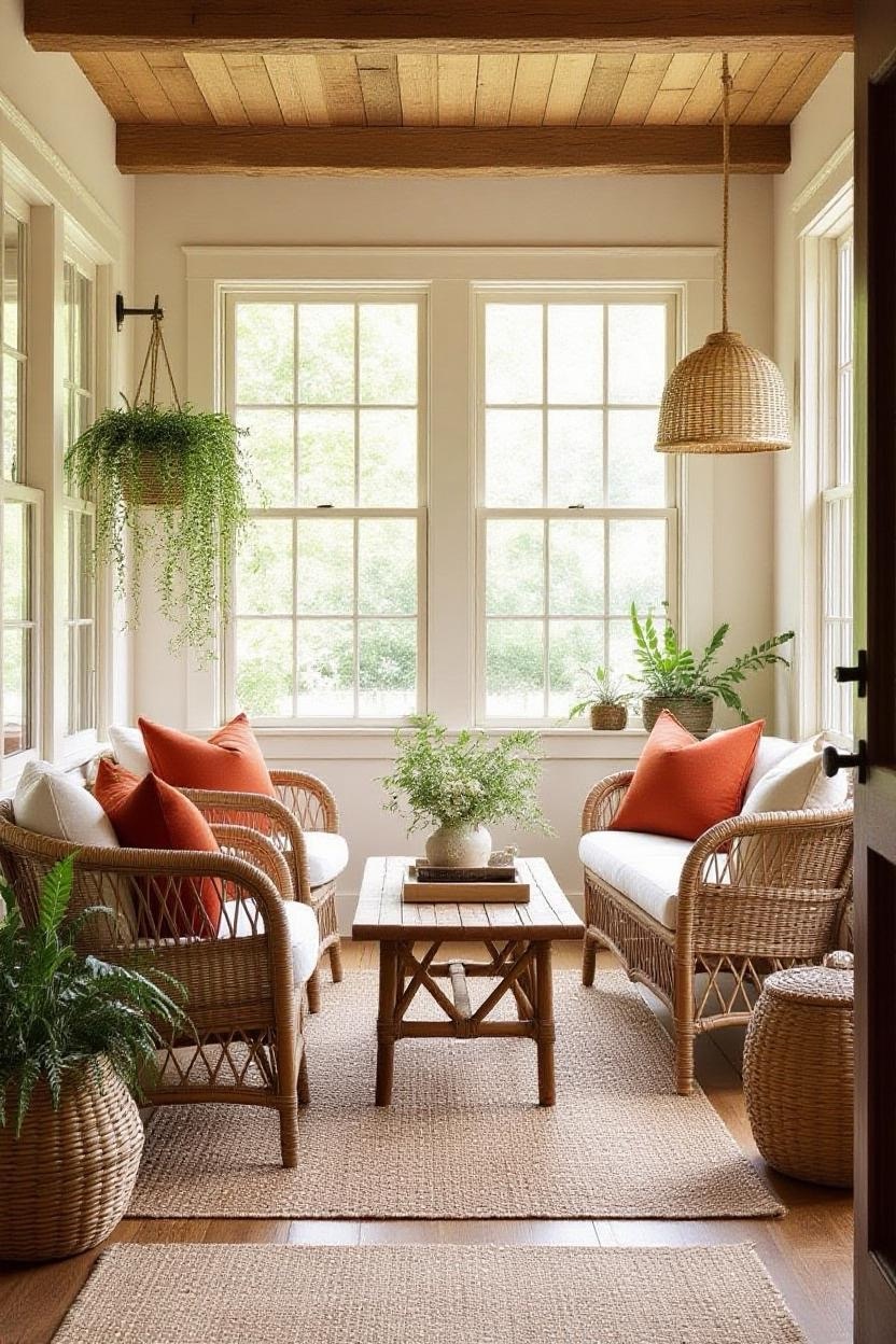 Wooden furniture, woven rugs, and rattan accents create a warm, rustic atmosphere. Natural materials pair beautifully with sunlight, making your small sunroom feel inviting and earthy.