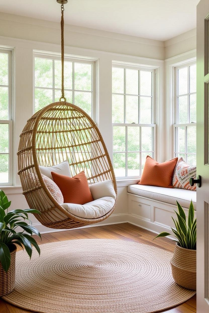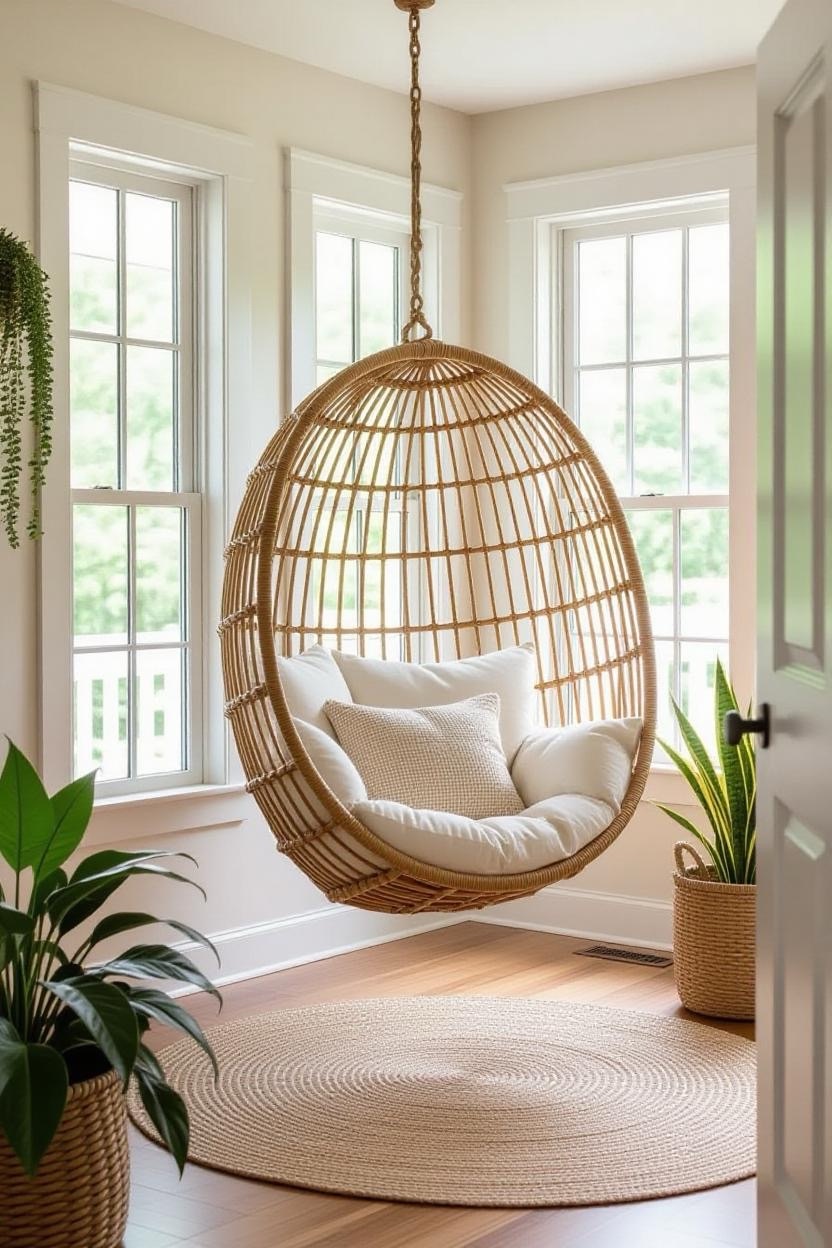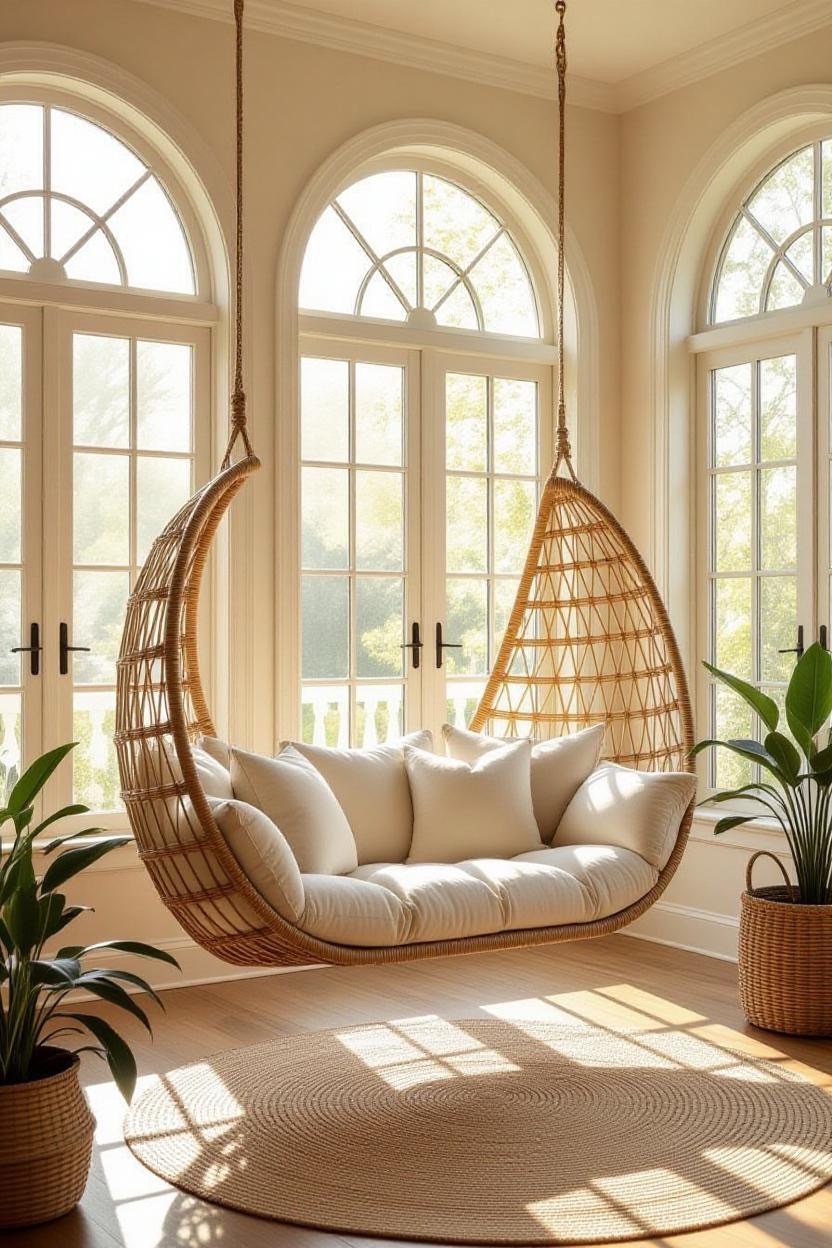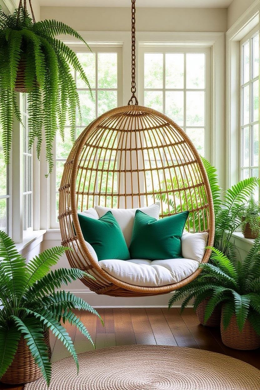 A hanging rattan chair or swing is a fun and space-saving option that instantly adds character to your sunroom. It creates a cozy reading nook without taking up too much floor space.