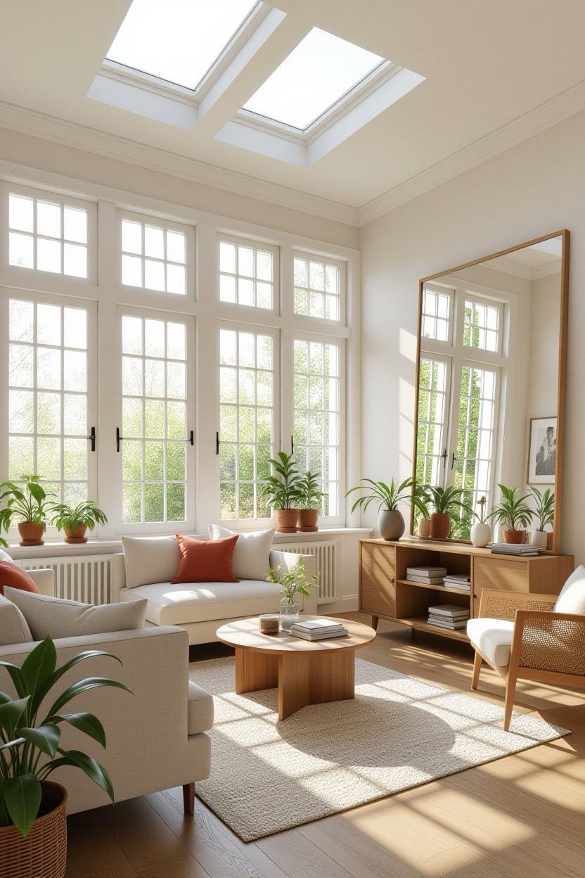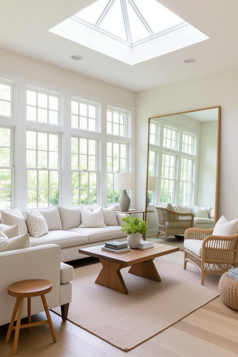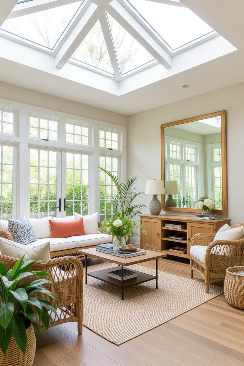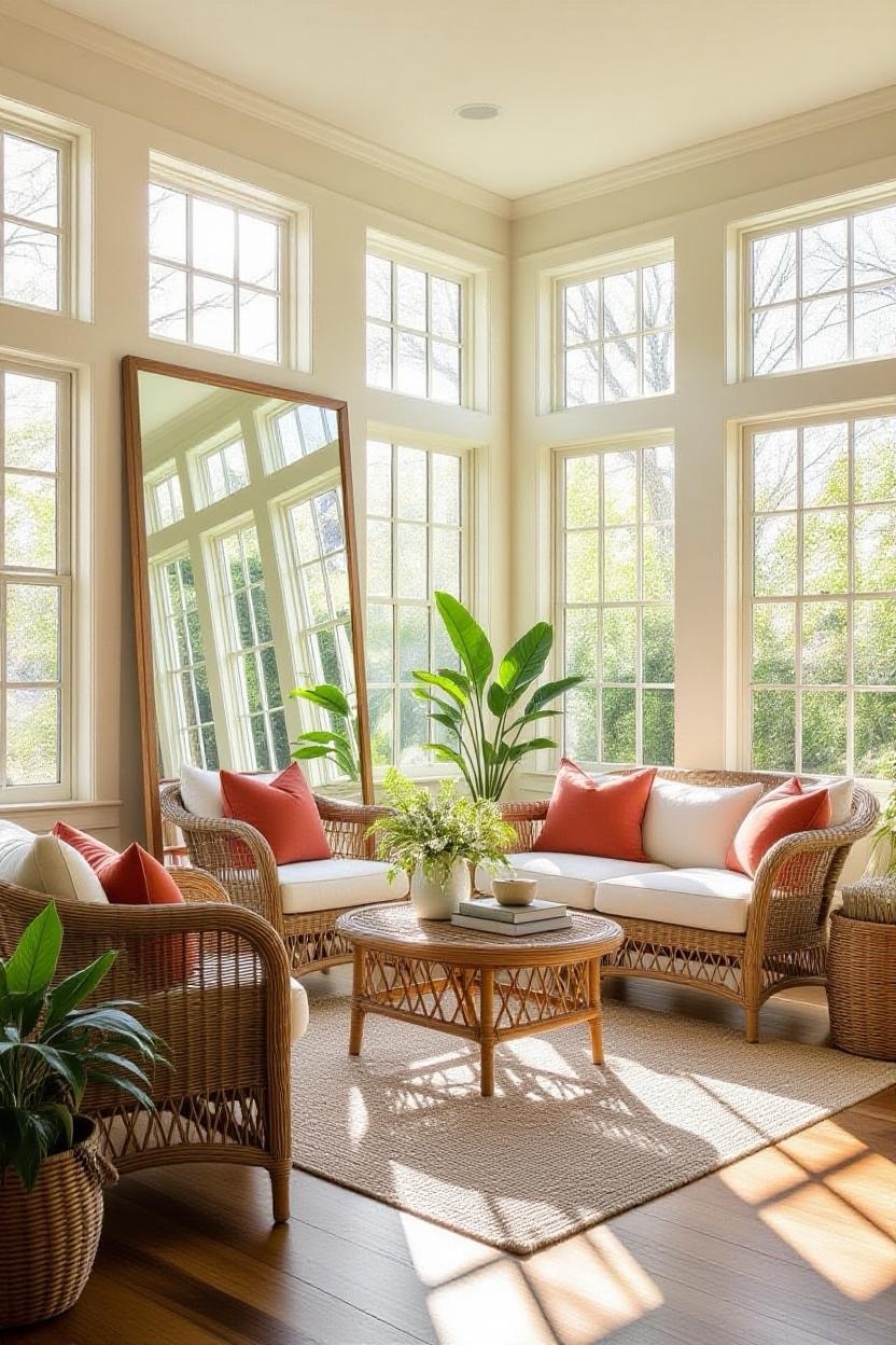 Placing a large mirror on one wall of your sunroom instantly doubles the perception of space while bouncing natural light throughout the room.