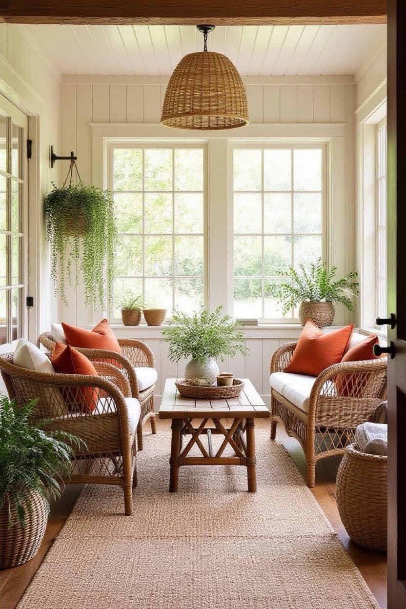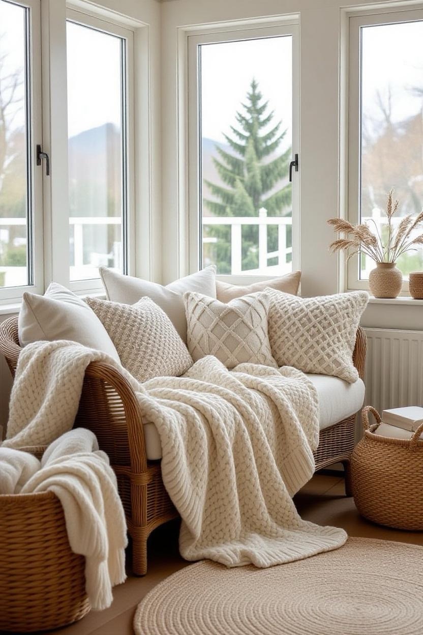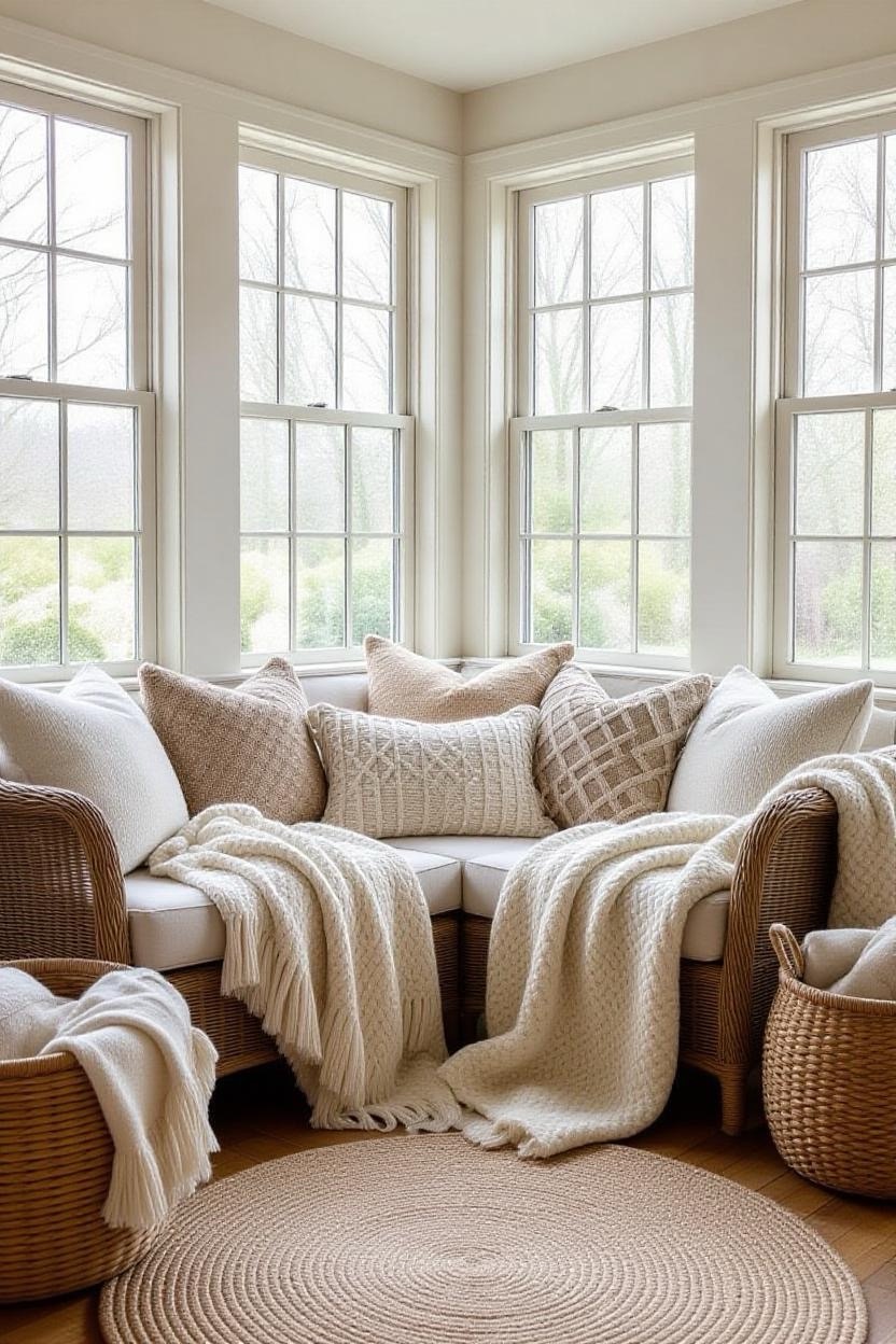 Incorporate cozy textures like soft throws, knit pillows, and woven baskets. These details make your sunroom feel warm and comfortable, especially in colder months.