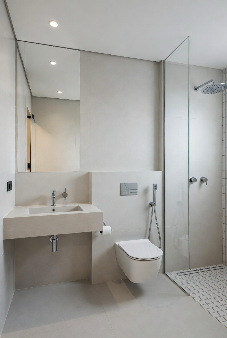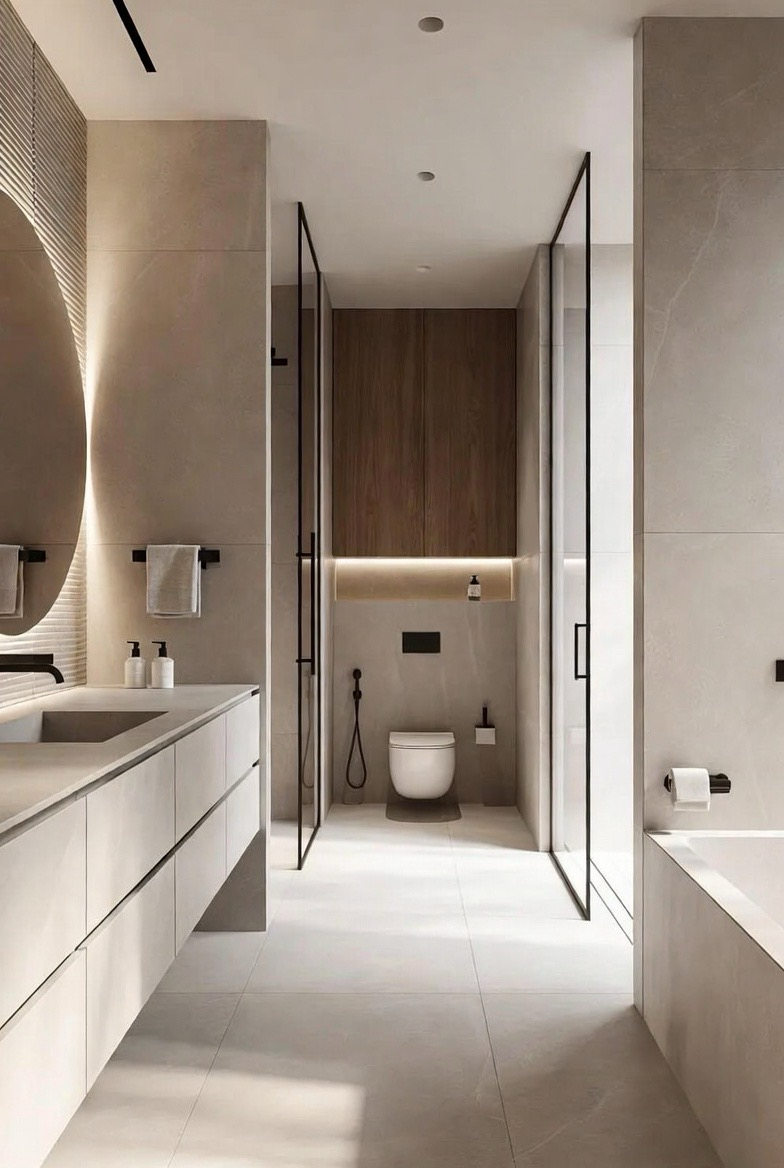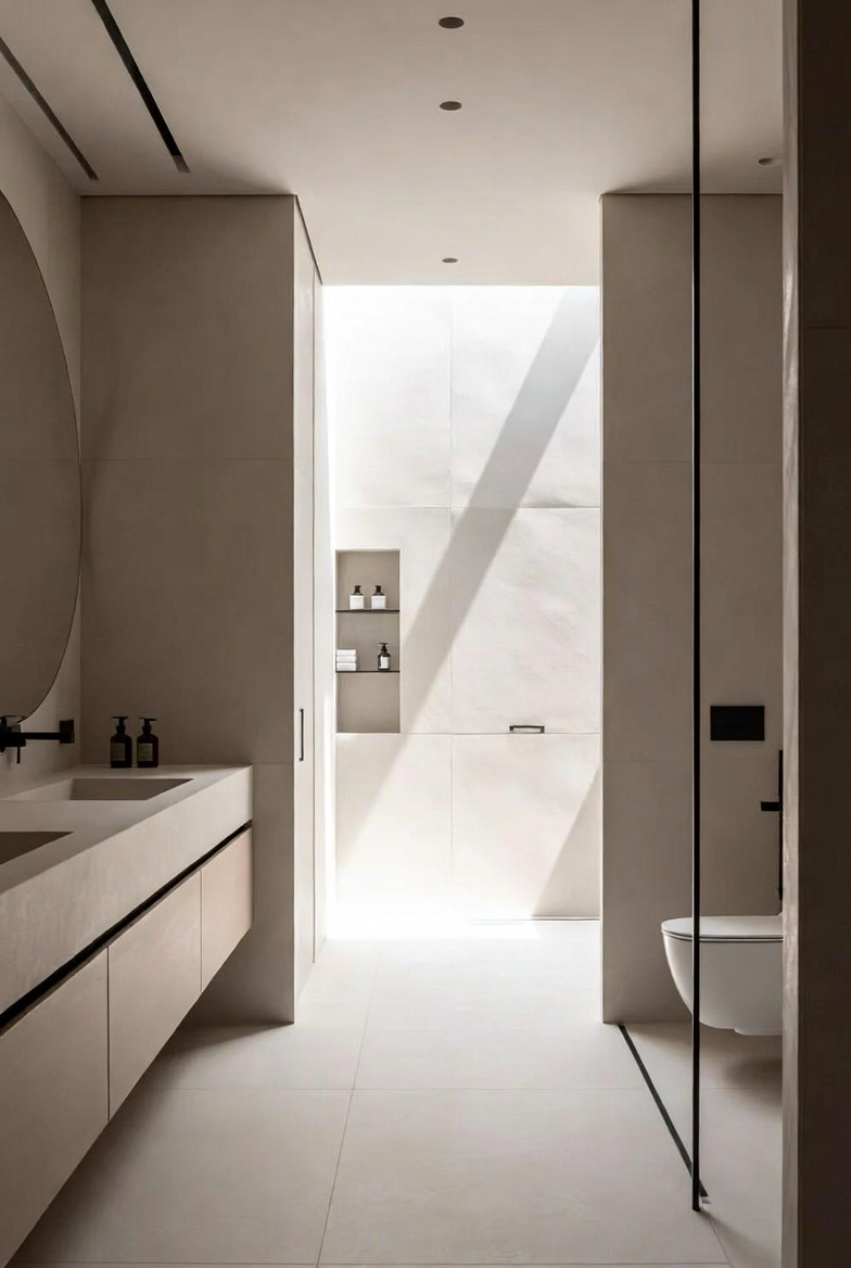 A neutral color palette with soft whites, beige, and warm grays creates a calm, luxurious atmosphere. Floating vanities, handle-less cabinets, and seamless tiles enhance the minimalist look. This design emphasizes clean lines and clutter-free surfaces, making the bathroom feel open and airy. Natural light, subtle textures, and understated décor elevate the space without overwhelming it. Perfect for modern homes, this bathroom style feels timeless, fresh, and effortlessly elegant.