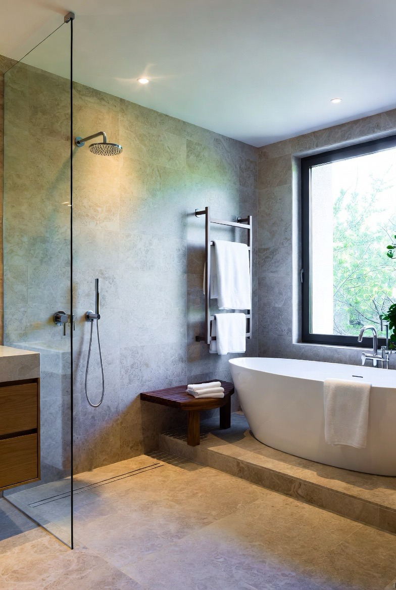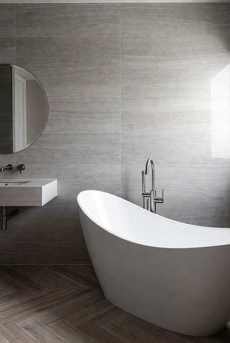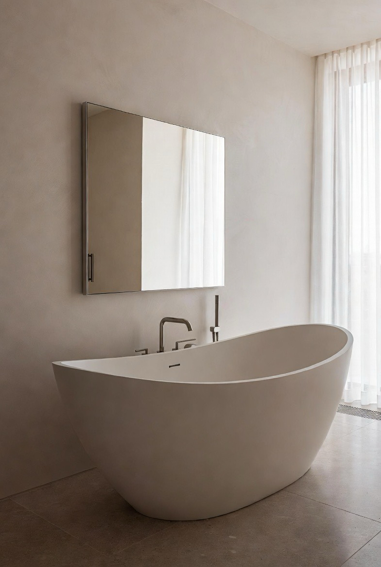 A freestanding tub acts as a stunning focal point. Its sculptural shape adds elegance while maintaining a clean, modern look. Paired with simple fixtures and neutral surroundings, the tub becomes a luxurious centerpiece. This design is ideal for creating a spa-like atmosphere that feels indulgent yet refined.