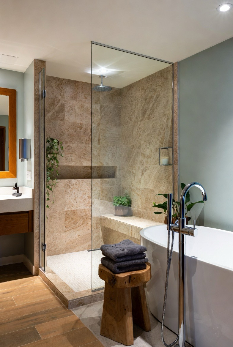 Spa-inspired bathrooms focus on relaxation and comfort. Think large walk-in showers, freestanding tubs, and soothing color palettes. Natural stone, wood accents, and soft lighting help create a tranquil environment. This modern design brings hotel-like luxury into your home, turning everyday routines into calming rituals. Add plush towels, greenery, and minimalist accessories to complete the serene, spa-worthy experience.