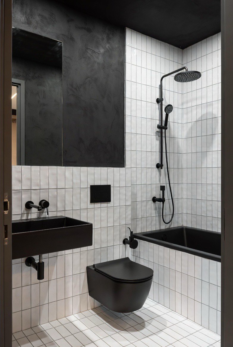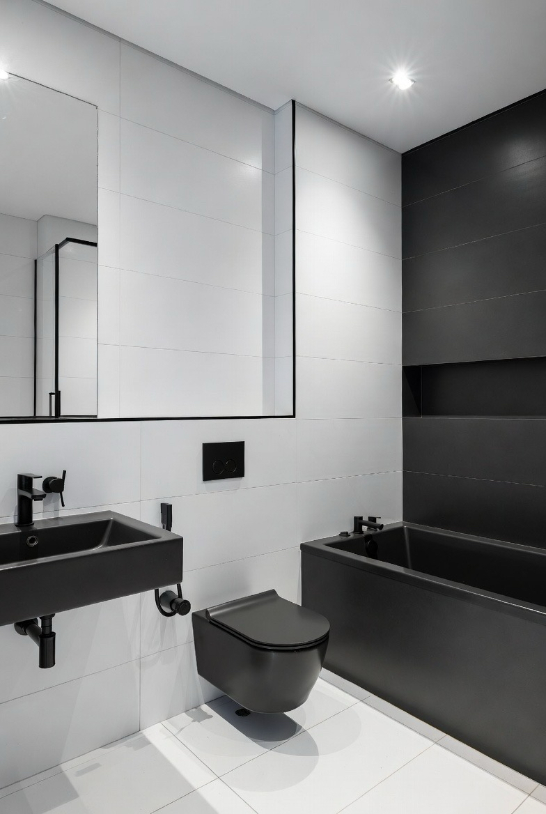A black-and-white color scheme delivers instant sophistication. Glossy tiles, matte black fixtures, and clean geometric lines create a bold yet balanced look. This modern bathroom style feels fresh, graphic, and timeless. Strategic lighting softens the contrast, ensuring the space feels inviting rather than stark. It’s an ideal choice for homeowners who love modern elegance with a dramatic edge.