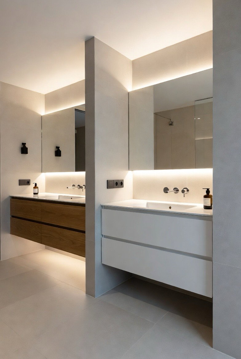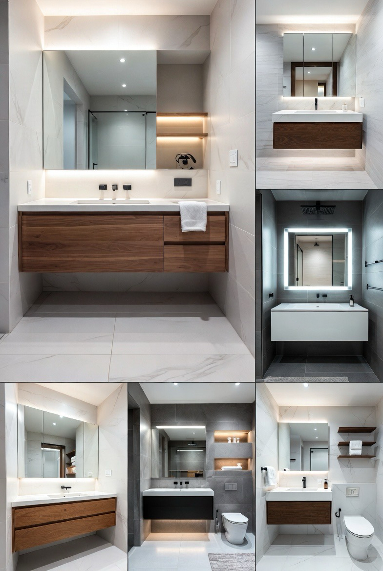 Floating vanities are a signature feature of modern bathrooms. They create visual space, improve flow, and add a sleek, contemporary feel. Paired with under-cabinet lighting, the effect is both stylish and practical. Choose wood finishes for warmth or glossy surfaces for a more refined look. This design works beautifully in both small and large bathrooms.