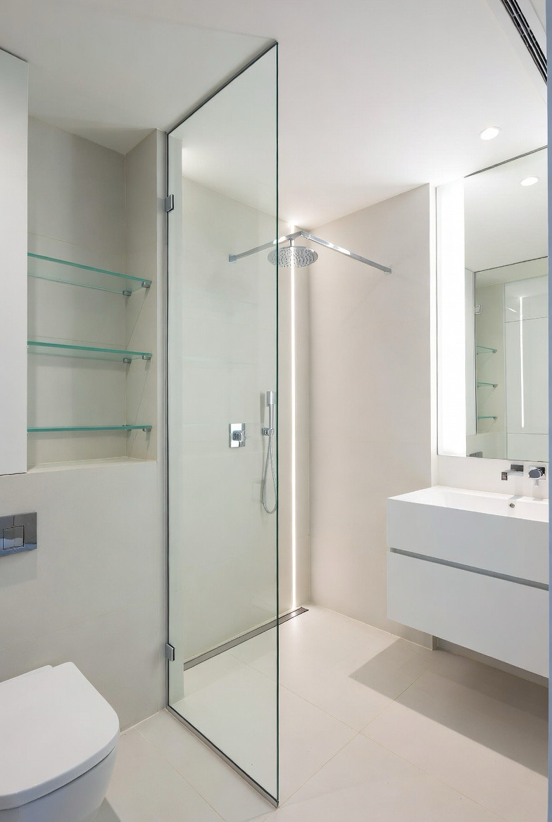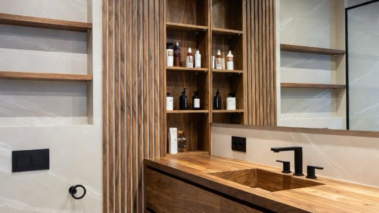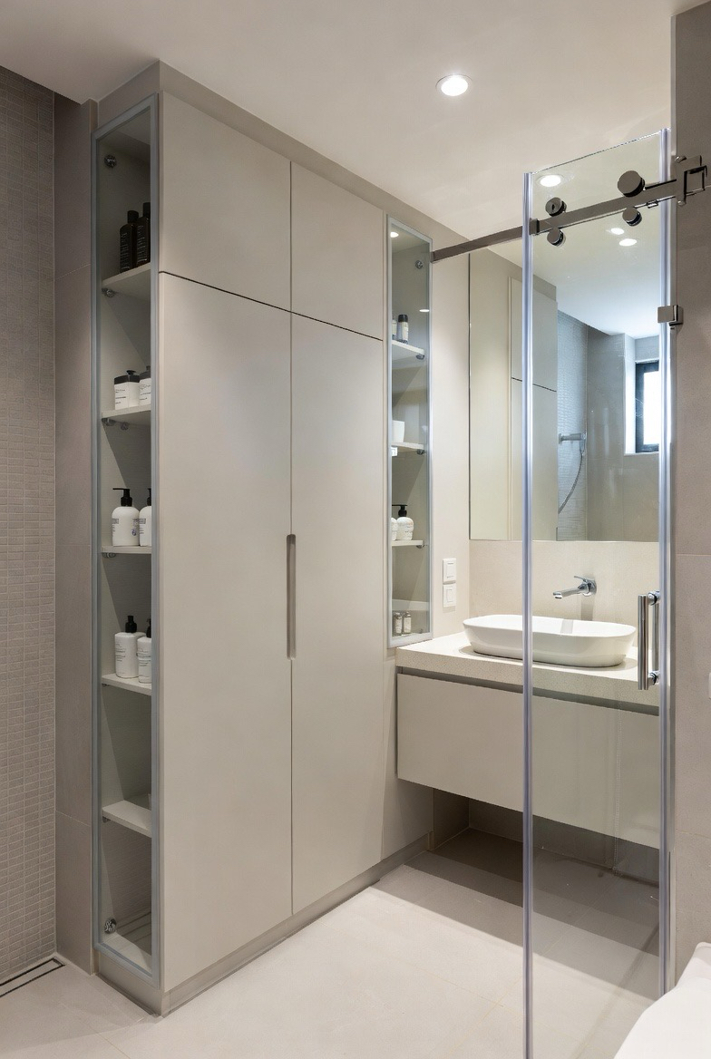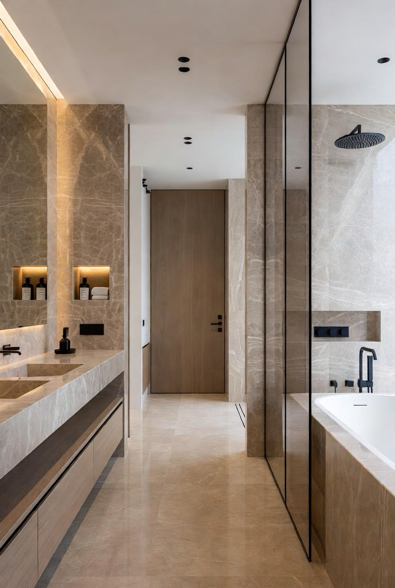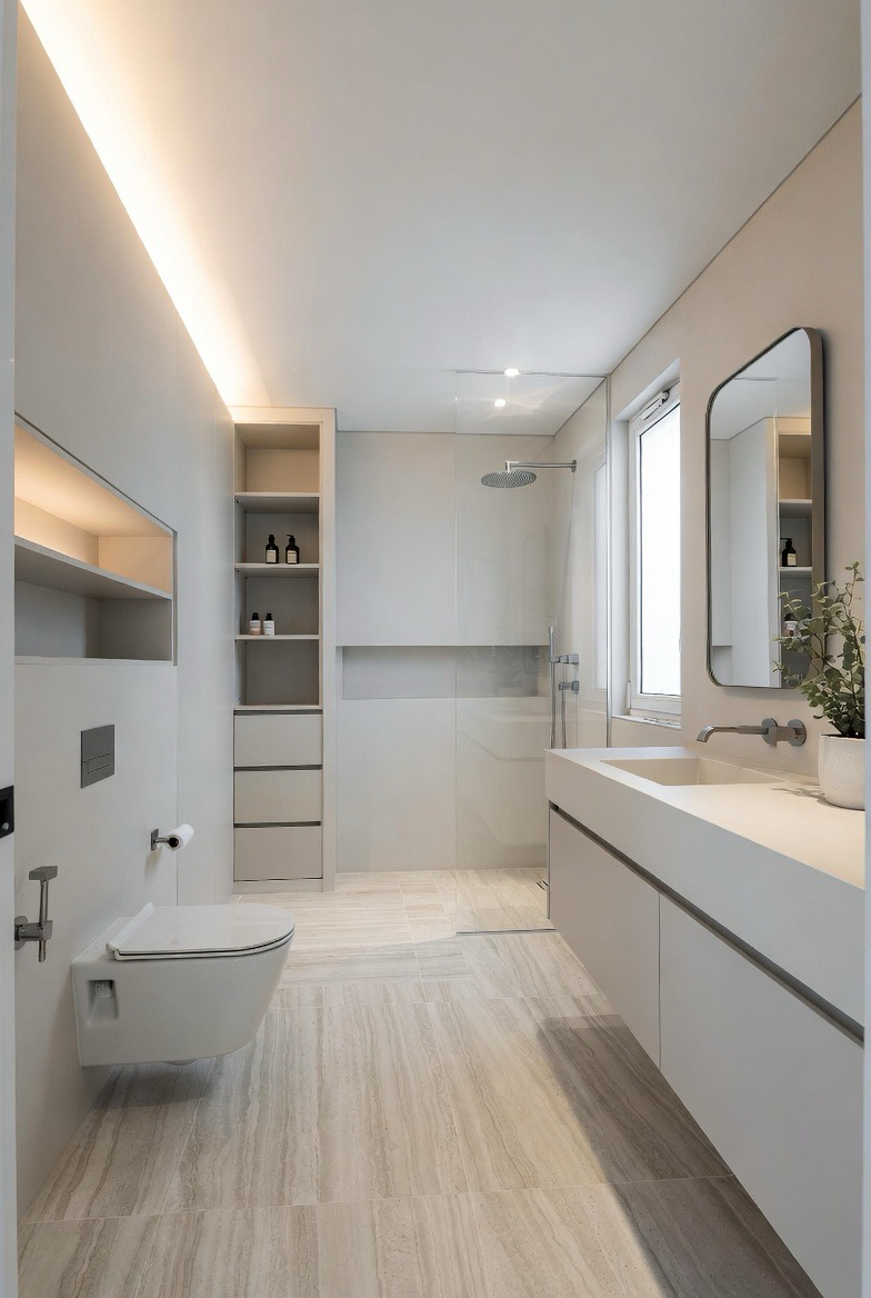 Hidden and integrated storage keeps modern bathrooms clutter-free. Built-in shelves, recessed cabinets, and sleek drawers maintain clean lines. This design prioritizes both aesthetics and functionality, creating a polished, organized space that feels luxurious and efficient.