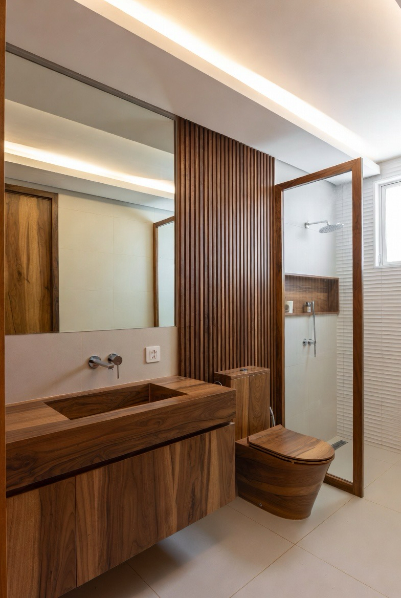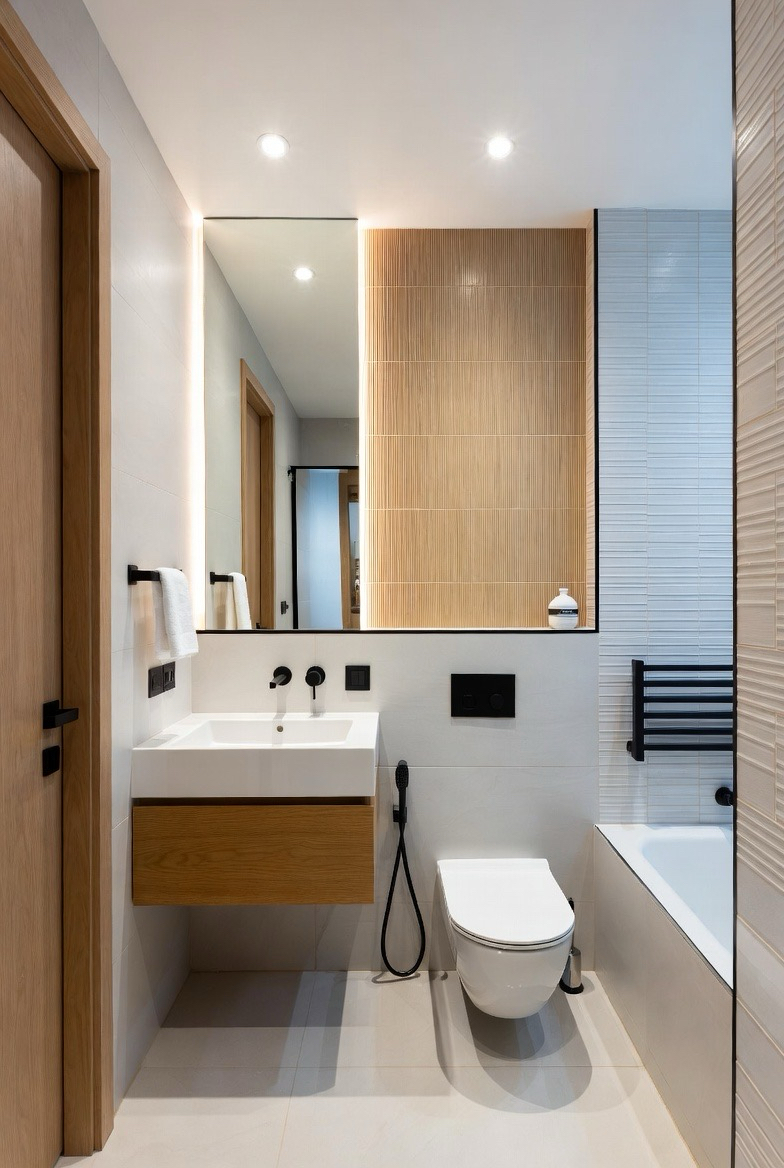 Wood accents soften modern bathrooms and add warmth. Wooden vanities, slatted walls, or shelving pair beautifully with neutral tiles and matte finishes. This design creates a cozy yet contemporary feel, perfect for those who want modern style without a cold aesthetic. The contrast between natural textures and sleek surfaces keeps the space visually engaging.