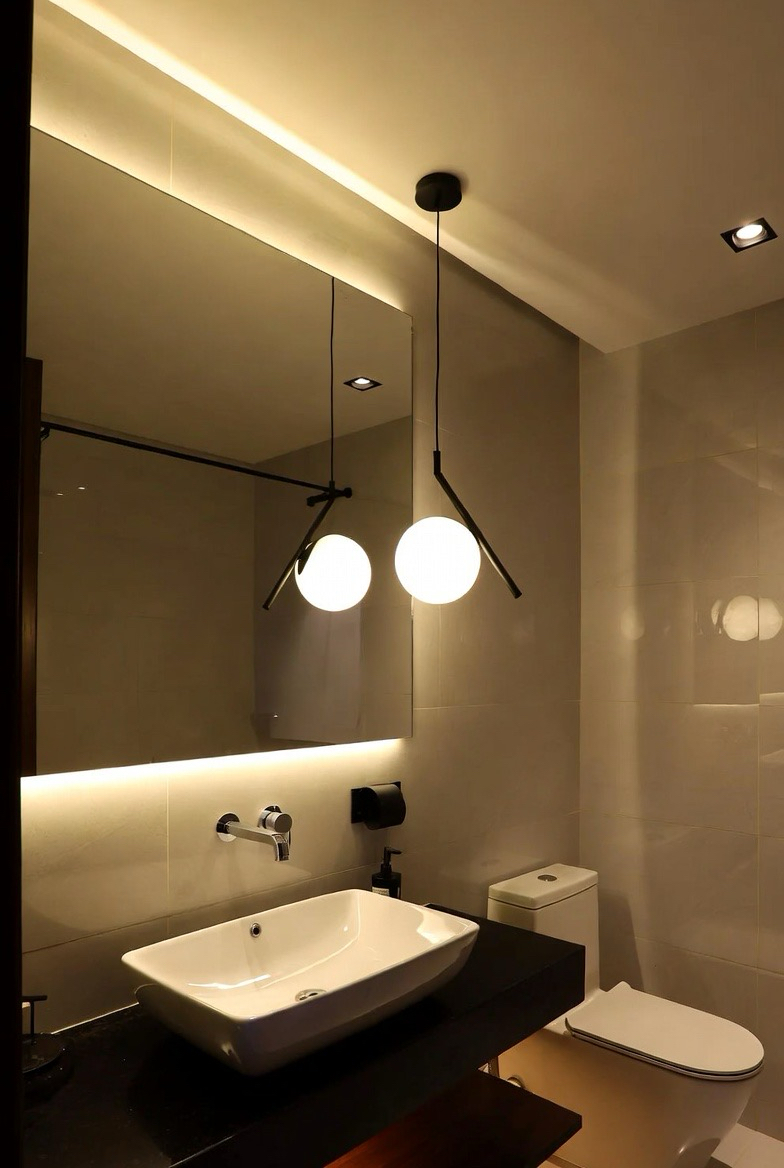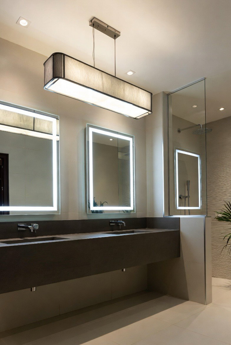 Lighting plays a key role in modern bathroom design. Statement pendant lights, LED mirrors, or recessed lighting elevate both function and style. Well-placed lighting enhances textures, highlights architectural details, and sets a relaxing mood. This design choice transforms the bathroom into a polished, luxurious space with minimal effort.