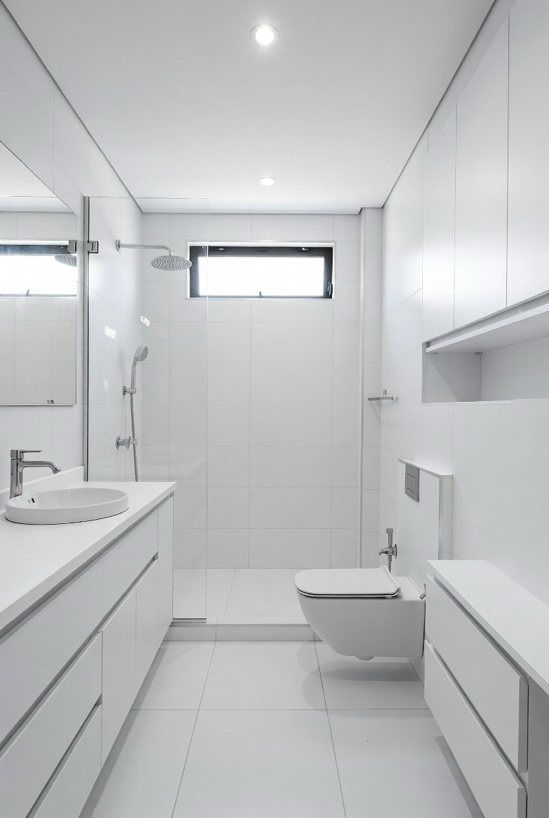 All-white bathrooms feel fresh, bright, and timeless. Sleek cabinetry, glossy tiles, and modern fixtures enhance the minimalist appeal. This design maximizes light and makes even small bathrooms feel spacious. Adding subtle contrast through fixtures or textures keeps the space from feeling flat.