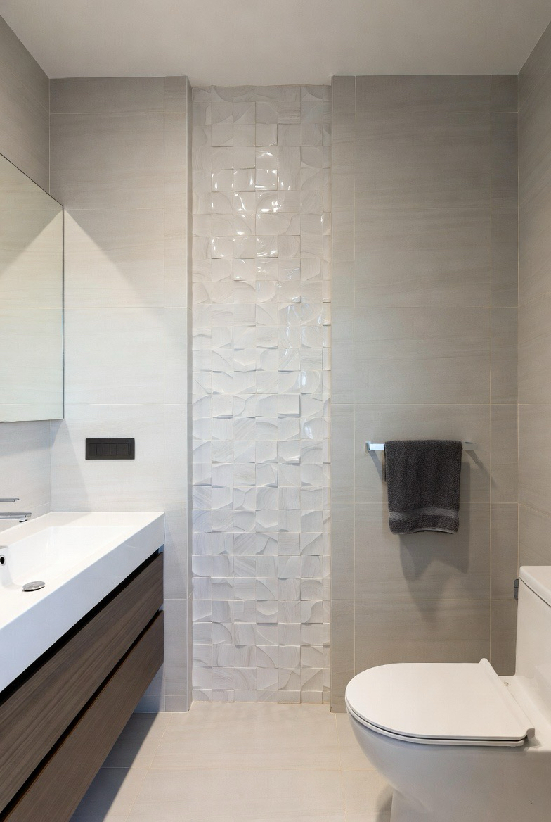 An accent wall adds personality while maintaining a modern aesthetic. Whether tiled, textured, or subtly patterned, it draws the eye without overpowering the space. This design choice adds visual interest and depth to a clean, contemporary bathroom.