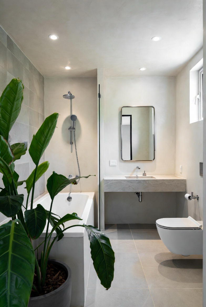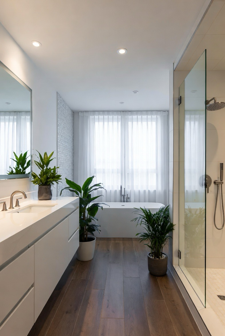 Greenery brings life and freshness to modern bathrooms. Plants soften clean lines and add a natural touch. Paired with neutral finishes and modern fixtures, greenery enhances the spa-like feel and completes the luxurious, fresh aesthetic.
