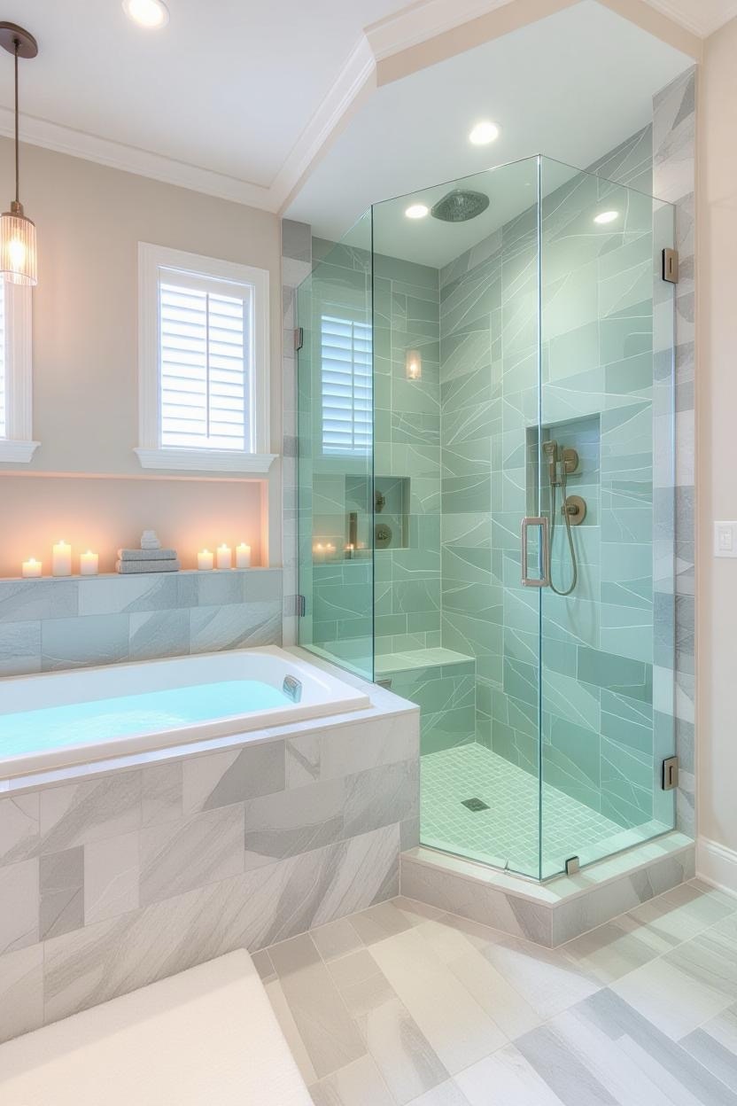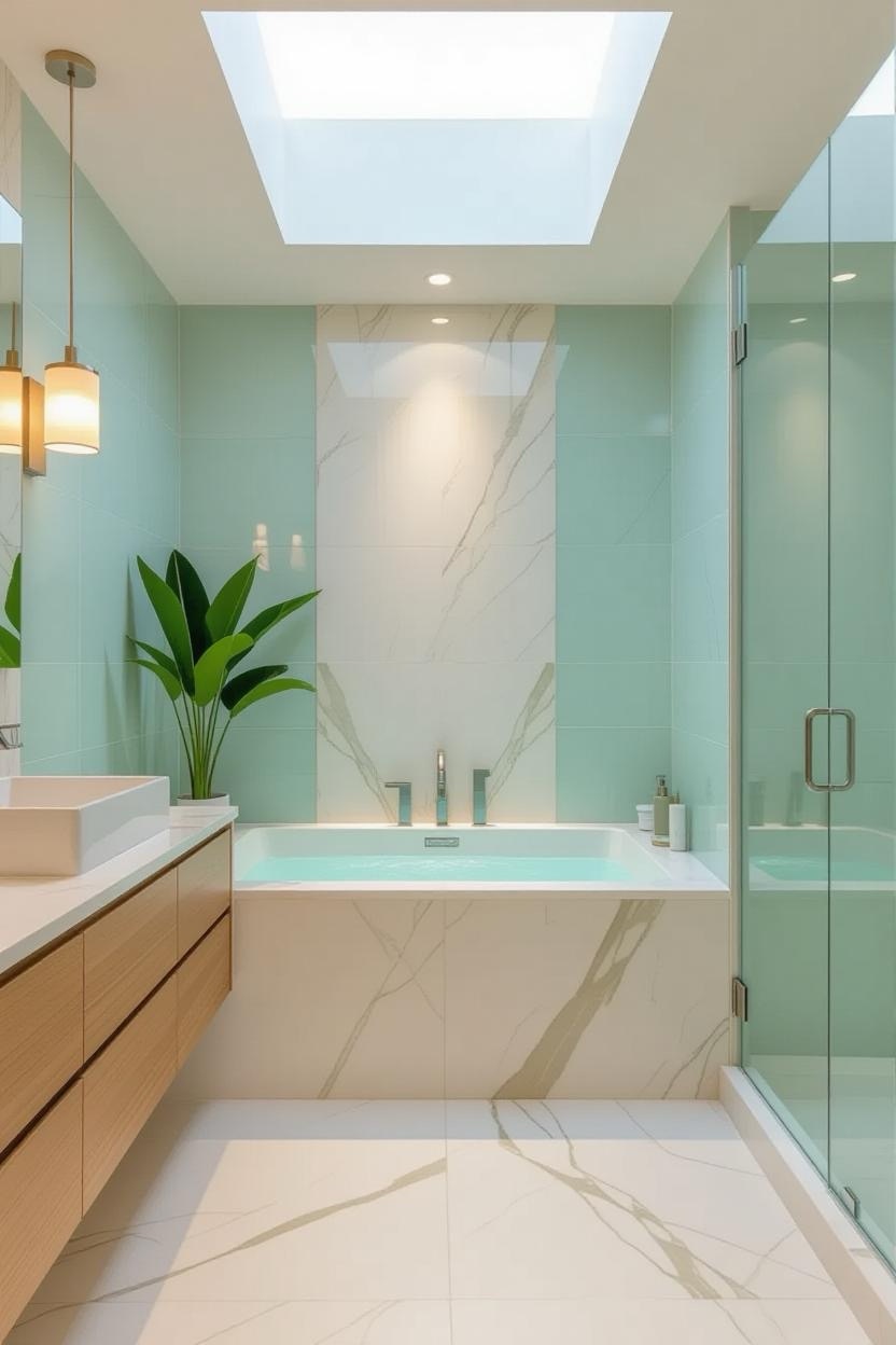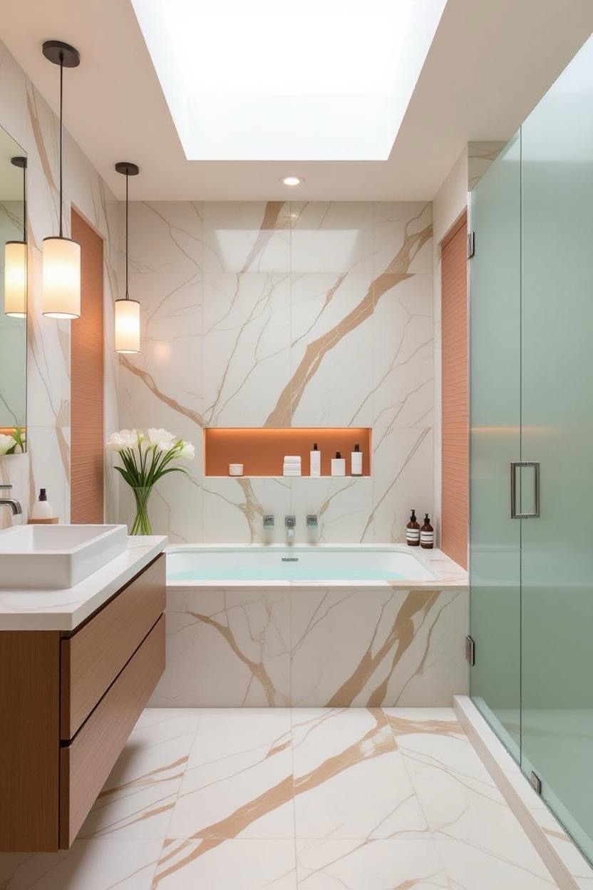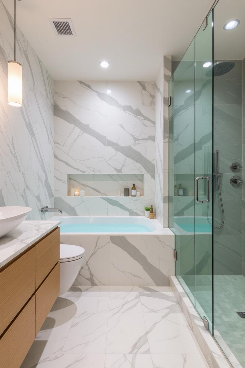 For a high-end spa-like look, combine marble tiles with sleek glass tiles. This mix of textures creates balance and elevates your bathroom with a luxurious, layered design.