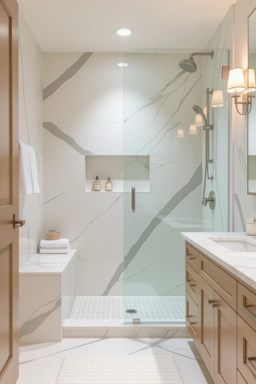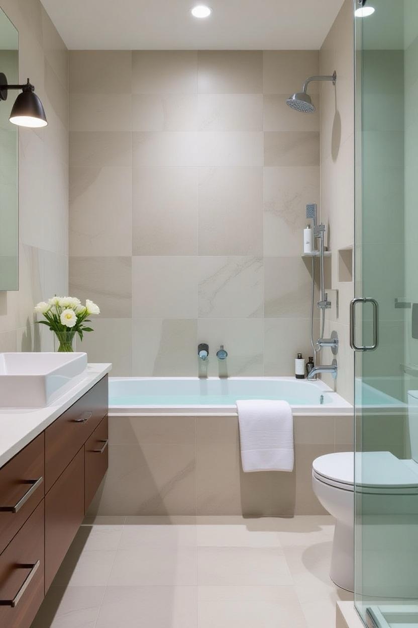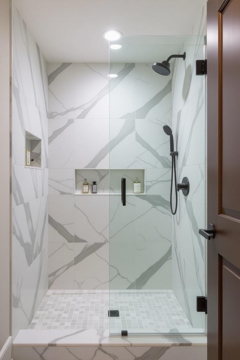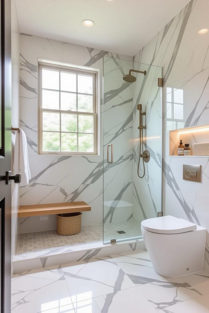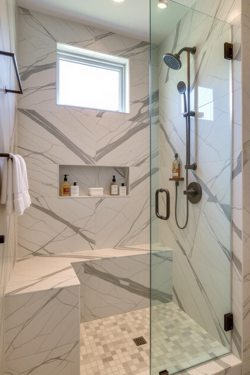 For a high-end spa-like look, combine marble tiles with sleek glass tiles. This mix of textures creates balance and elevates your bathroom with a luxurious, layered design.