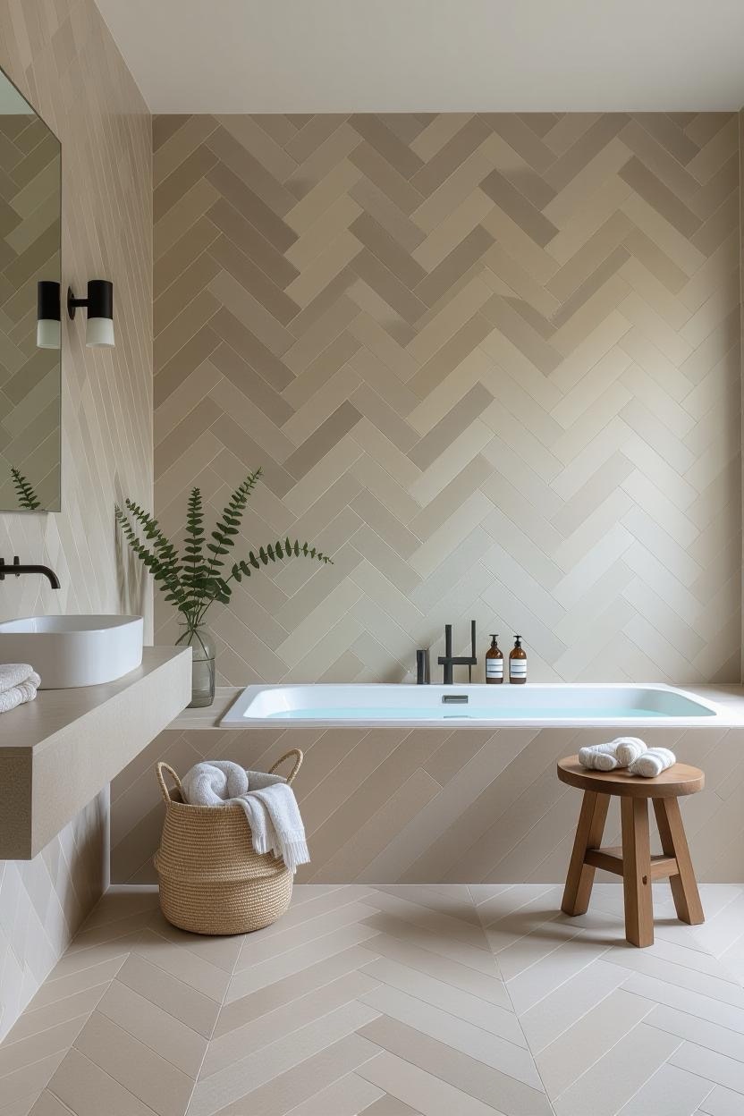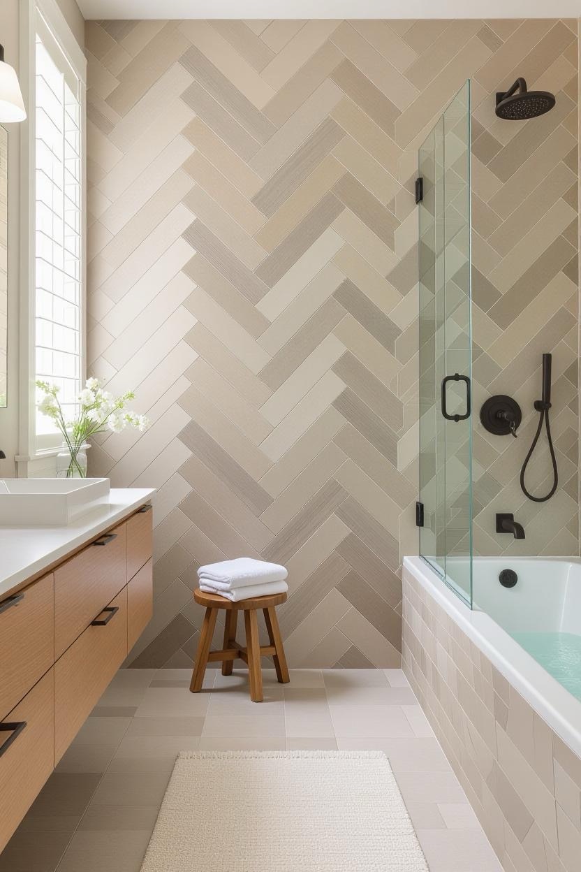 Arrange rectangular tiles in a herringbone pattern for a stylish, dynamic effect. This classic layout works beautifully in both neutral and bold colors, making your walls or floors pop.