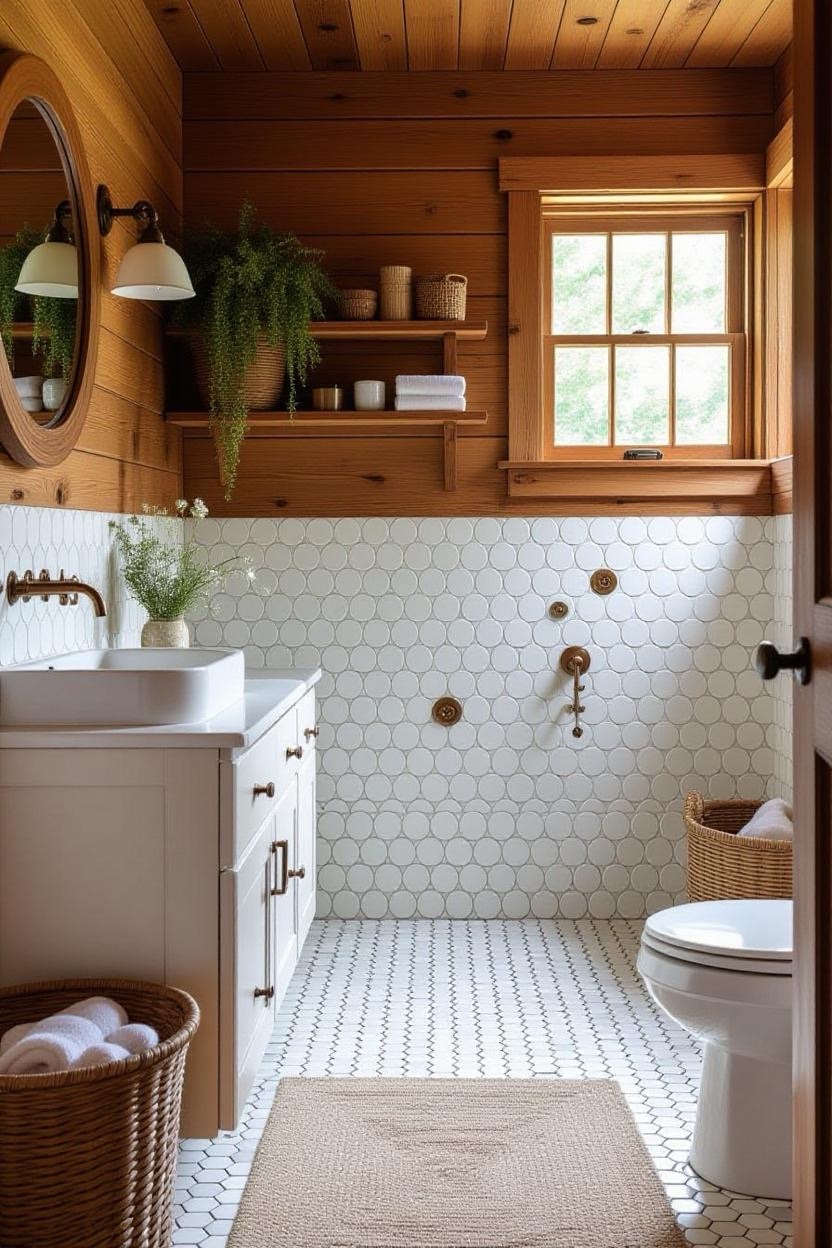 These tiny circular tiles bring retro flair to bathrooms. Popular in both classic white and playful colors, penny tiles are charming and versatile for floors or walls.