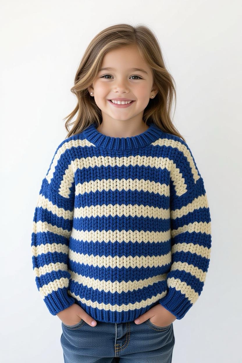 Bright, bold stripes bring energy and fun to this sweater pattern. Whether you use contrasting shades or a subtle pastel palette, the striped look never goes out of style.