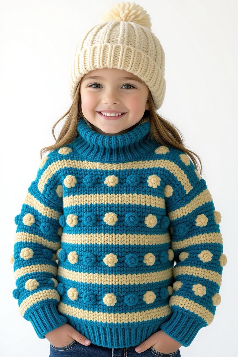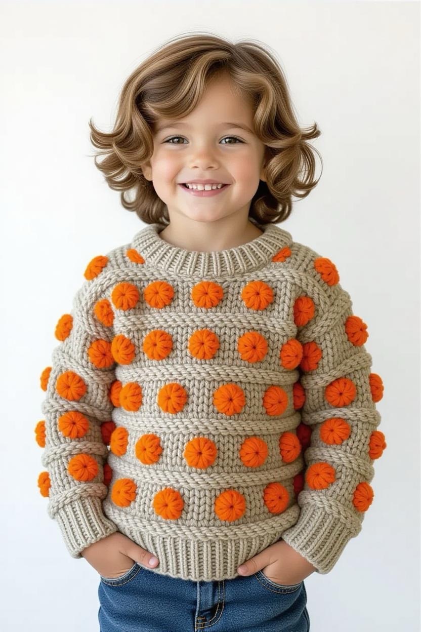 Add playful texture with bobble stitches throughout the sweater. The raised stitches create a fun, tactile surface that kids will love wearing.