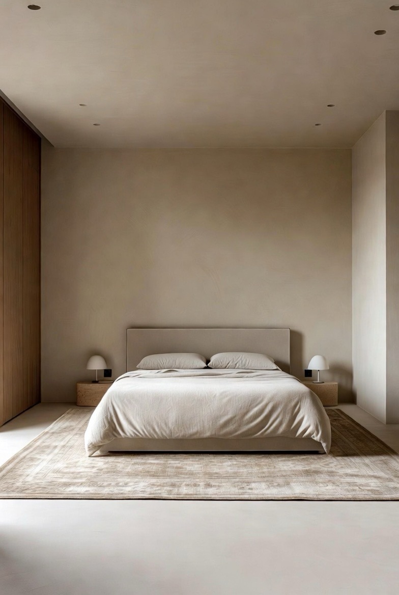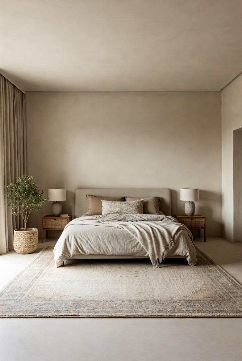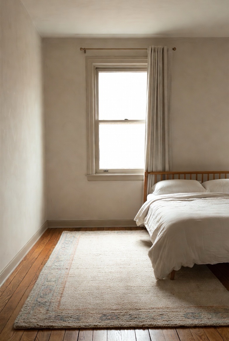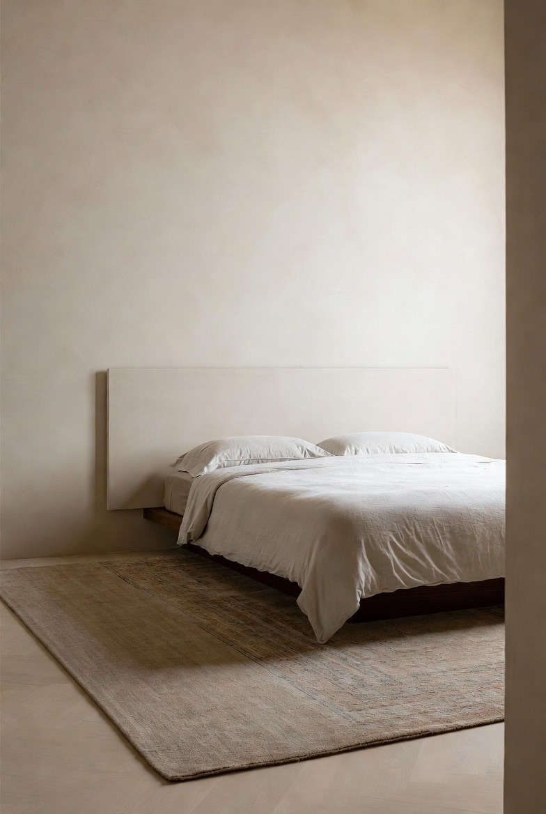 A large neutral rug adds warmth and texture without introducing visual noise. Choose rugs with subtle patterns or solid colors to maintain simplicity. Placing a rug under the bed helps anchor the room and make it feel more cohesive. It also adds comfort underfoot, making the bedroom cozy while keeping the minimalist style intact.