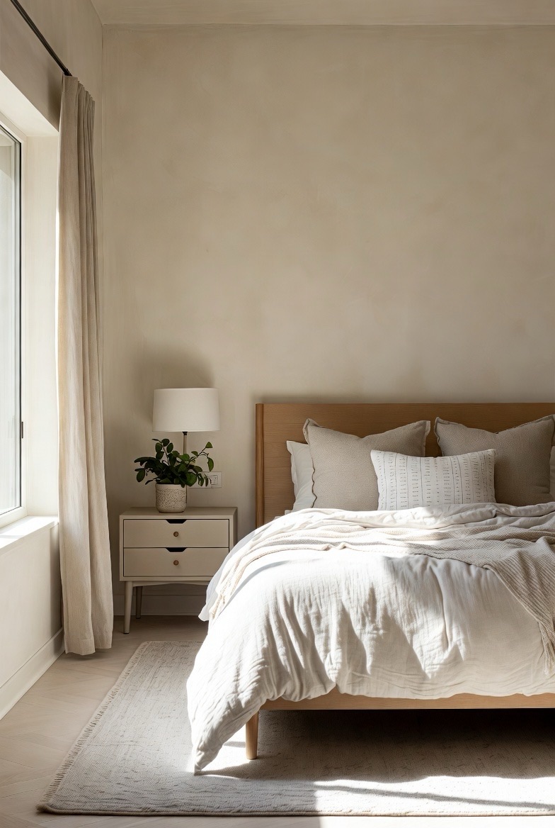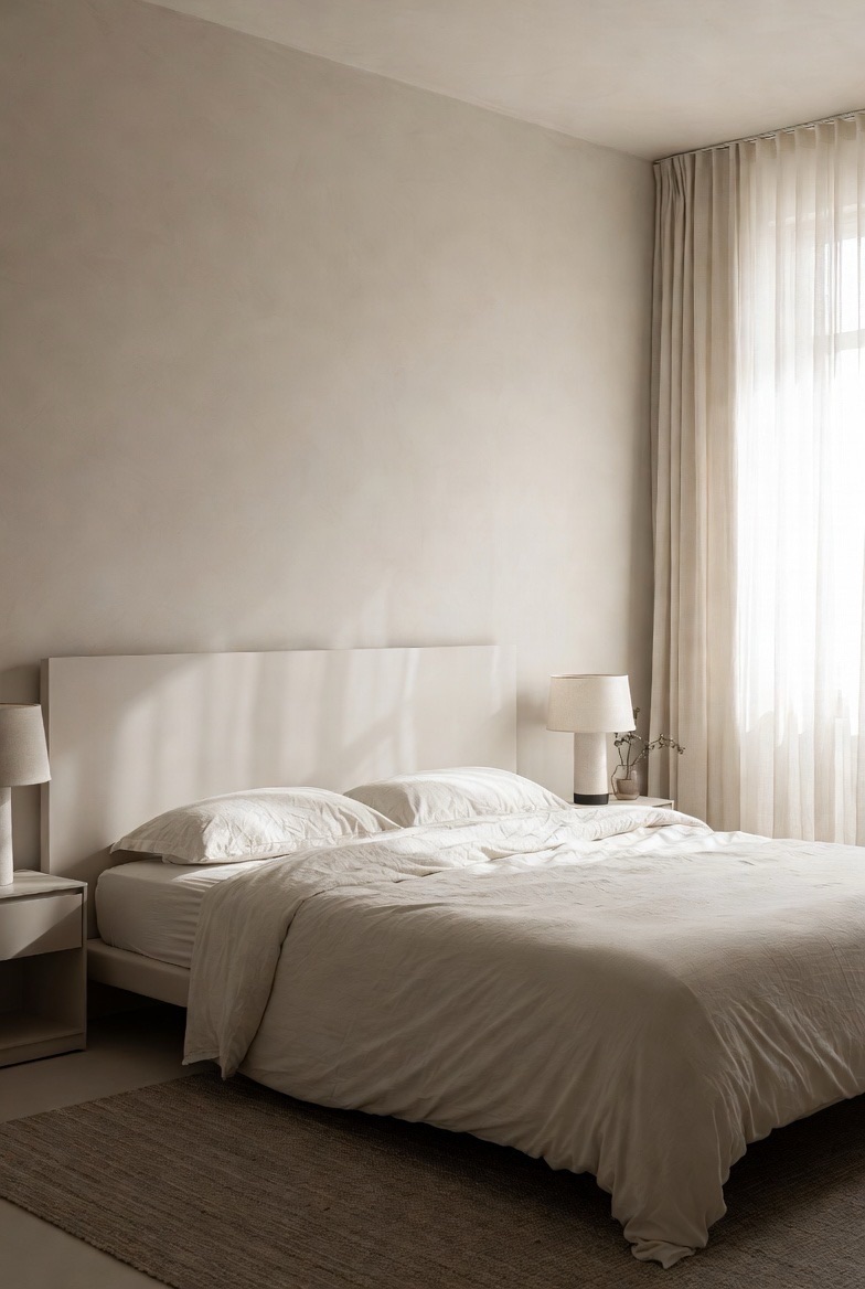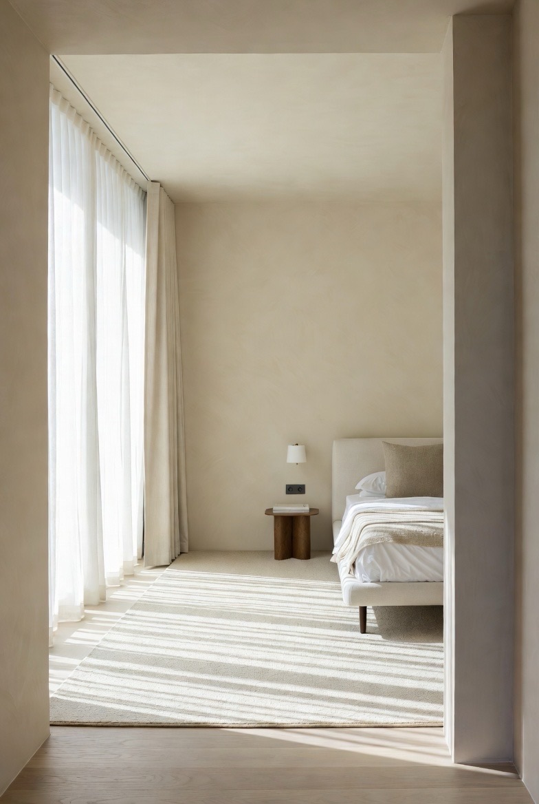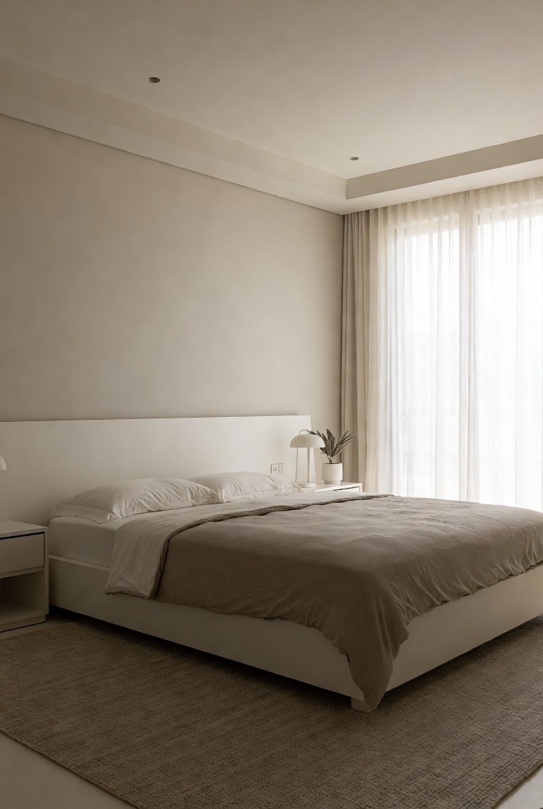 A large neutral rug adds warmth and texture without introducing visual noise. Choose rugs with subtle patterns or solid colors to maintain simplicity. Placing a rug under the bed helps anchor the room and make it feel more cohesive. It also adds comfort underfoot, making the bedroom cozy while keeping the minimalist style intact.