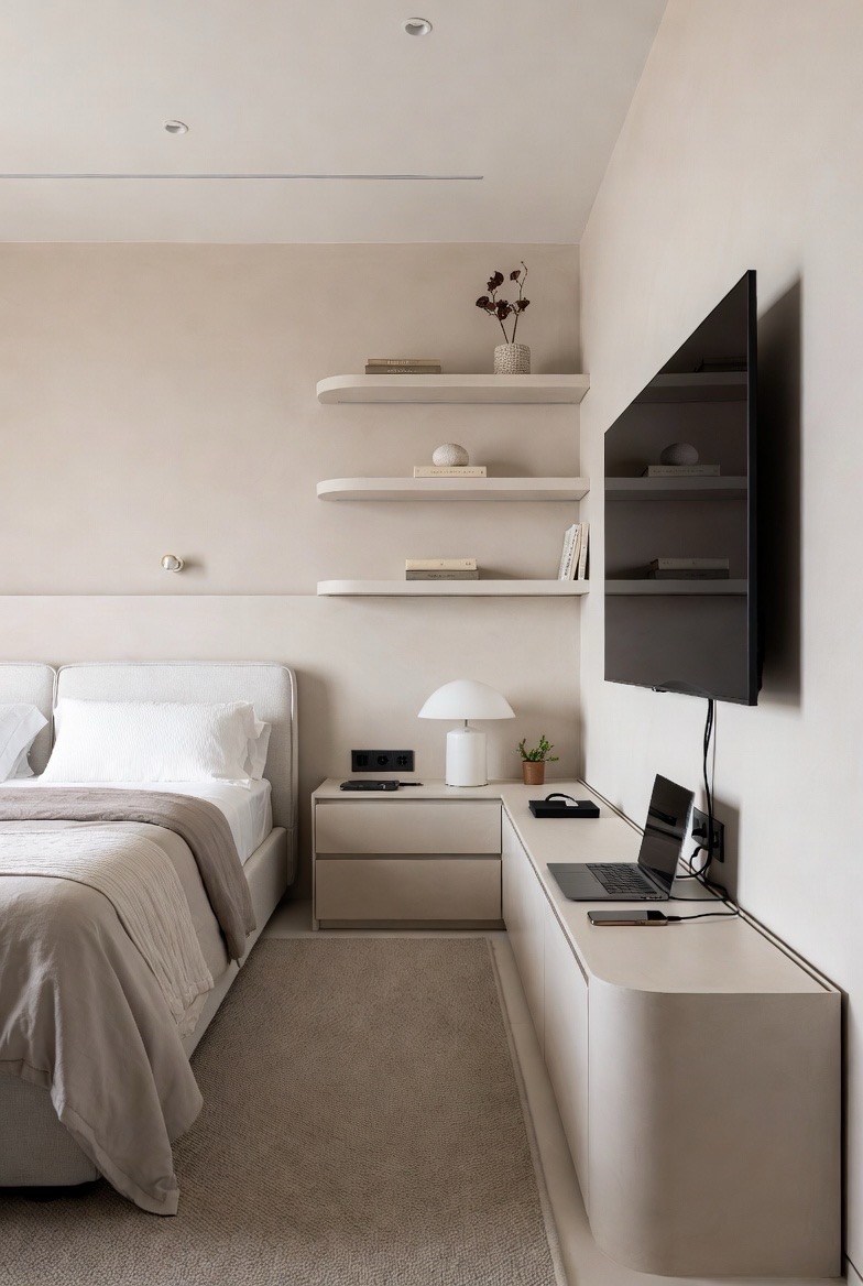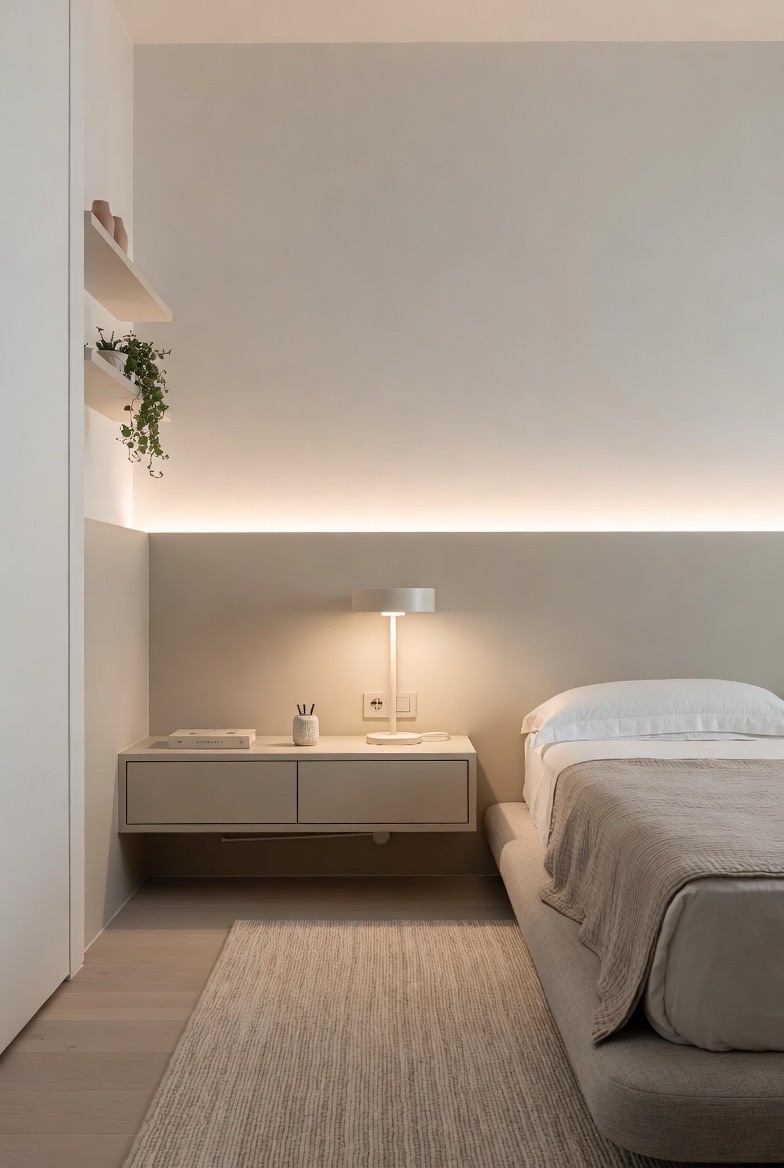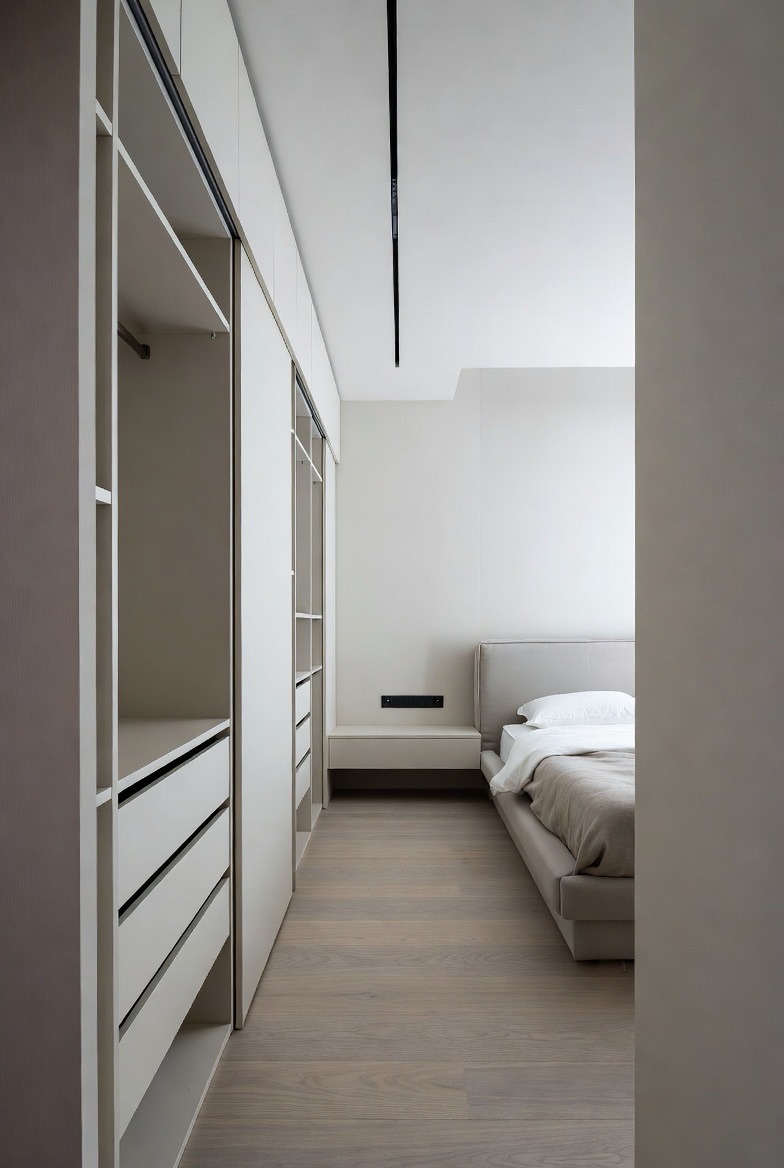 Built-in storage keeps clutter concealed while maintaining a clean design flow. Floor-to-ceiling wardrobes, integrated shelves, and hidden compartments offer practical organization without interrupting the minimalist vibe. This approach maximizes storage without adding extra furniture, helping small rooms feel more spacious. The result is a seamless, clutter-free environment that supports relaxation.