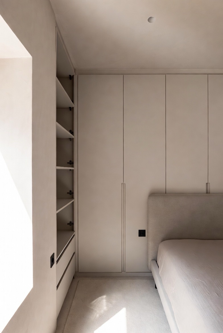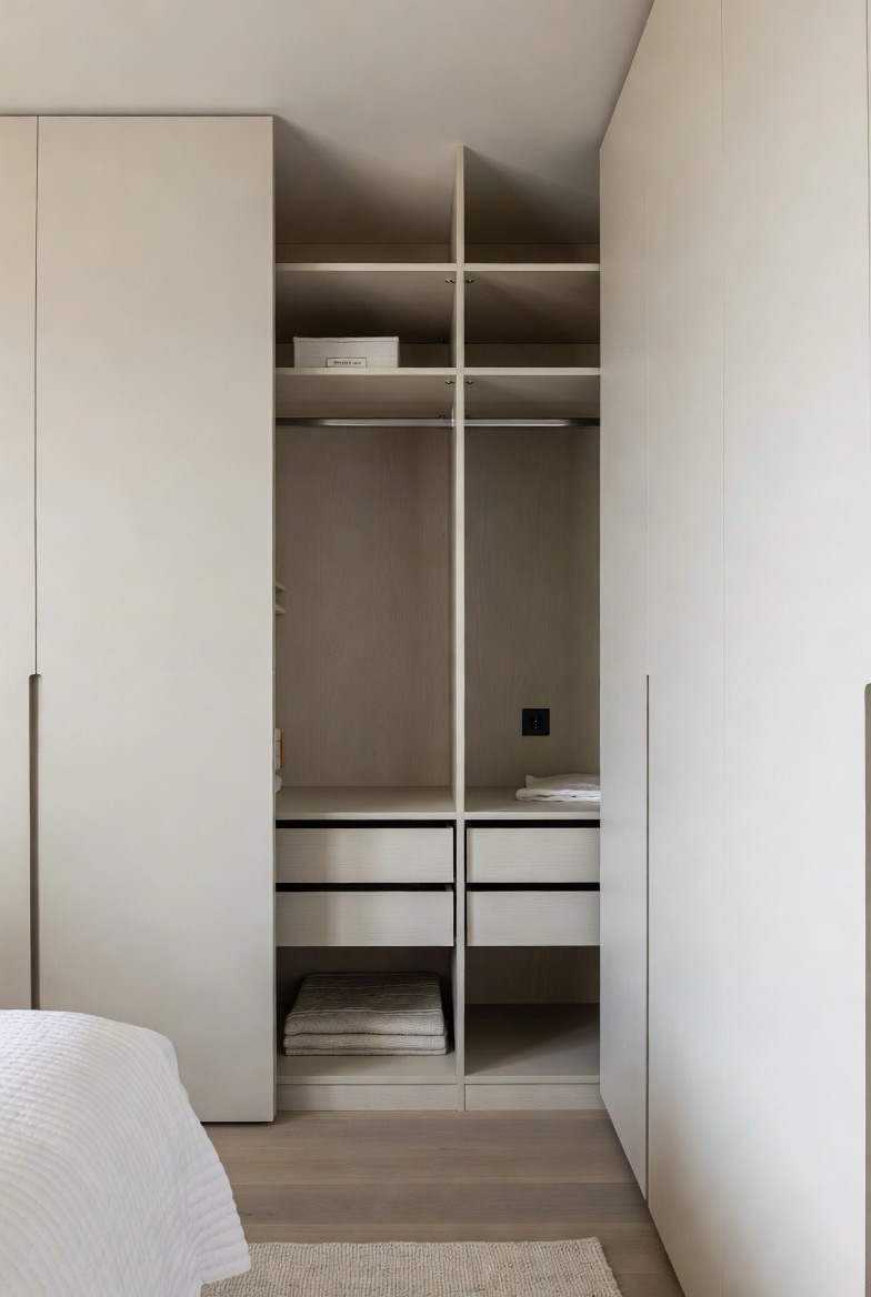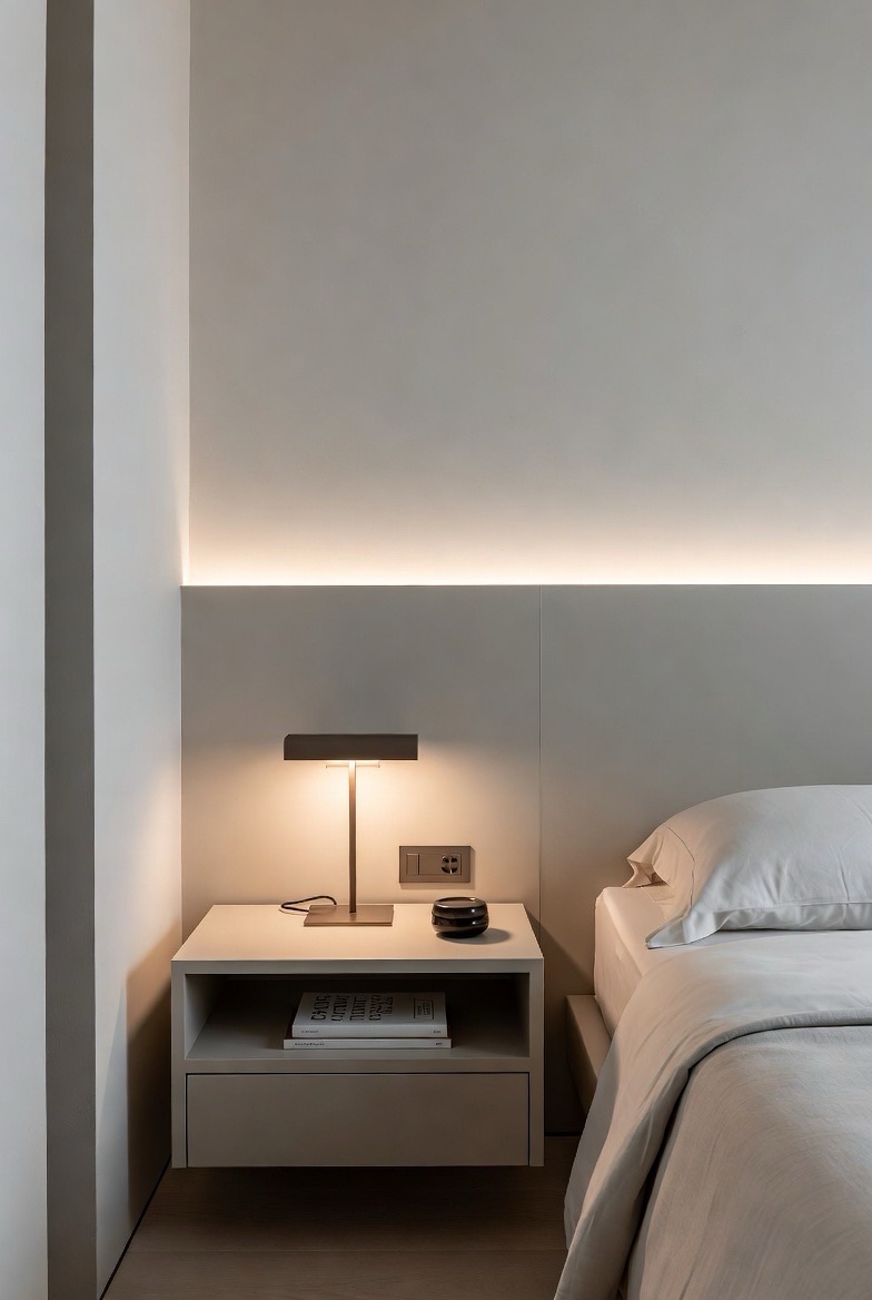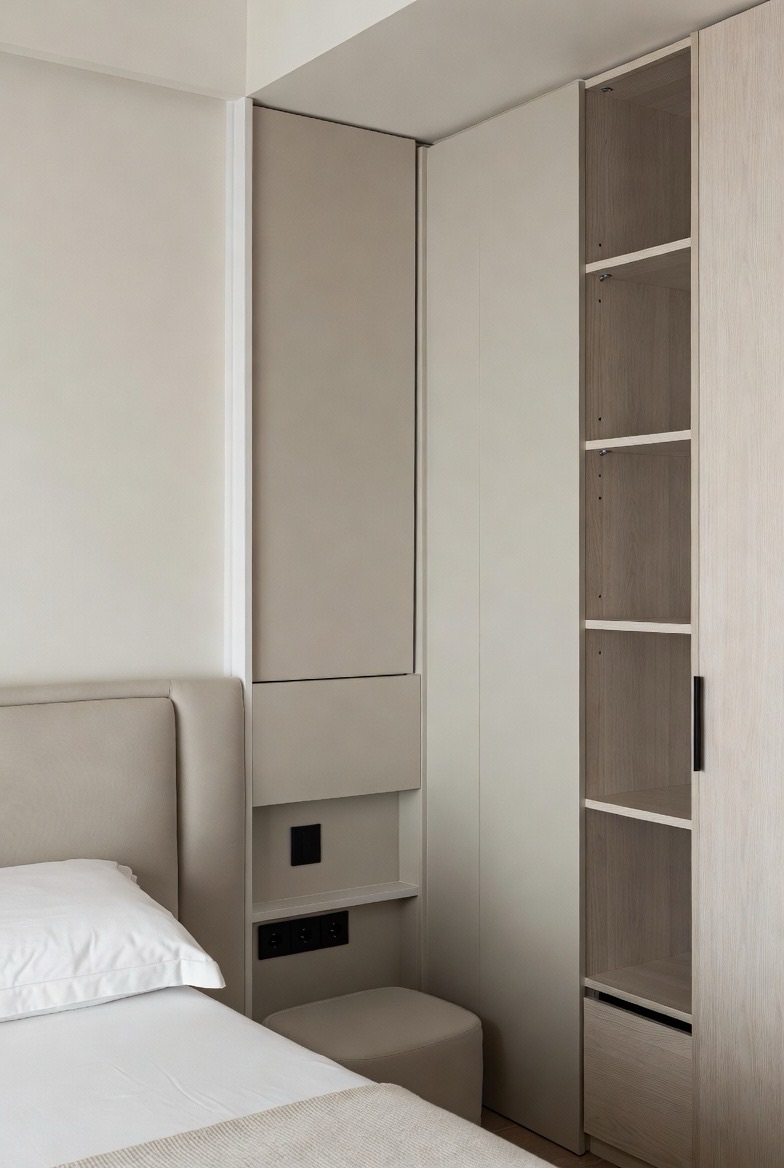 Built-in storage keeps clutter concealed while maintaining a clean design flow. Floor-to-ceiling wardrobes, integrated shelves, and hidden compartments offer practical organization without interrupting the minimalist vibe. This approach maximizes storage without adding extra furniture, helping small rooms feel more spacious. The result is a seamless, clutter-free environment that supports relaxation.