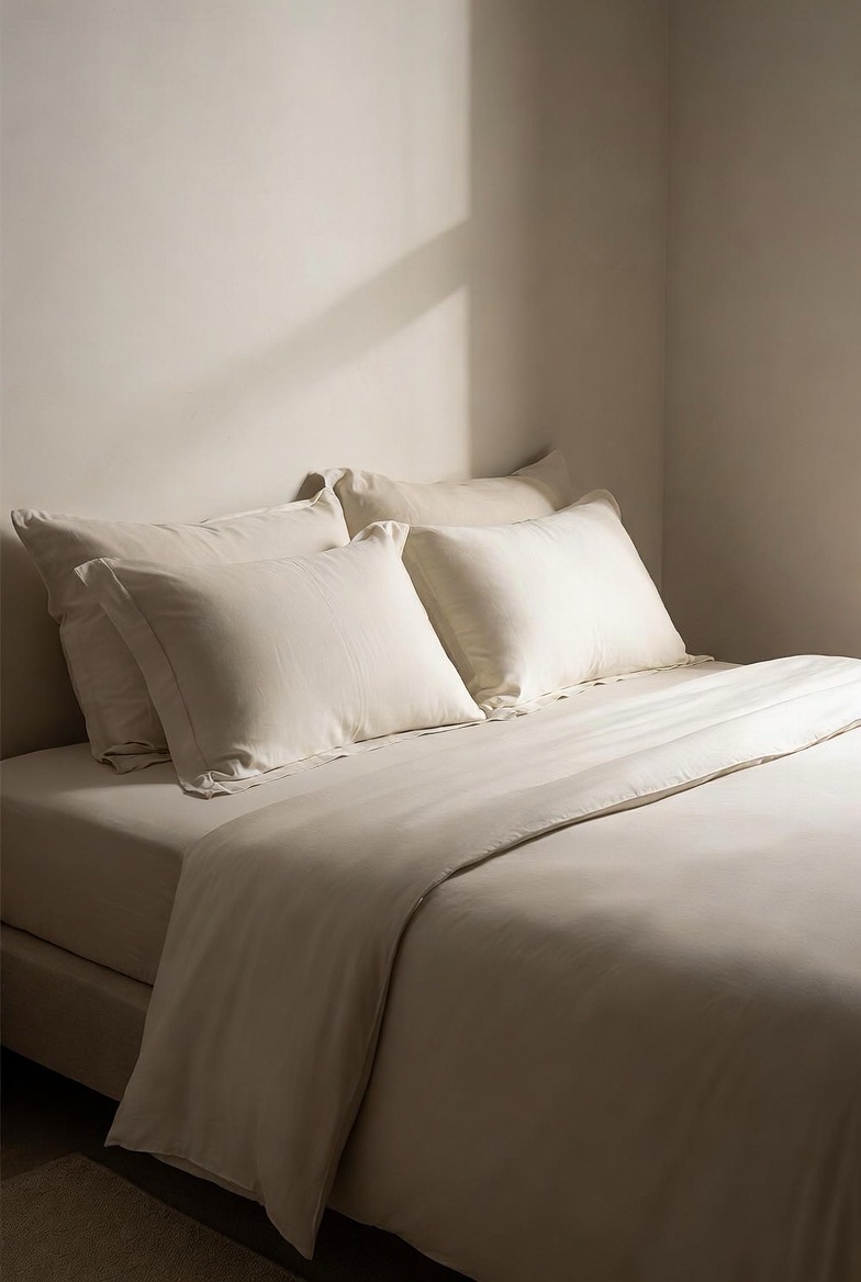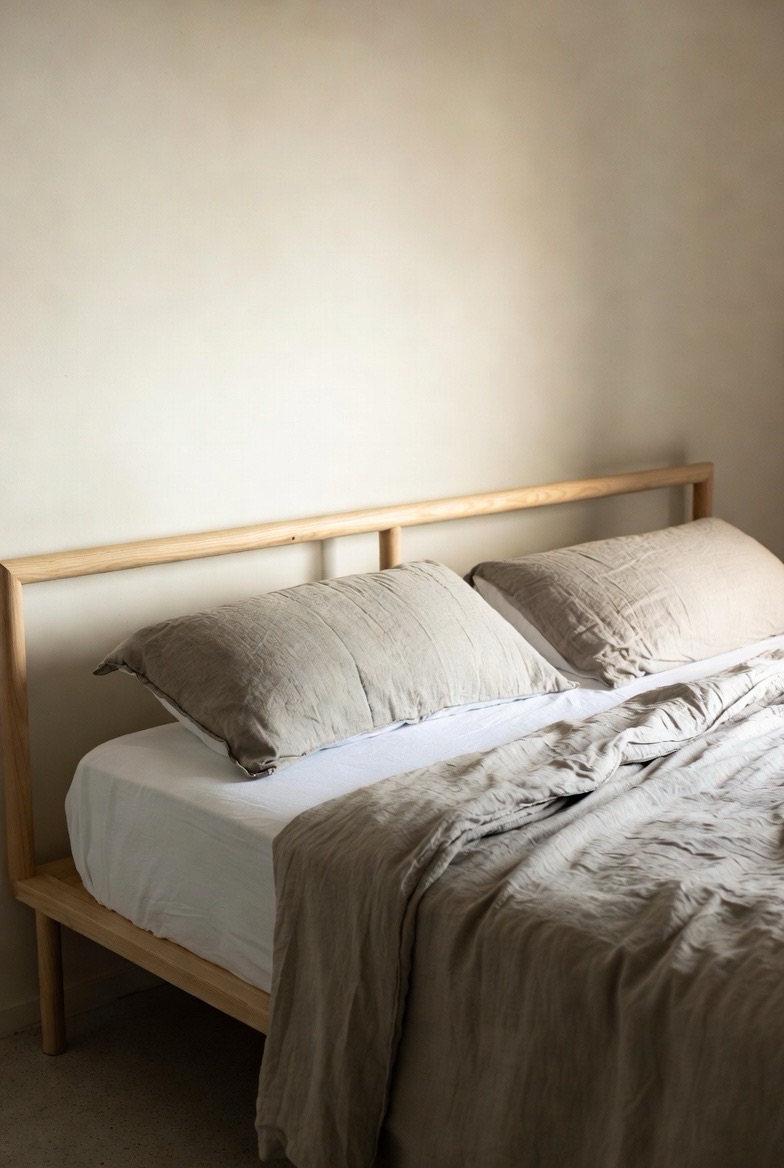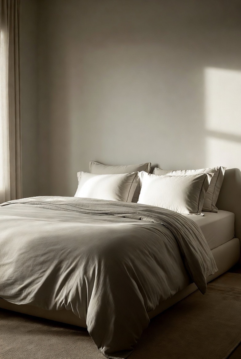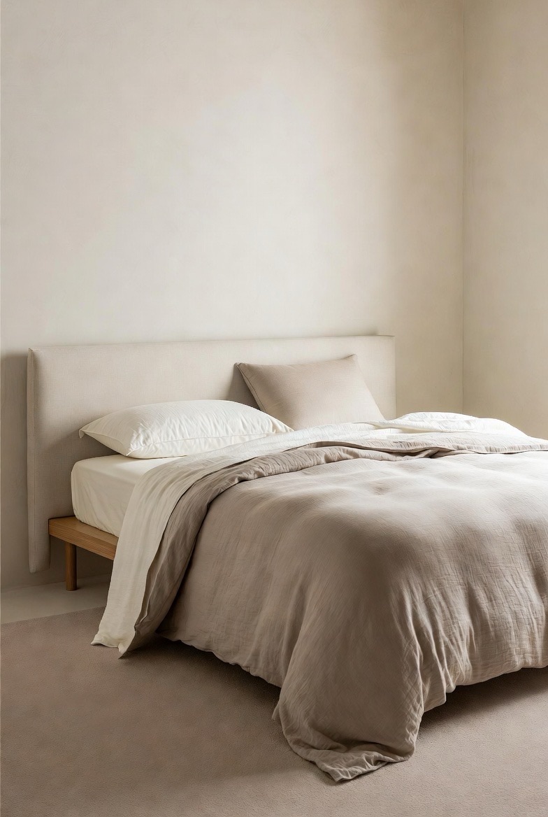 Minimalism doesn’t mean sacrificing comfort. Choose crisp, high-quality bedding made from cotton or linen in neutral shades. Keep the layers simple, a fitted sheet, duvet, and a couple of pillows are enough for a polished look. The gentle textures and breathable fabrics create a cozy, inviting bed without overwhelming the space. This balance results in a bedroom that feels both serene and luxuriously restful.