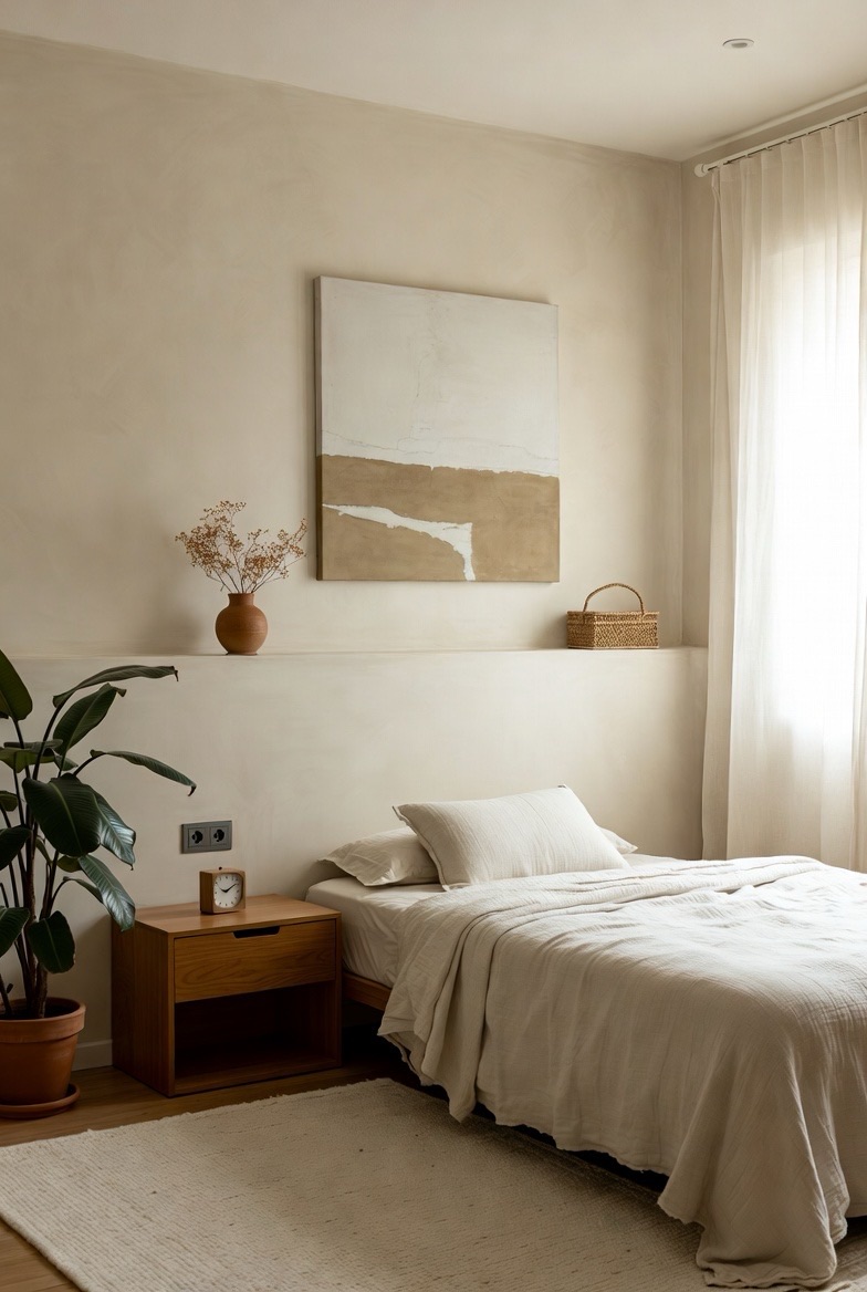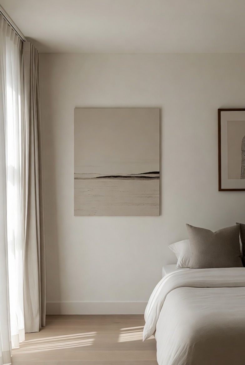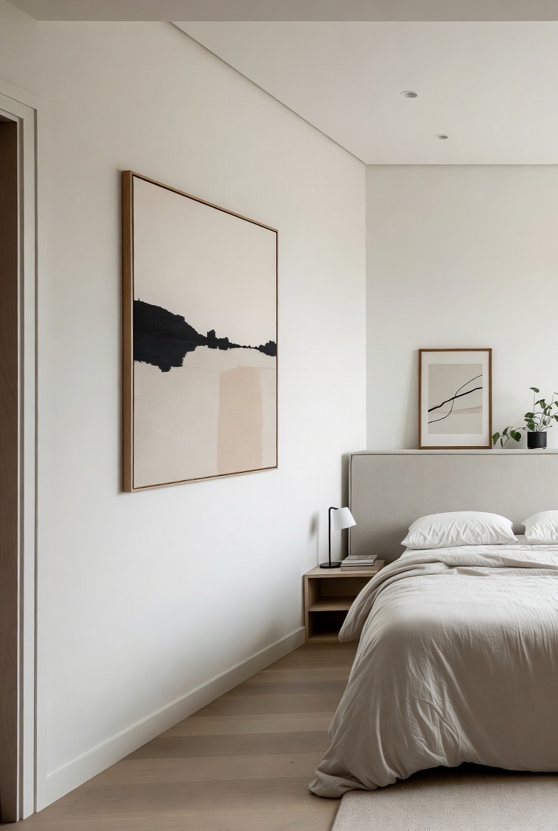 Minimalist bedrooms benefit from carefully chosen wall decor. A single large artwork, a simple framed print, or a neutral textured piece can add personality without overwhelming the space. Opt for calming visuals that complement your palette. Alternatively, leave some walls bare to embrace the pure minimalist approach. The absence of visual clutter helps create a clean, balanced atmosphere.