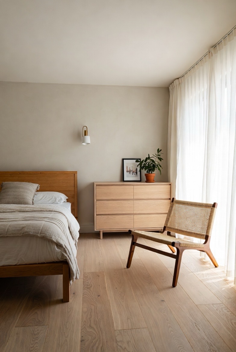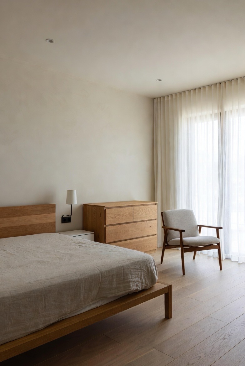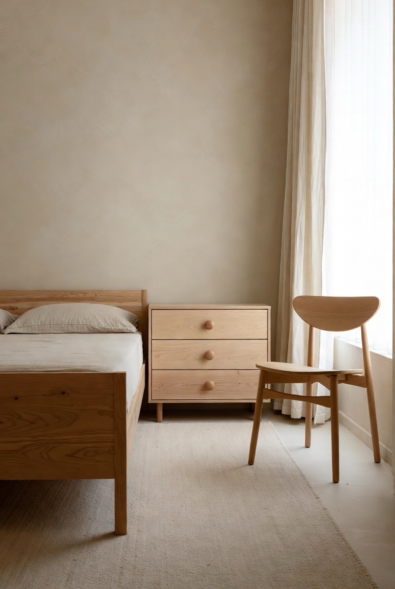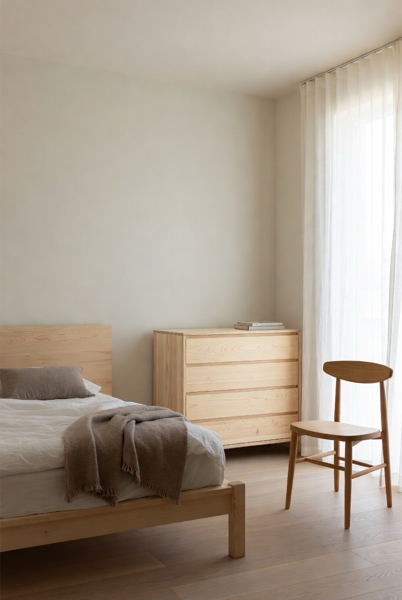 Adding natural wood elements helps soften the minimalist space. A wooden bed frame, dresser, or accent chair introduces warmth without disrupting the clean aesthetic. Light woods like oak or birch work especially well in minimalist settings. The organic texture and subtle grain patterns bring a grounding touch that balances simplicity with comfort.