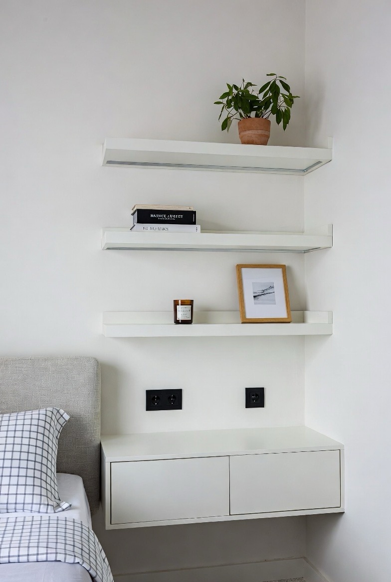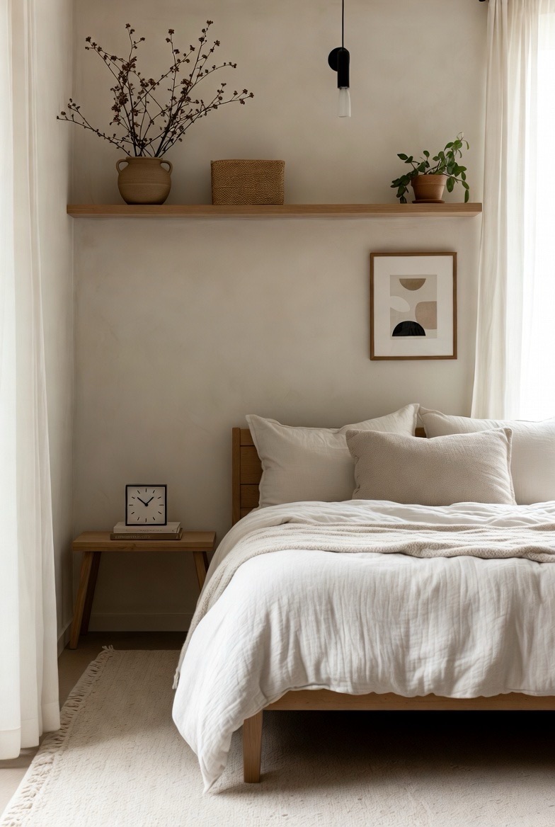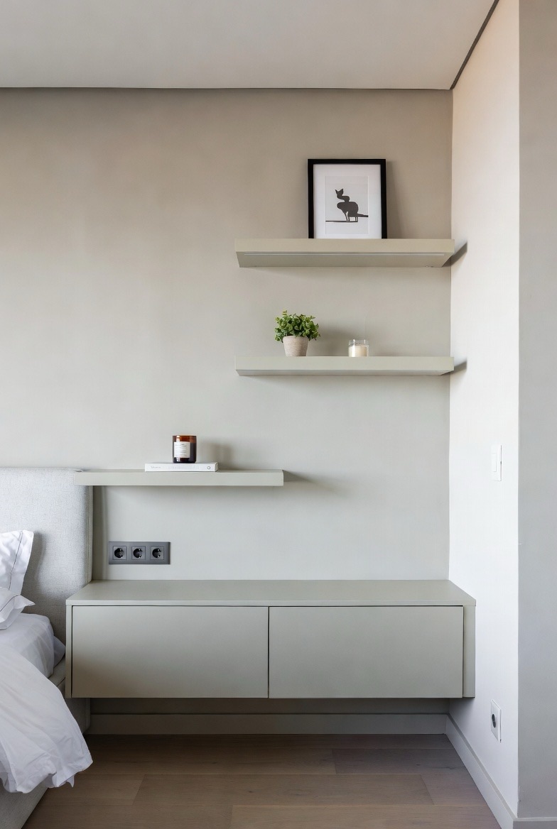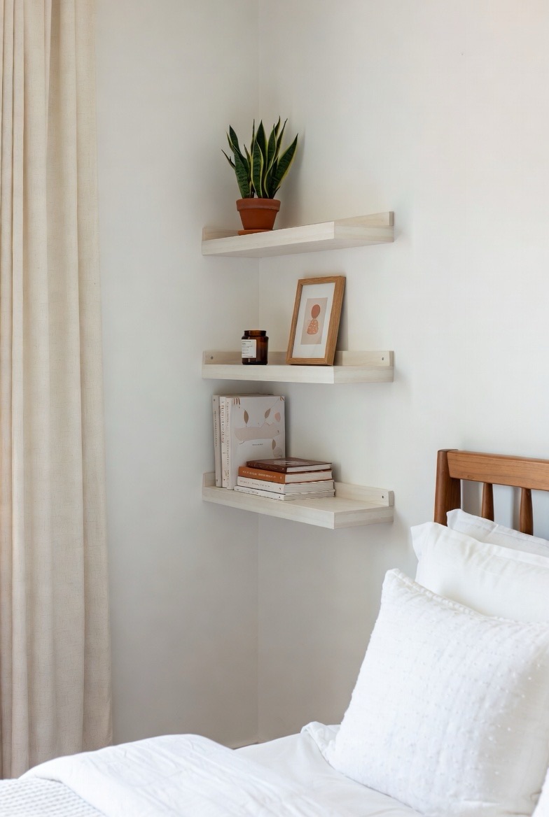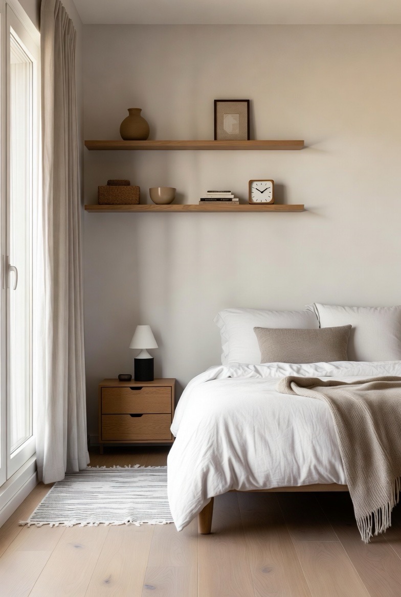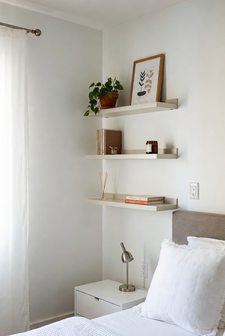 Floating shelves provide storage and display space while maintaining an airy feel. Use them to showcase a few meaningful items, a plant, candle, or small artwork, while avoiding clutter. Their sleek design keeps the room visually light and tidy. Floating shelves are especially helpful in smaller bedrooms where floor space is limited.